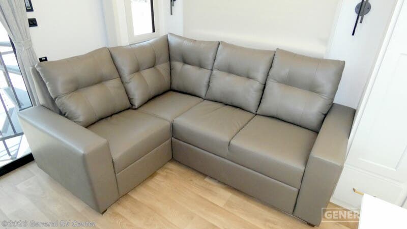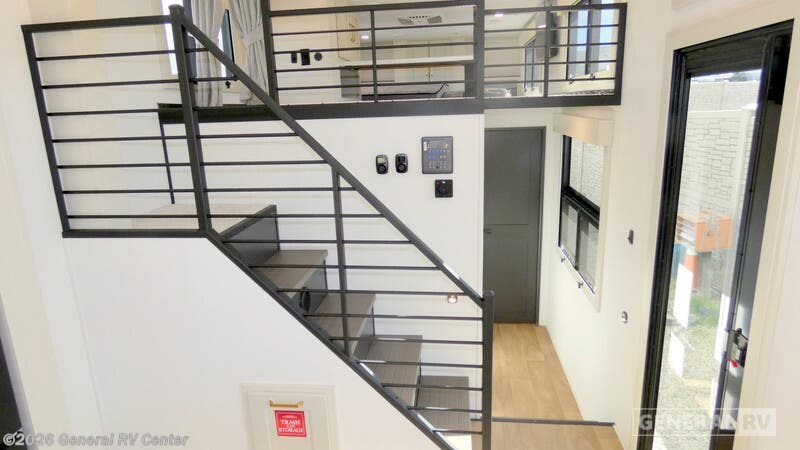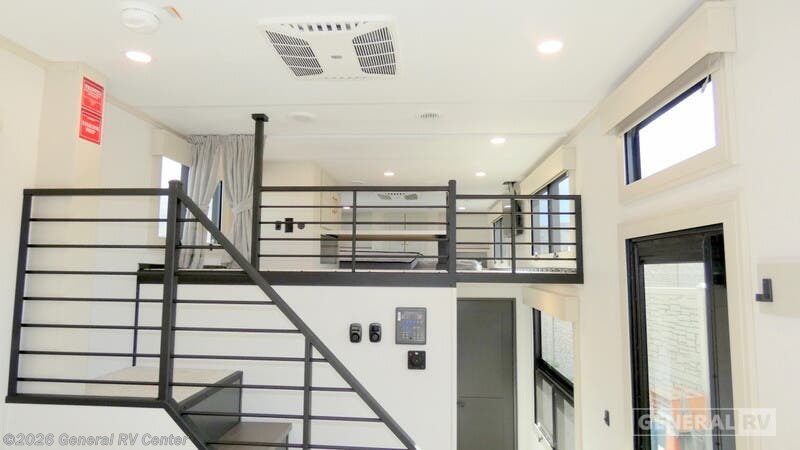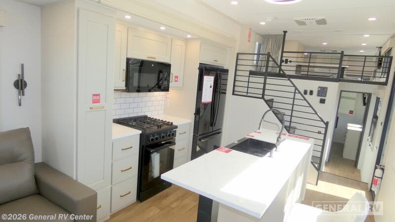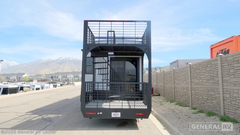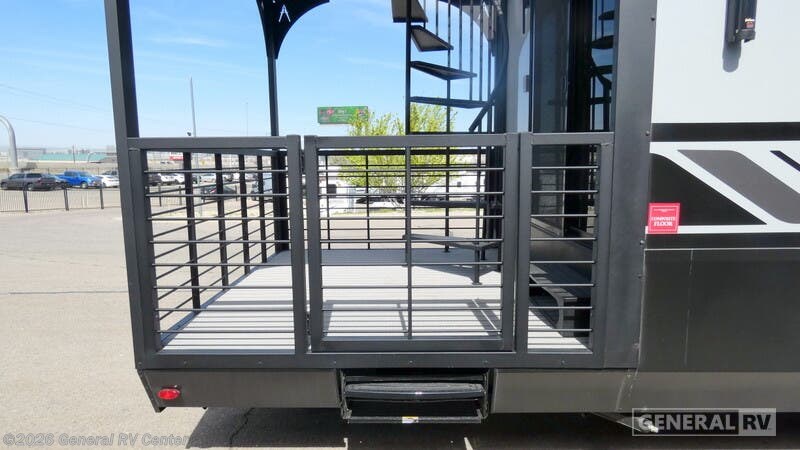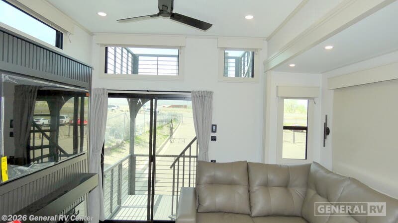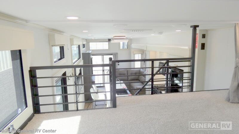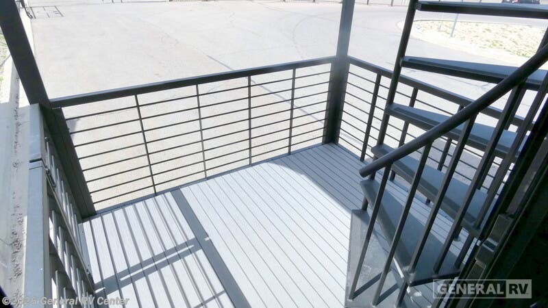 **Grand Design Foundation destination trailer 42GD highlights:** - Lofted Deck - Large Kitchen Island - King Bed Slide Out - Two Awnings - Loft with Queen-Size Sleeping Pad You'll fall in love with this spacious destination trailer that can sleep six each night! With dual entry doors, you can enter in through the rear deck that includes a lower level for gathering, and an observation deck to take in the stars! The other entry door leads into the combined kitchen and living room that includes a spacious kitchen island with a dishwasher, a pull-out pantry, an 18.6 cu. ft. refrigerator and an L-shaped sofa with a trundle bed. There is also an entertainment wall with smart storage and sliding doors that go out to the rear deck. A set of stairs leads to the loft with a queen-size sleeping pad, ample storage space, plus a table with a foot nook so you can put the table away when not in use. Back downstairs, a full bath will let you freshen up each day and a front private bedroom with a king bed slide is sure to bring comfort. There is also storage space for your things, a telescoping TV, plus washer and dryer prep if you plan to add these appliances! With any Foundation destination trailer by Grand Design, you can choose to stay longer surrounded by residential inspired features! The durable construction includes aluminum framing with a temperature-controlled fiberglass laminated wall, composite exterior decking with waterproof woven vinyl flooring, quad seal protection, and an industry-leading maintenance-less one-piece roof with composite roof decking panels. There is also an exterior convenience center, brass plumbing fittings, an 8' 5" wide body frame, and sleek bonded square glass windows. The interior is packed with residential features, including GE appliances, motorized shades in the living room and kitchen, solid surface countertops in the kitchen and bath, and the list goes on!
