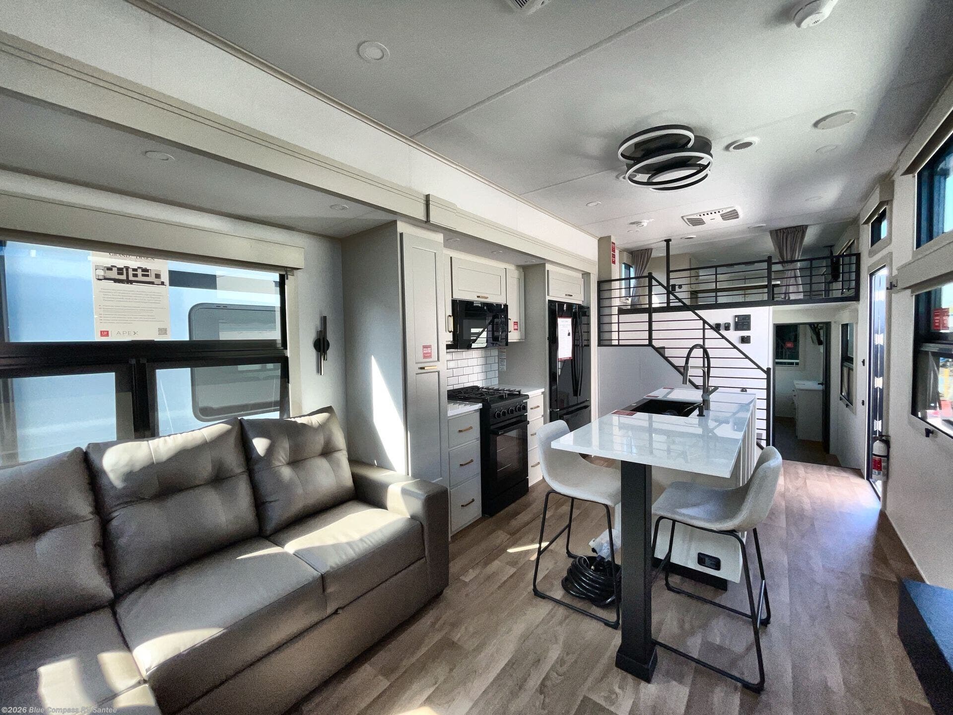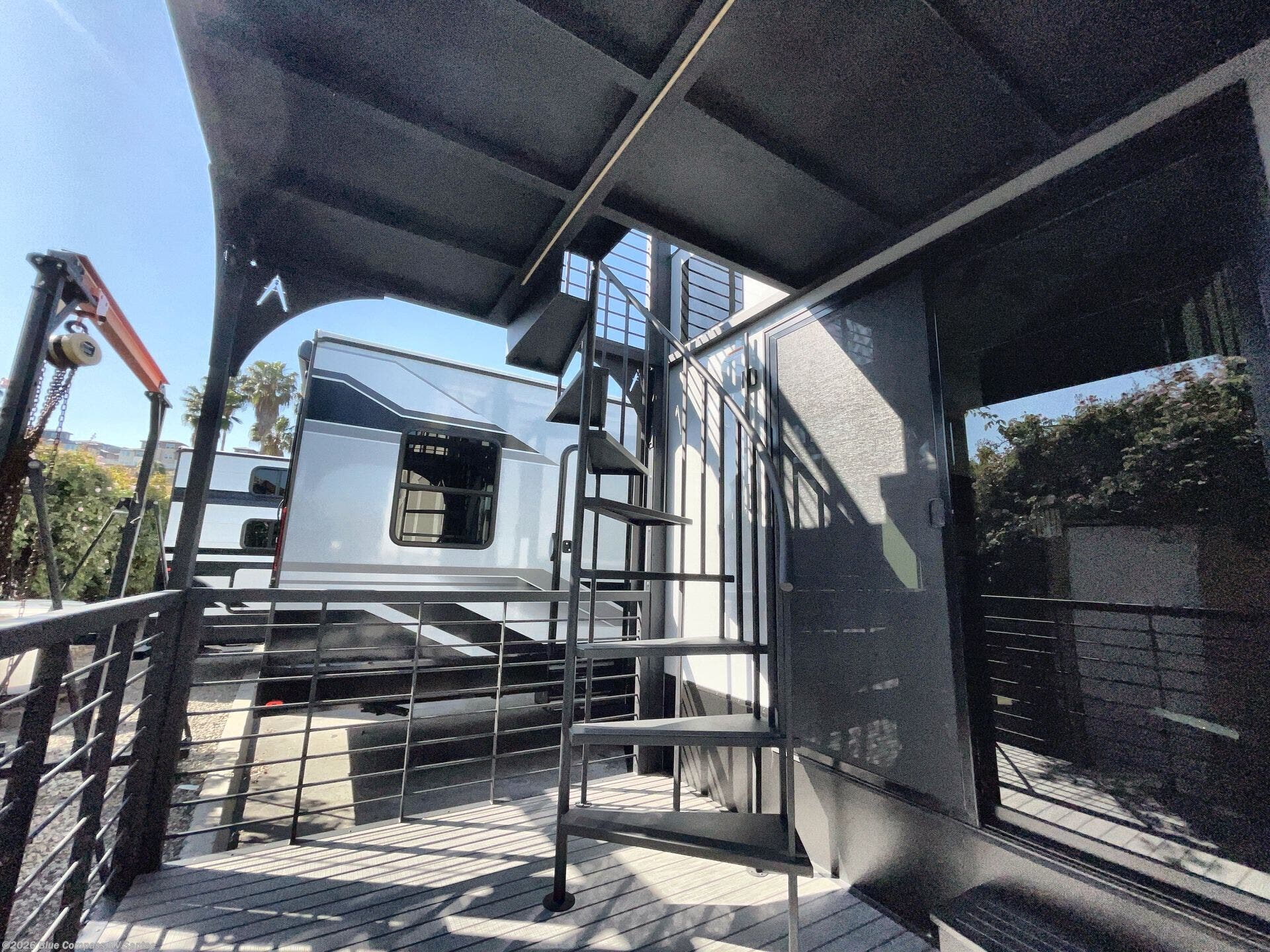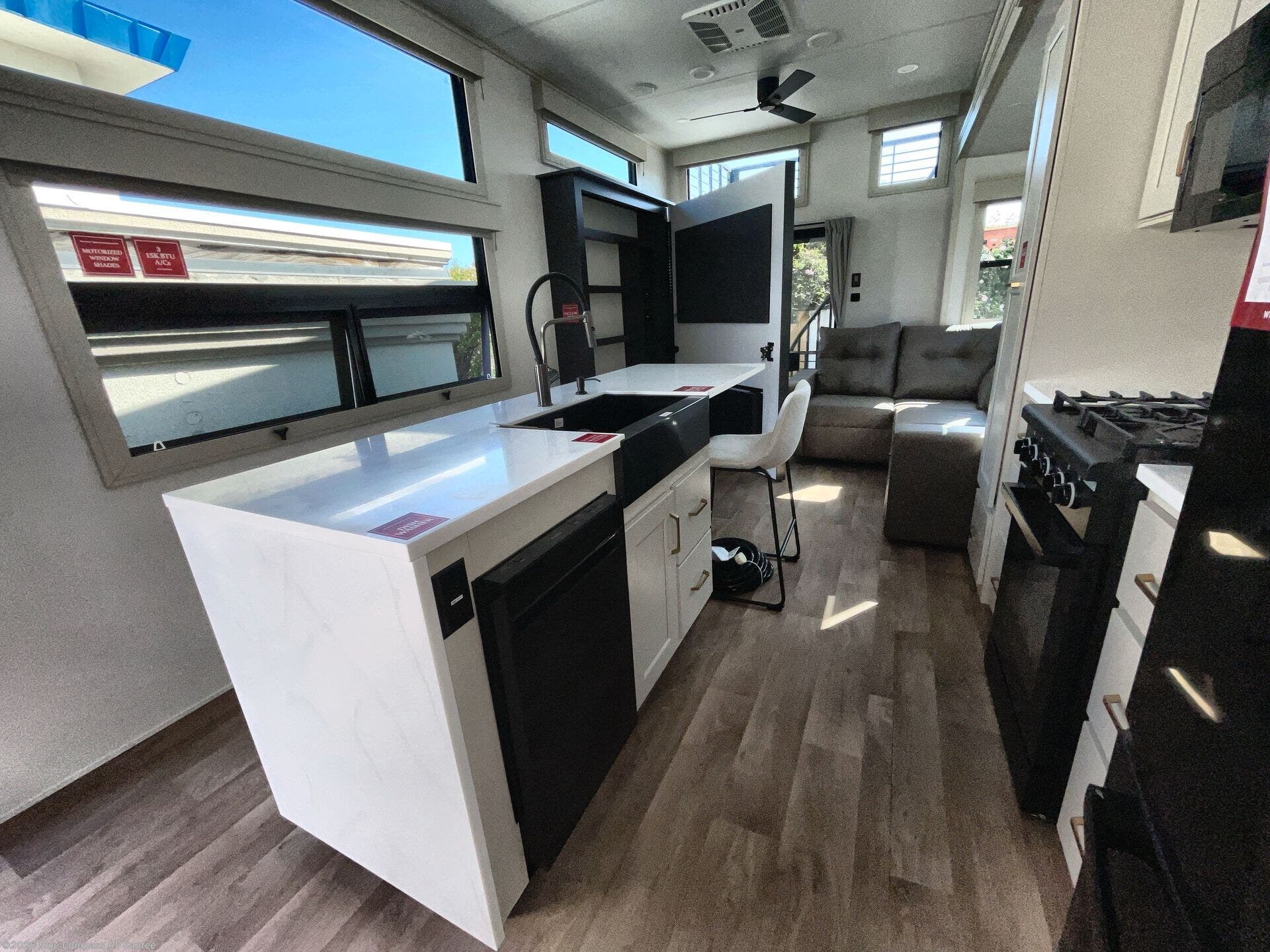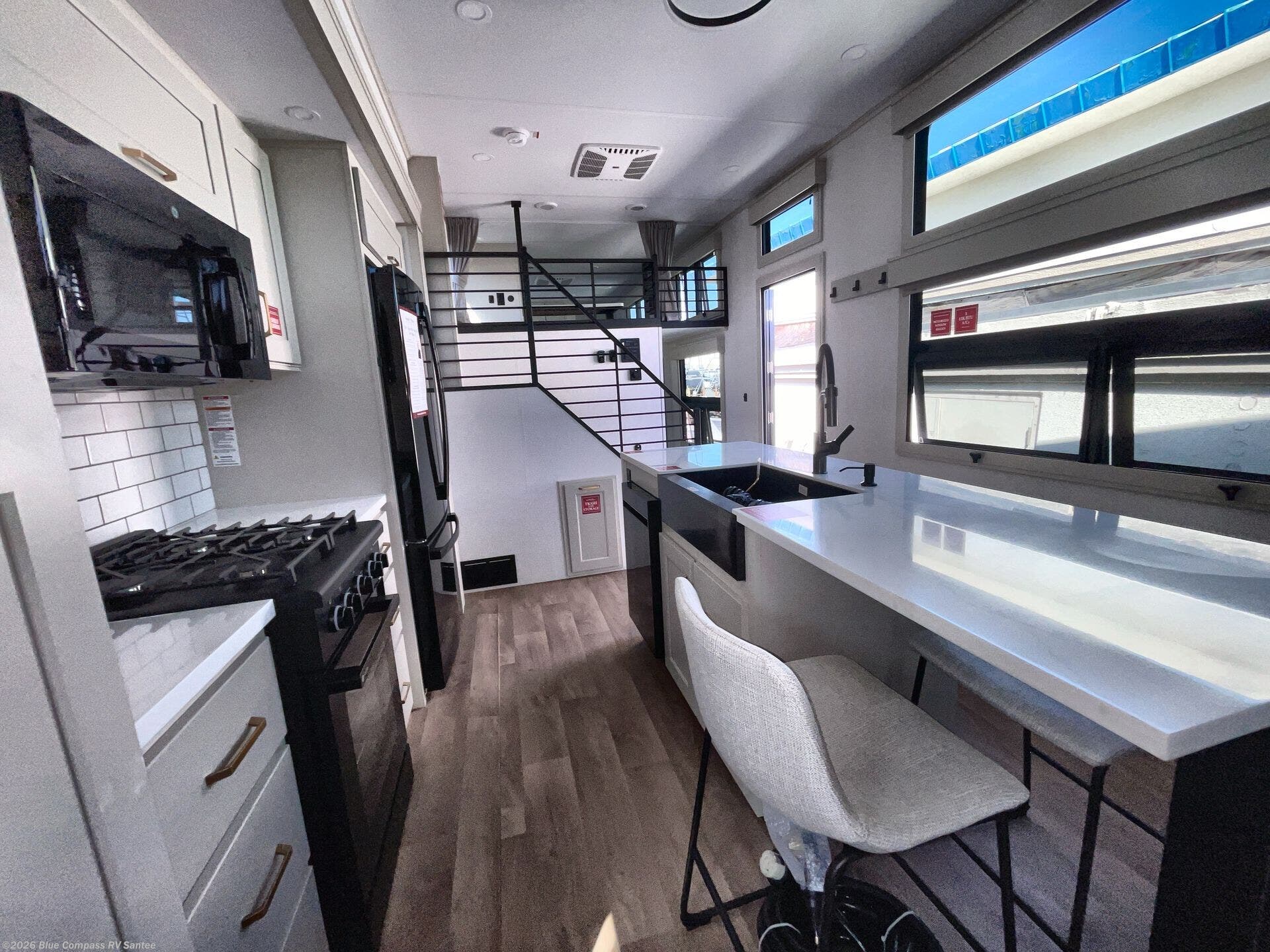 You'll fall in love with this spacious destination trailer that can sleep six each night! With dual entry doors, you can enter in through the rear deck that includes a lower level for gathering, and an observation deck to take in the stars! The other entry door leads into the combined kitchen and living room that includes a spacious kitchen island with a dishwasher, a pull-out pantry, an 18.6 cu. ft. refrigerator and an L-shaped sofa with a trundle bed. There is also an entertainment wall with smart storage and sliding doors that go out to the rear deck. A set of stairs leads to the loft with a queen-size sleeping pad, ample storage space, plus a table with a foot nook so you can put the table away when not in use. Back downstairs, a full bath will let you freshen up each day and a front private bedroom with a king bed slide is sure to bring comfort. There is also storage space for your things, a telescoping TV, plus washer and dryer prep if you plan to add these appliances!