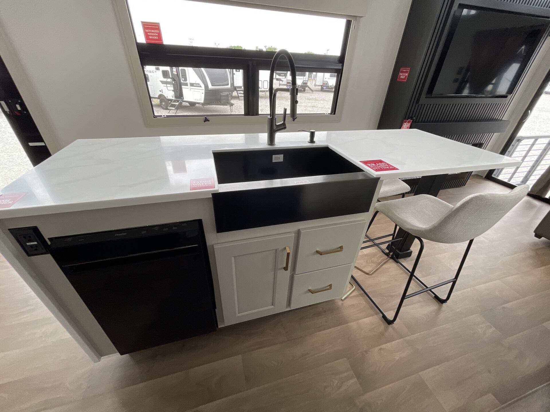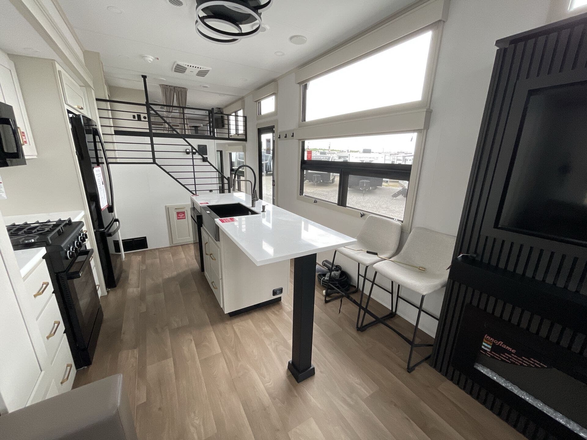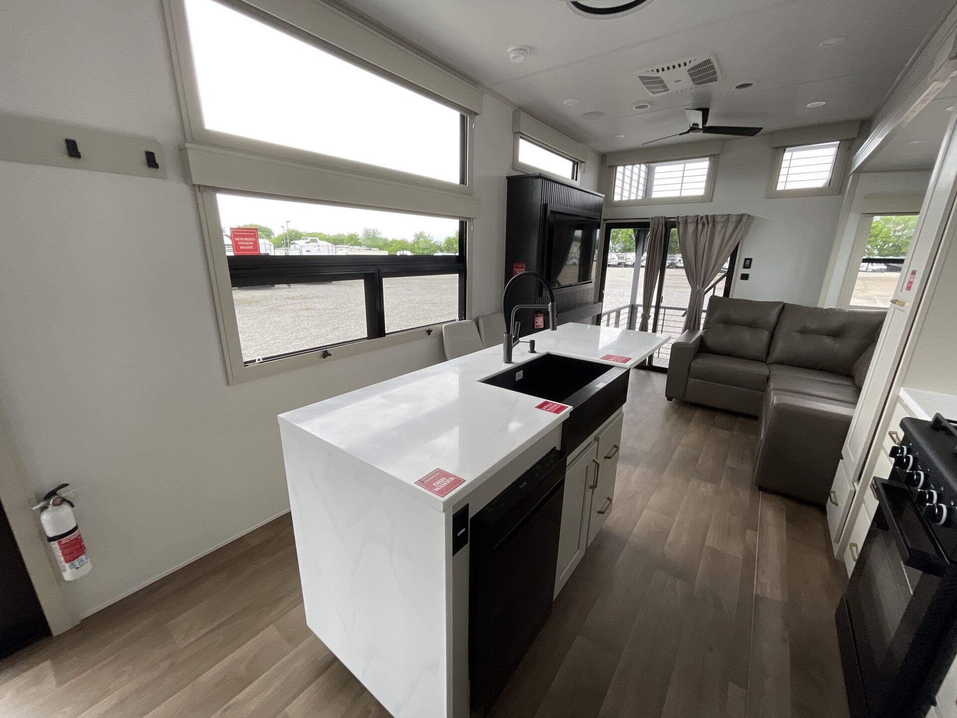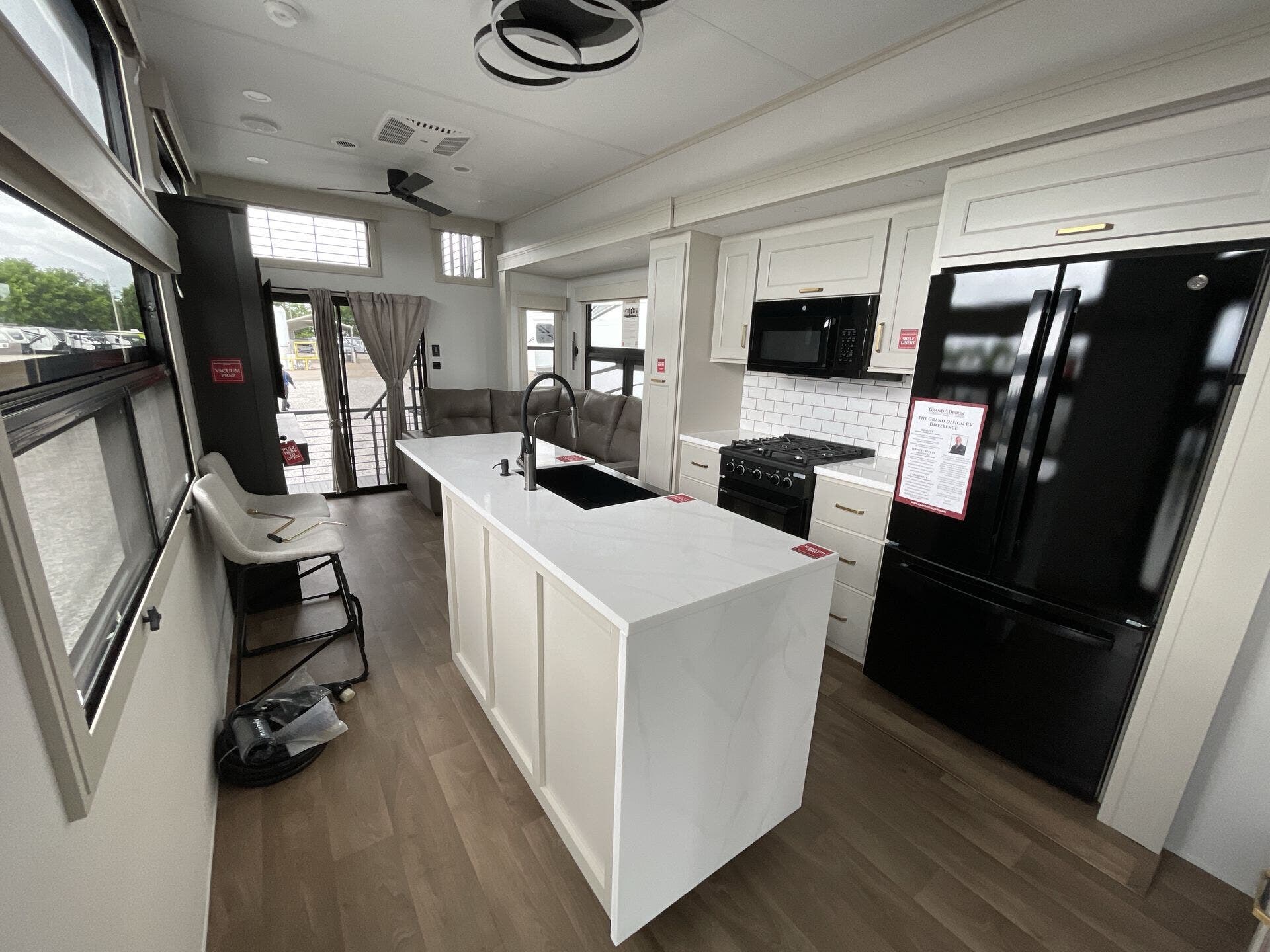 Inside, the 42GD offers a spacious, open-concept layout filled with upscale finishes and thoughtful design elements. The expansive living area features plush seating, large panoramic windows, and an entertainment center that creates a perfect space for relaxing or entertaining guests. The gourmet kitchen is a standout, complete with solid-surface countertops, residential appliances, abundant cabinetry, and a large island—ideal for preparing meals and gathering with family and friends.