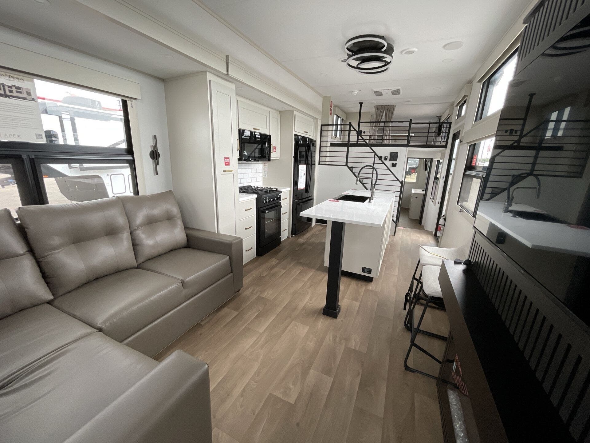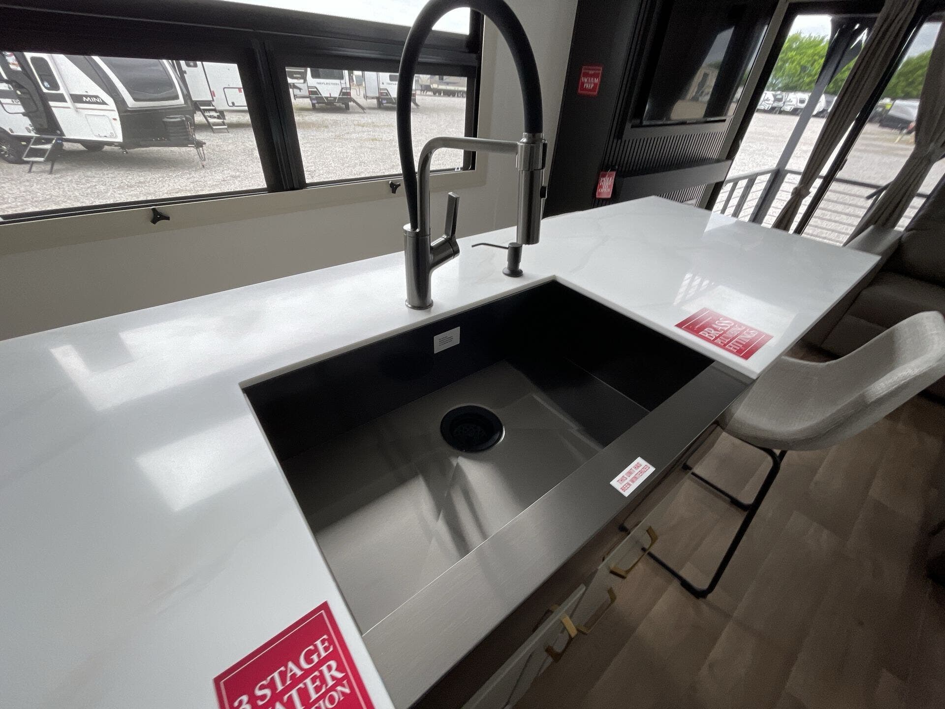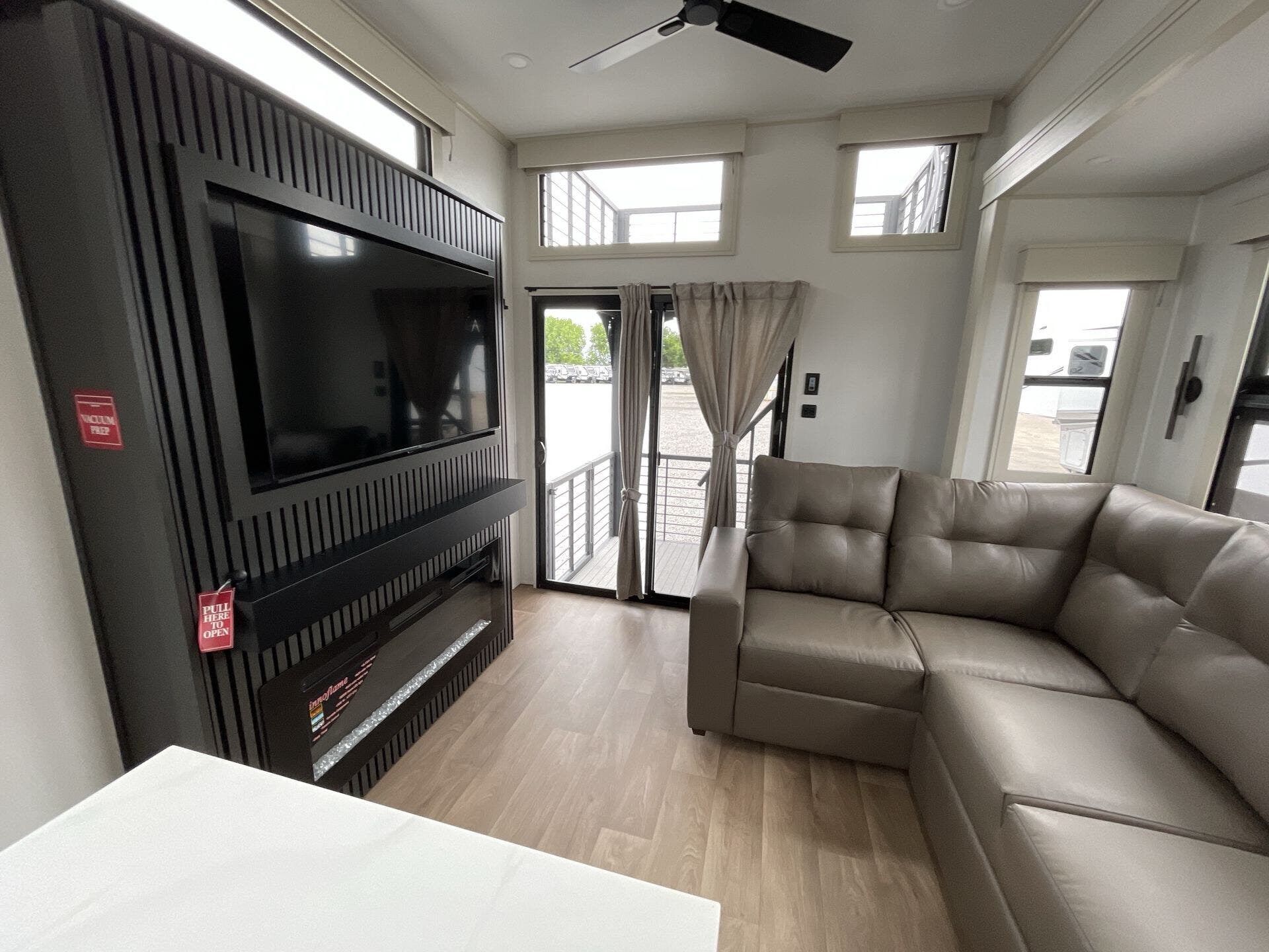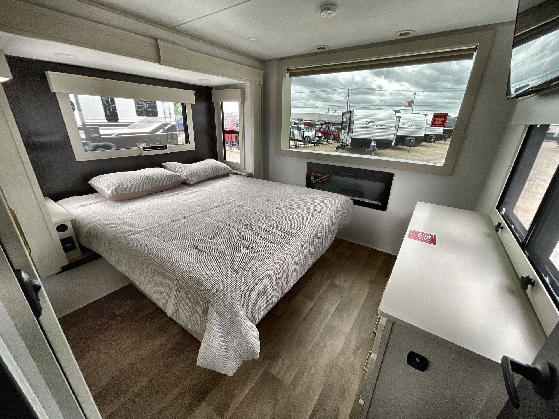 Inside, the 42GD offers a spacious, open-concept layout filled with upscale finishes and thoughtful design elements. The expansive living area features plush seating, large panoramic windows, and an entertainment center that creates a perfect space for relaxing or entertaining guests. The gourmet kitchen is a standout, complete with solid-surface countertops, residential appliances, abundant cabinetry, and a large island—ideal for preparing meals and gathering with family and friends.