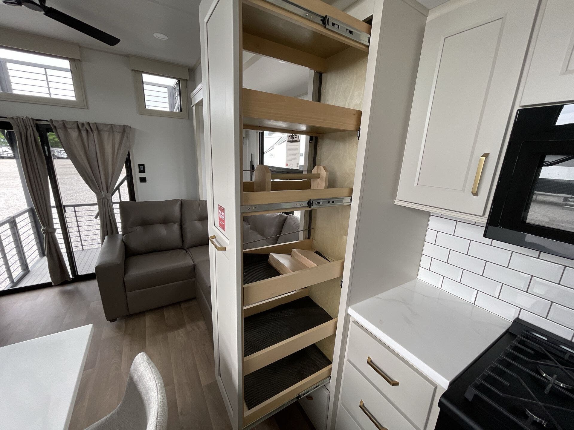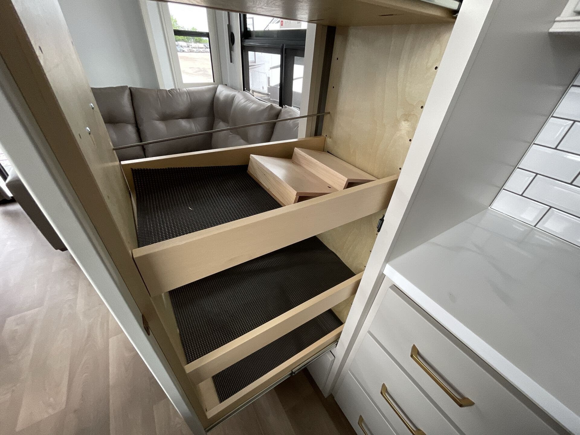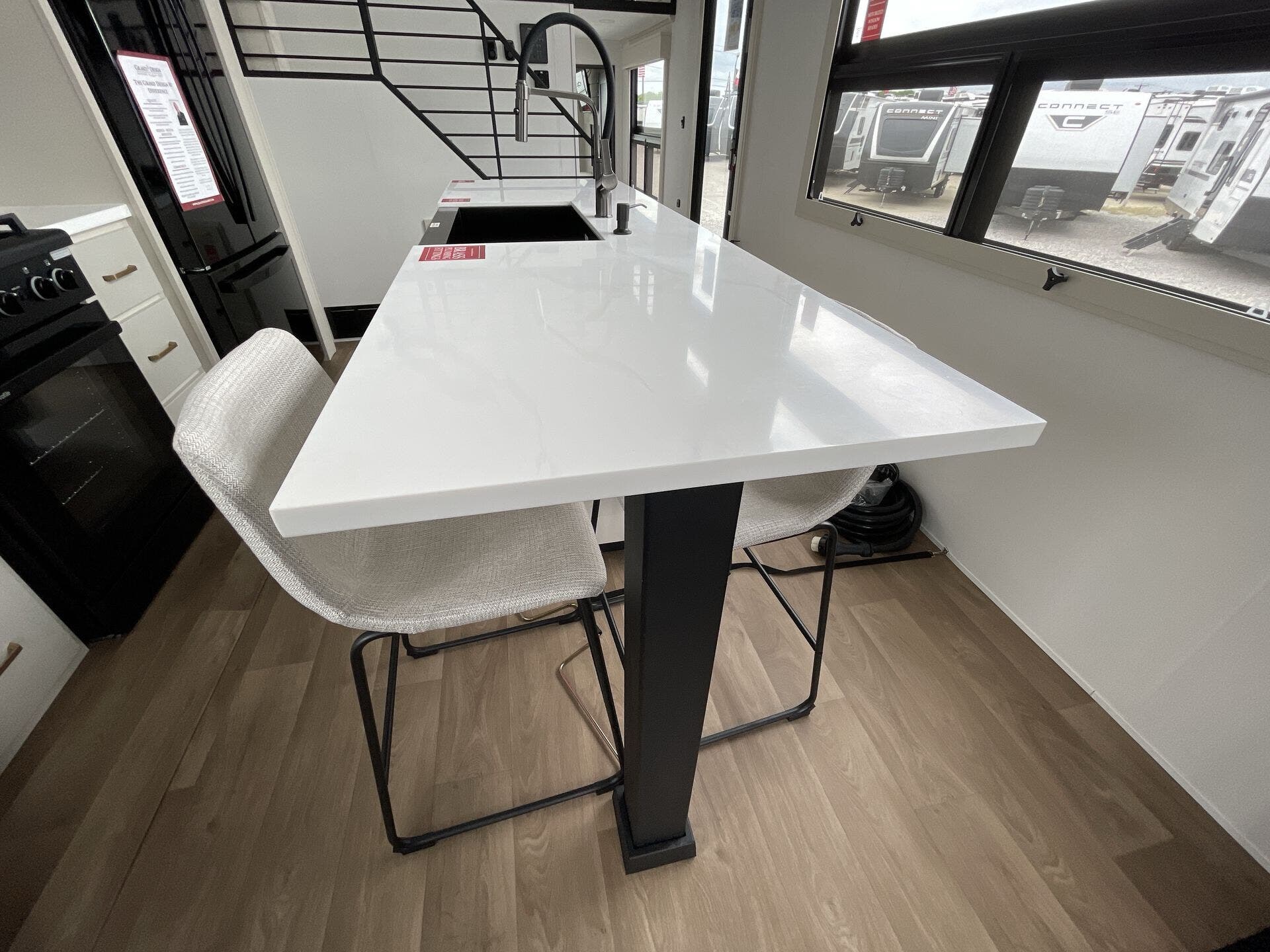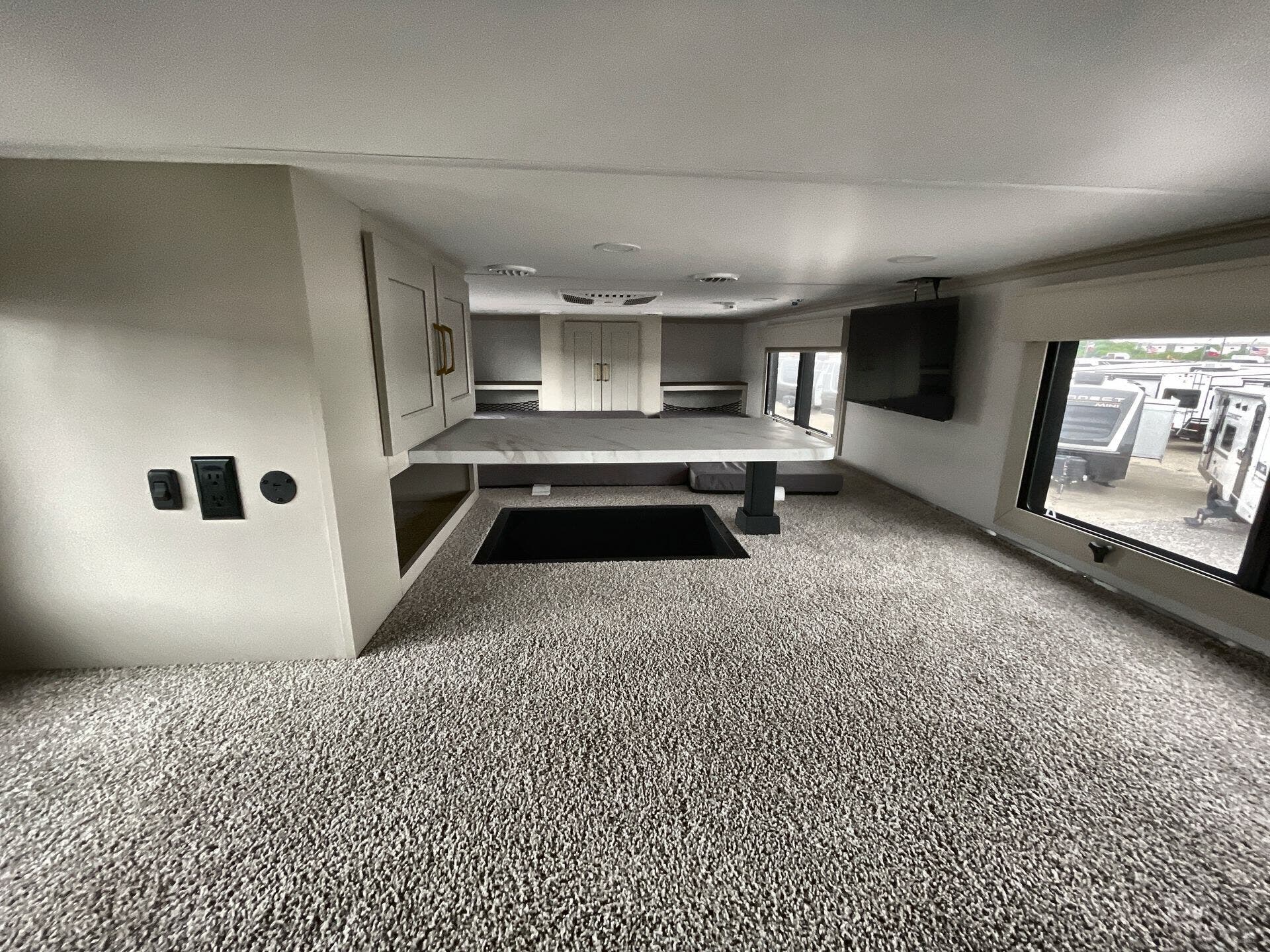 Inside, the 42GD offers a spacious, open-concept layout filled with upscale finishes and thoughtful design elements. The expansive living area features plush seating, large panoramic windows, and an entertainment center that creates a perfect space for relaxing or entertaining guests. The gourmet kitchen is a standout, complete with solid-surface countertops, residential appliances, abundant cabinetry, and a large island—ideal for preparing meals and gathering with family and friends.
