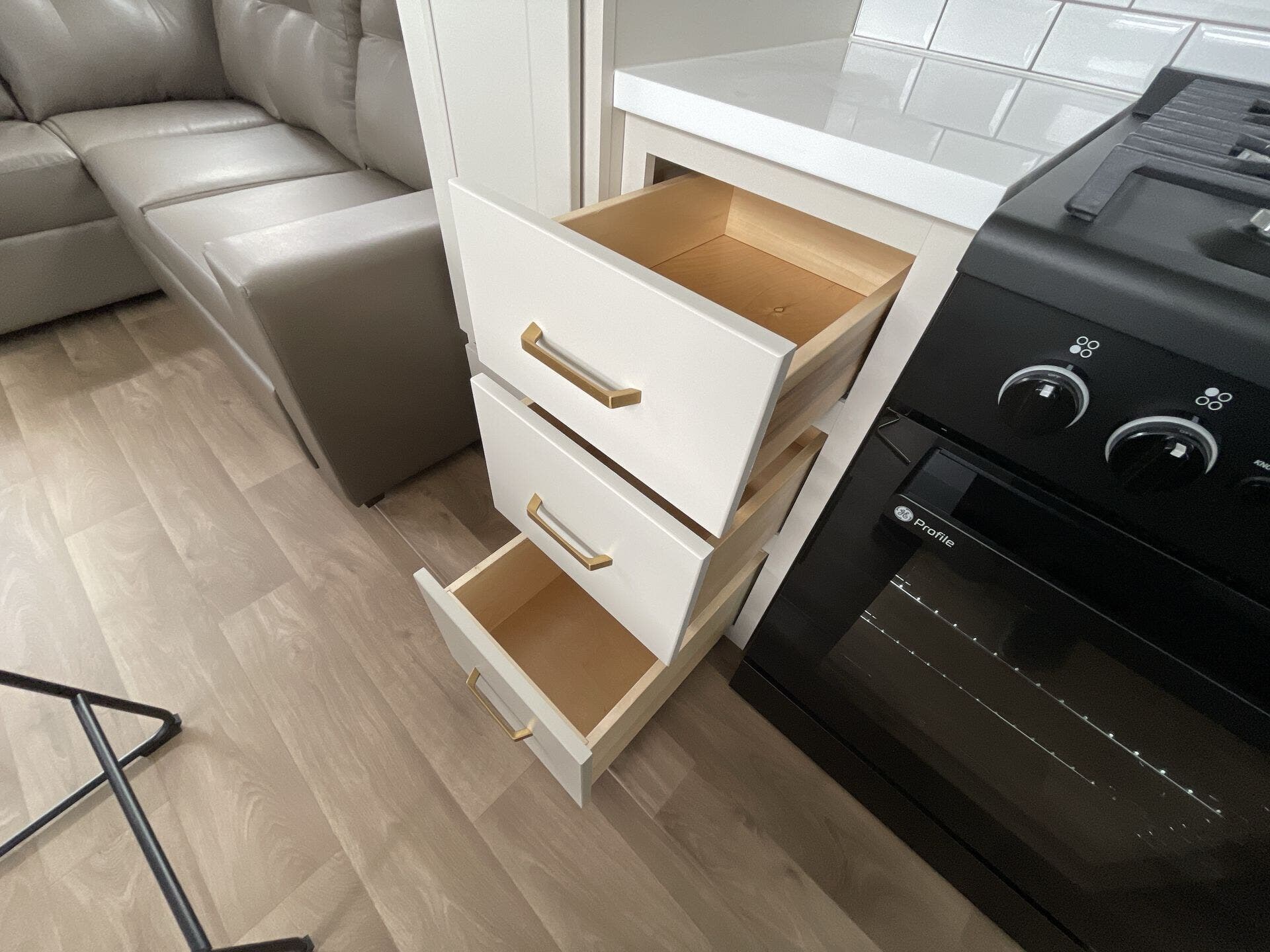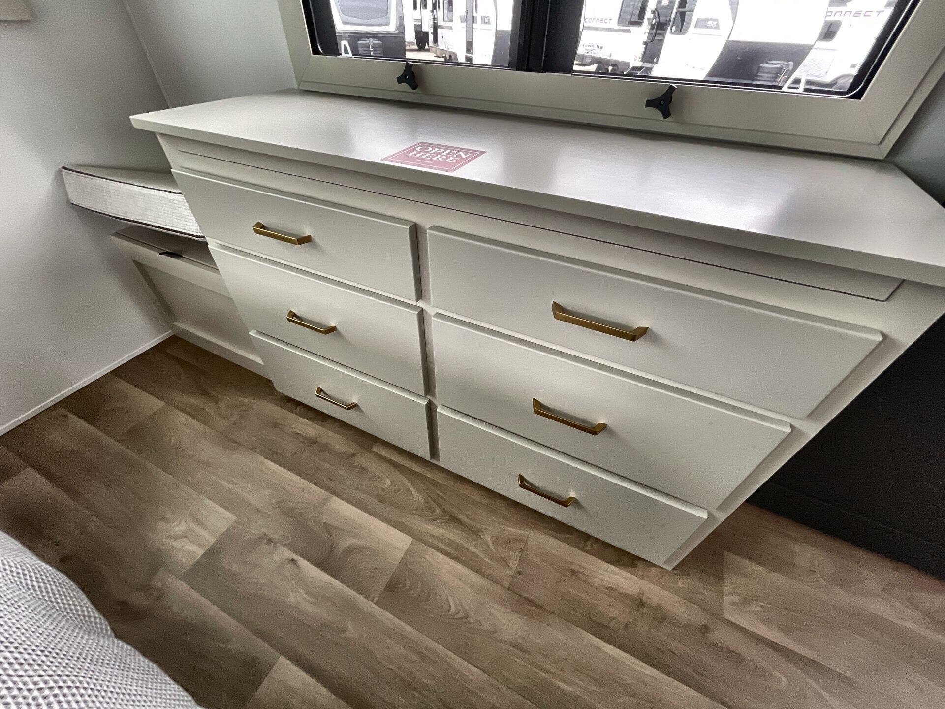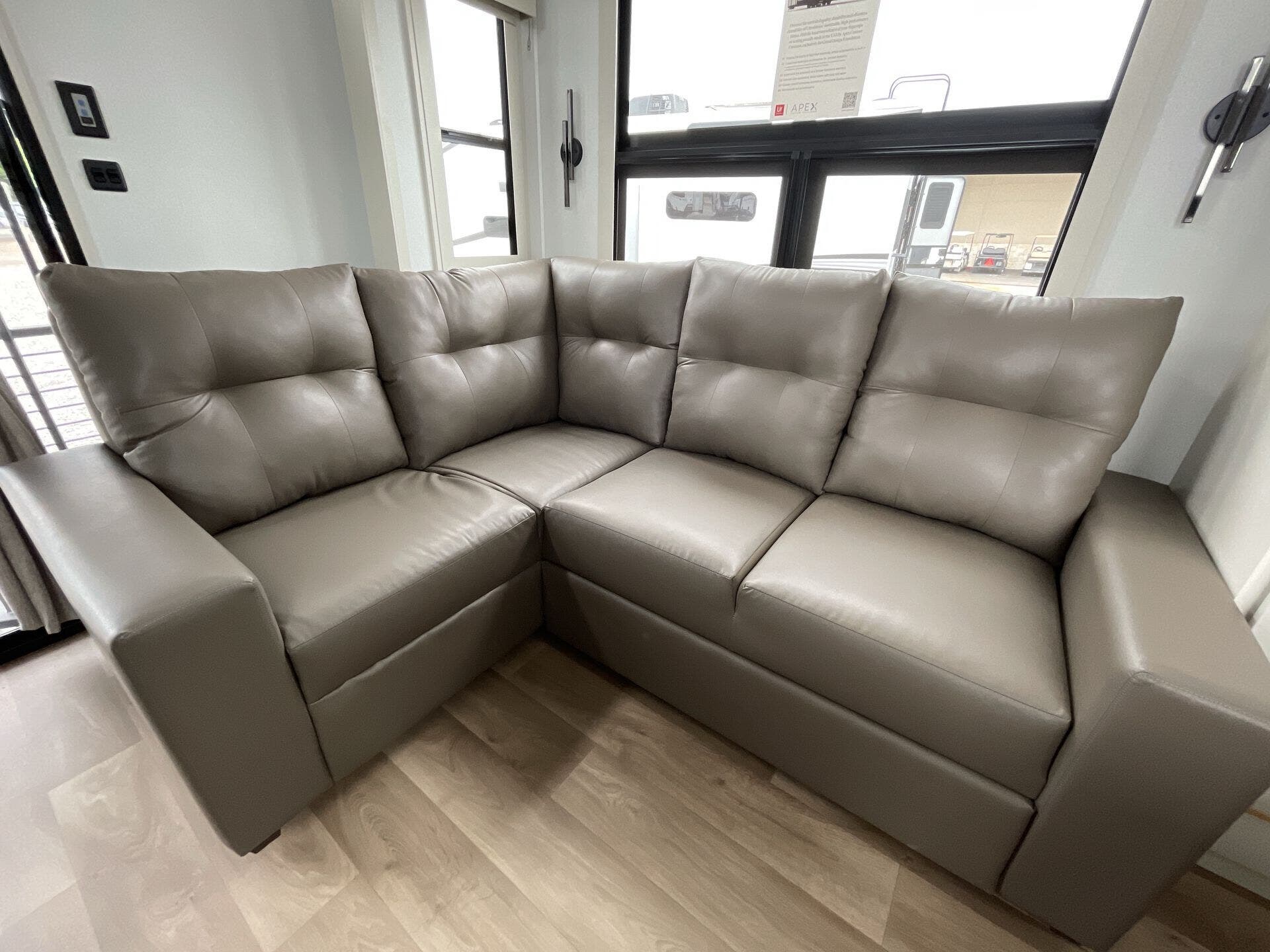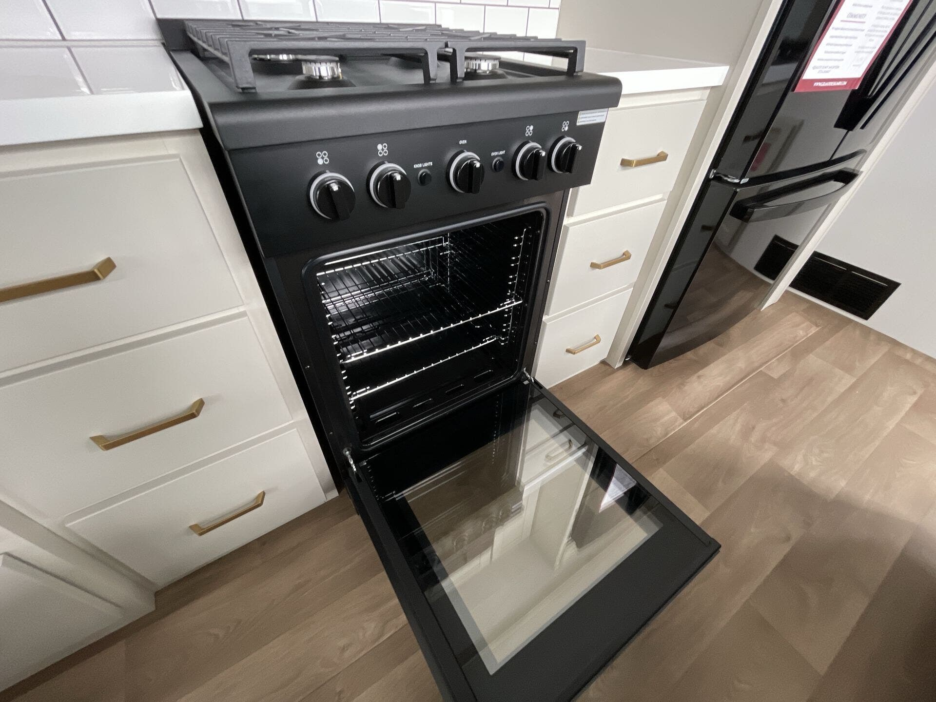 Inside, the 42GD offers a spacious, open-concept layout filled with upscale finishes and thoughtful design elements. The expansive living area features plush seating, large panoramic windows, and an entertainment center that creates a perfect space for relaxing or entertaining guests. The gourmet kitchen is a standout, complete with solid-surface countertops, residential appliances, abundant cabinetry, and a large island—ideal for preparing meals and gathering with family and friends.