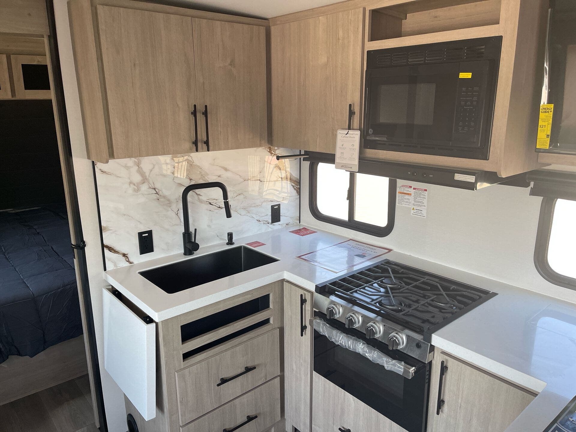 Inside, a front bedroom features a true residential queen bed (60″×80″) with wardrobes and USB/power pockets for convenience. The center kitchen boasts a full-size 10 cu. ft. 12V refrigerator, three-burner range, microwave, a deep stainless sink, flip-up countertop extension, and abundant storage including pull-out pantry space. Theater-style dinette and theater seating in the single slide furnish a welcoming living space.