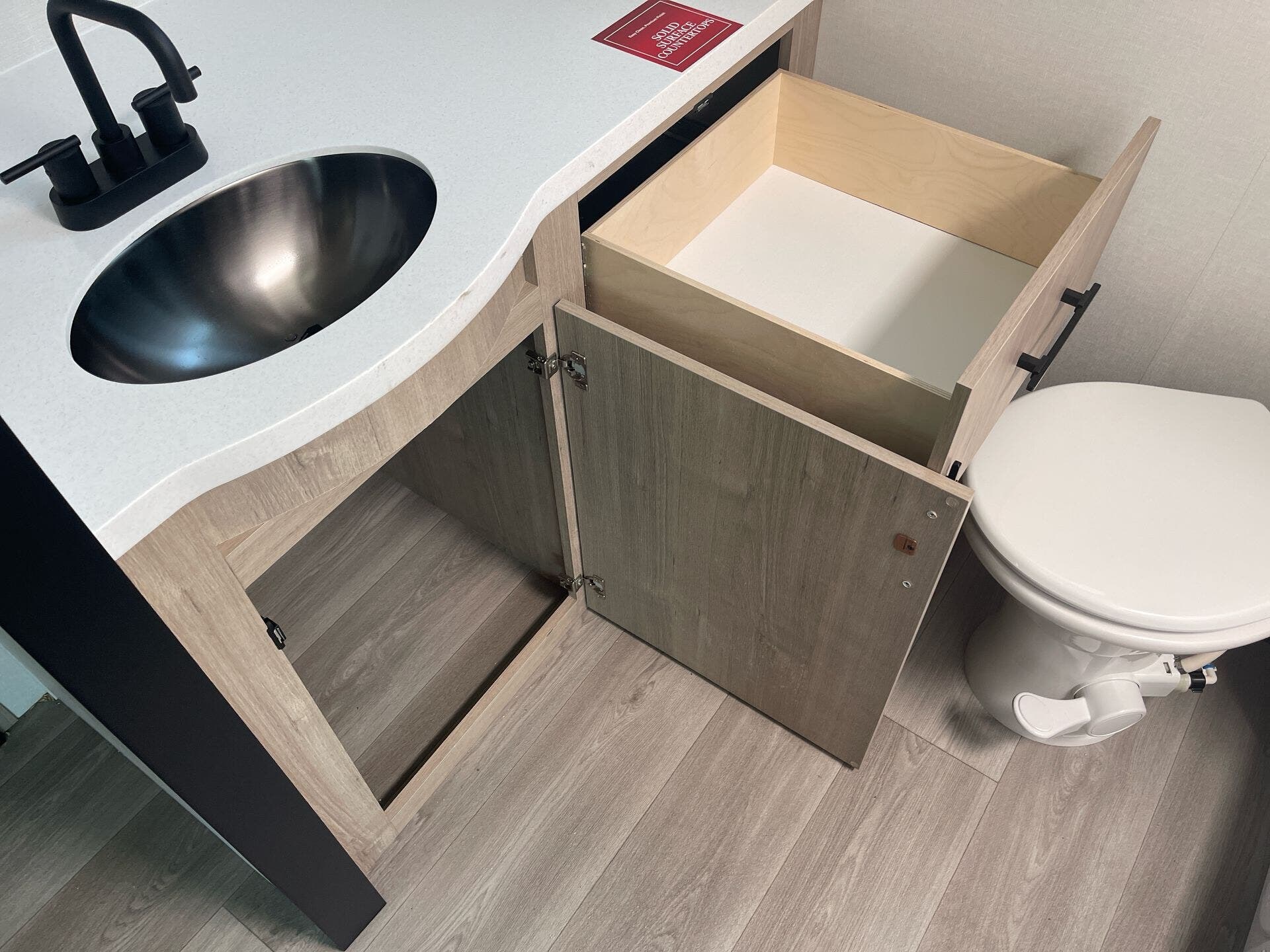 A full rear bath includes a roomy 30″×36″ residential walk-in shower with skylight, solid surface countertop in the bath, and well-appointed cabinetry.
