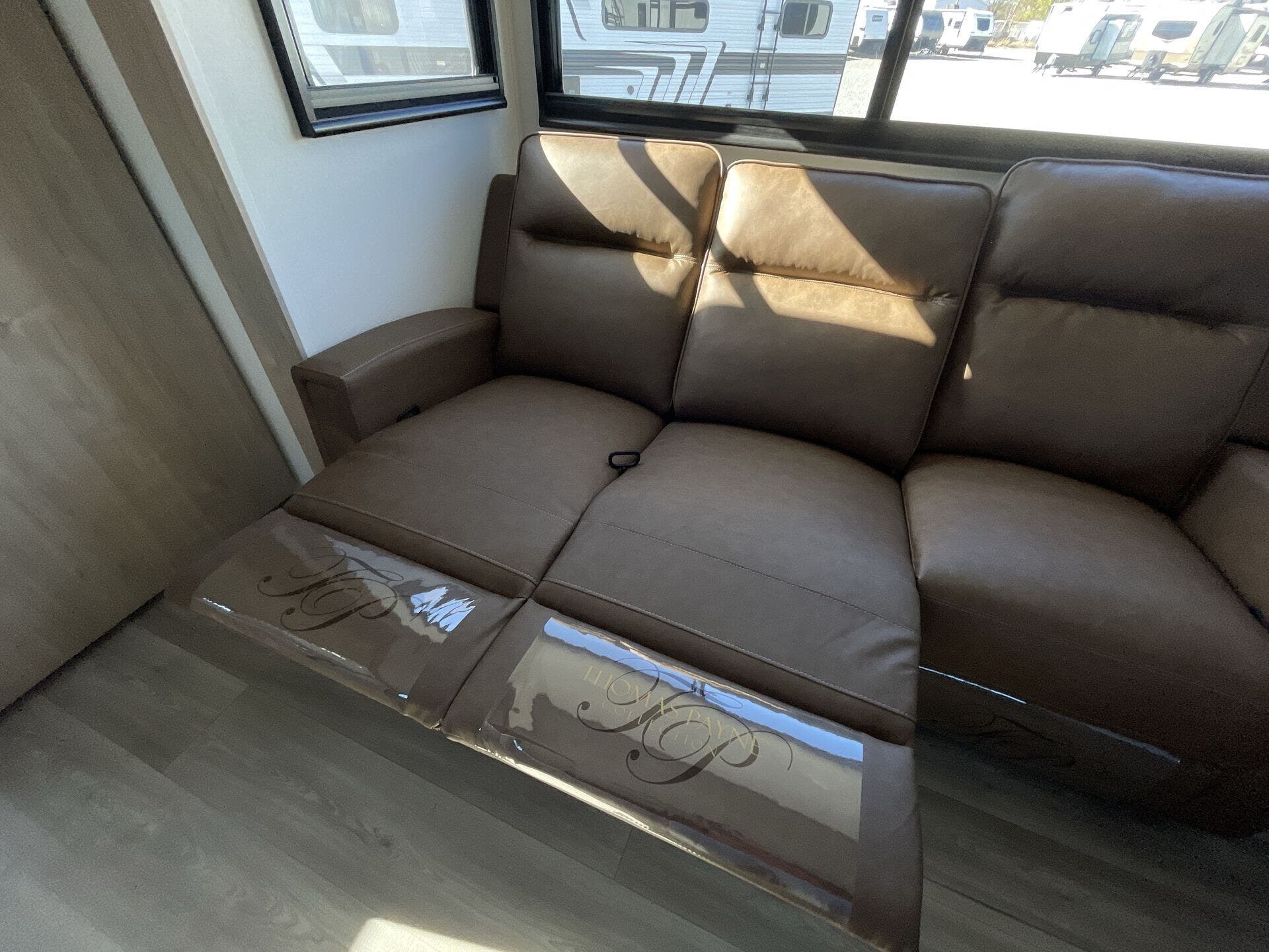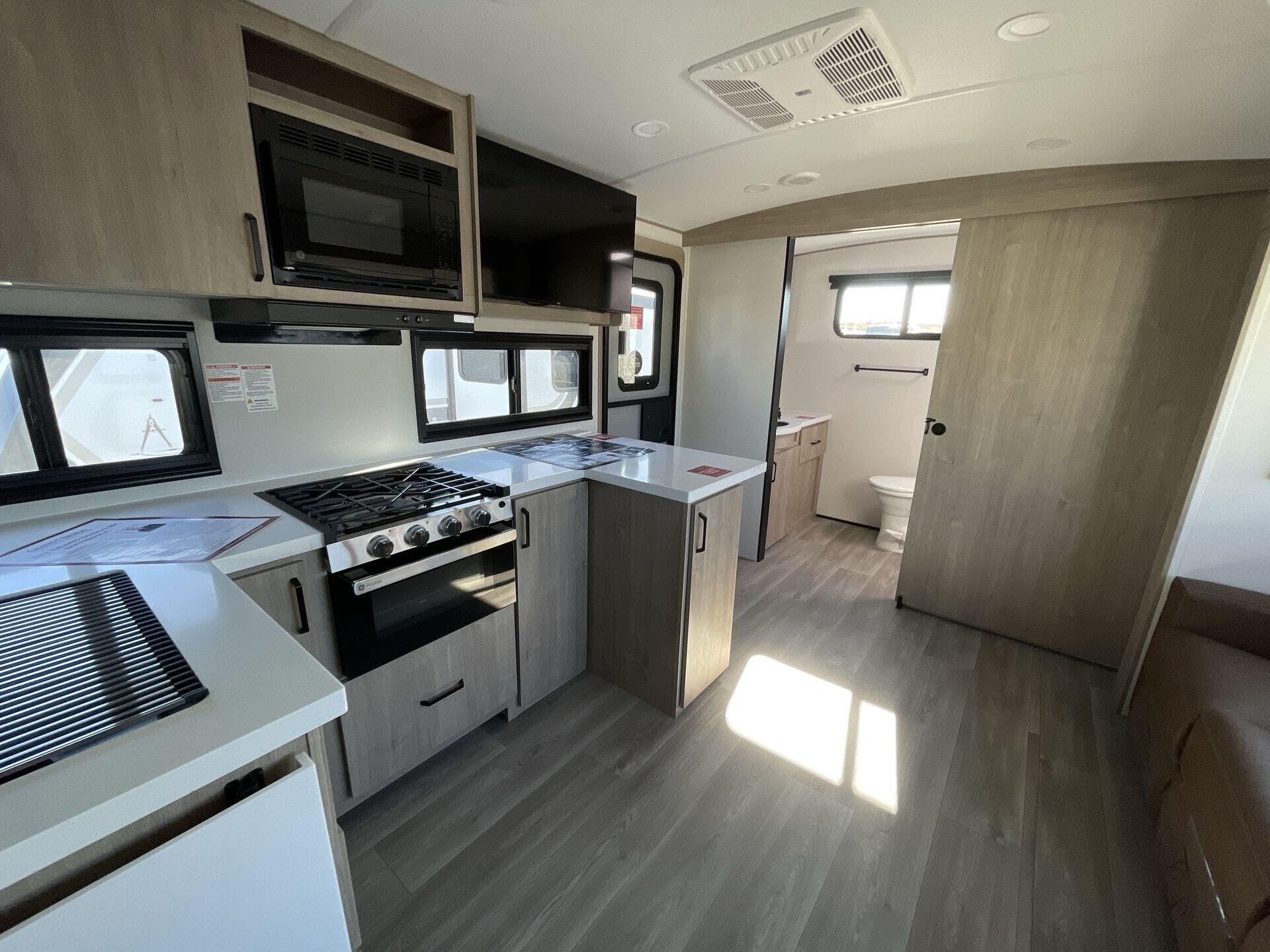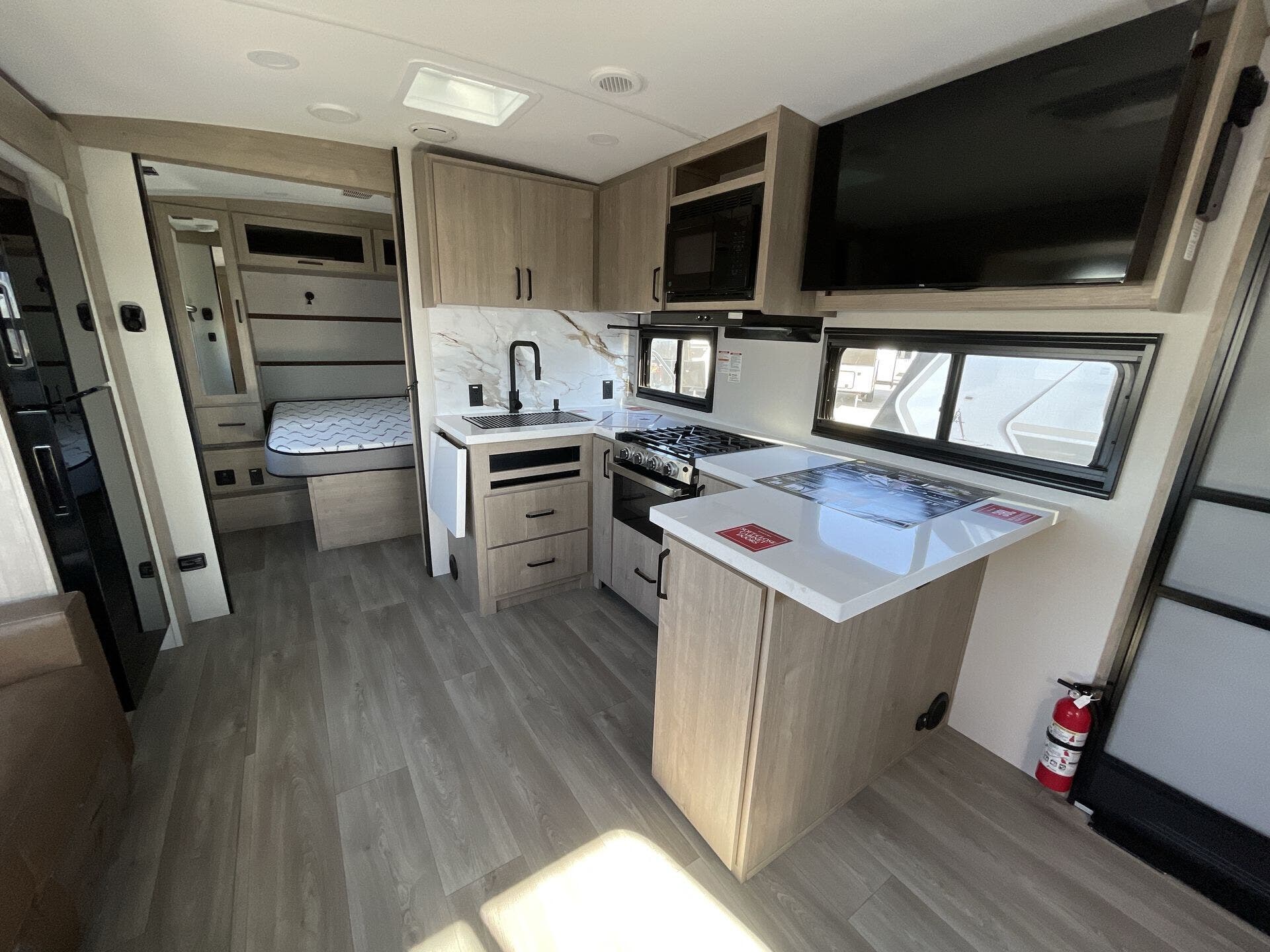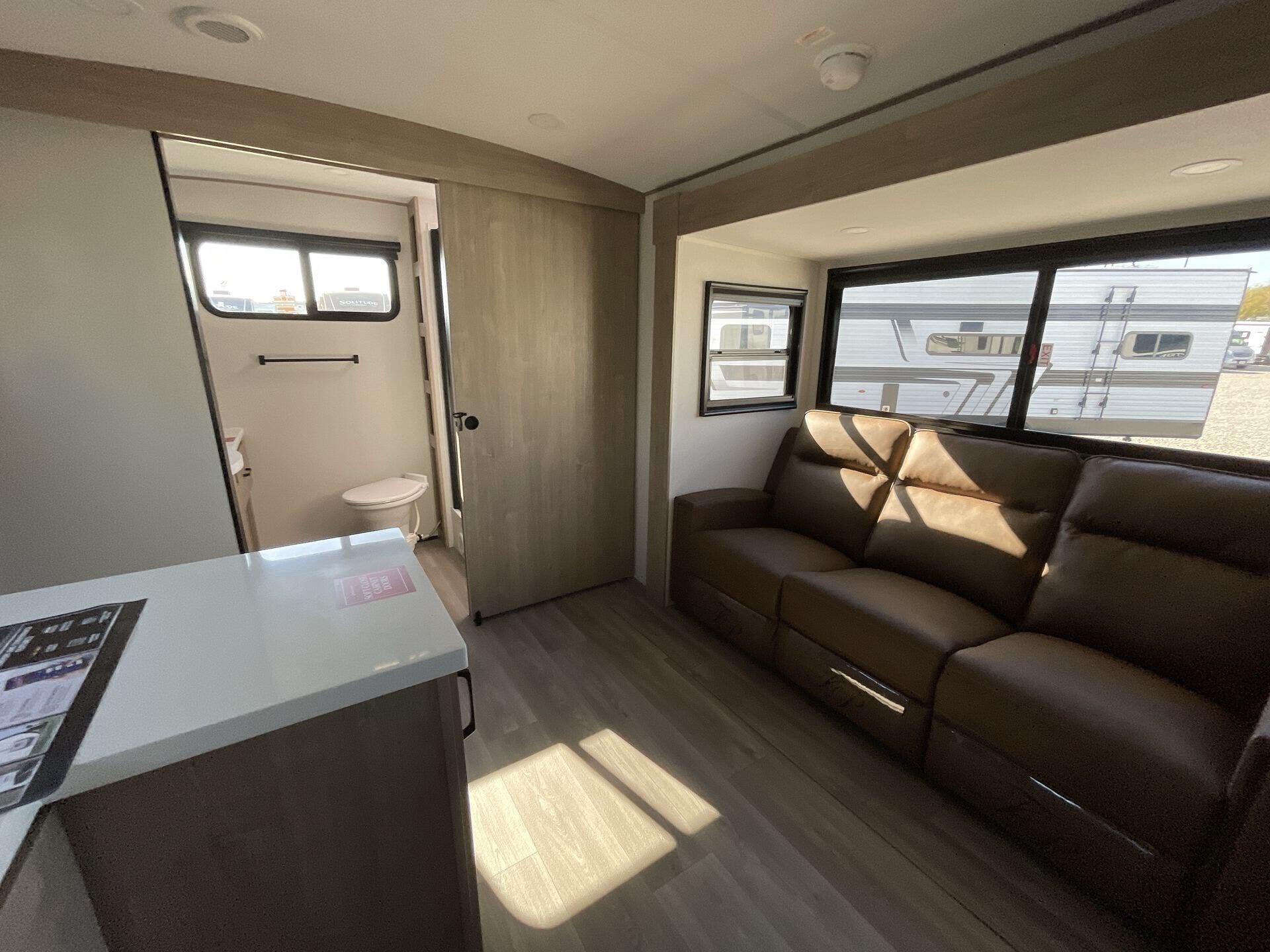 Step inside, and the 2300MK immediately impresses with its bright, open layout and upscale finishes. The rear kitchen design provides abundant counter space, stainless-steel appliances, a spacious pantry, and everything you need to prepare meals with ease. The slide-out hosts a comfortable theater seating or dinette option, perfectly positioned across from the entertainment center with a large LED TV and fireplace—ideal for cozy nights in. The dedicated desk/workstation is a standout feature, giving travelers a true workspace for remote work, hobbies, or planning the next leg of your adventure.