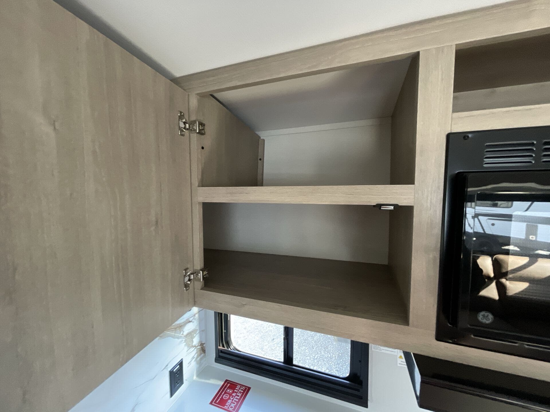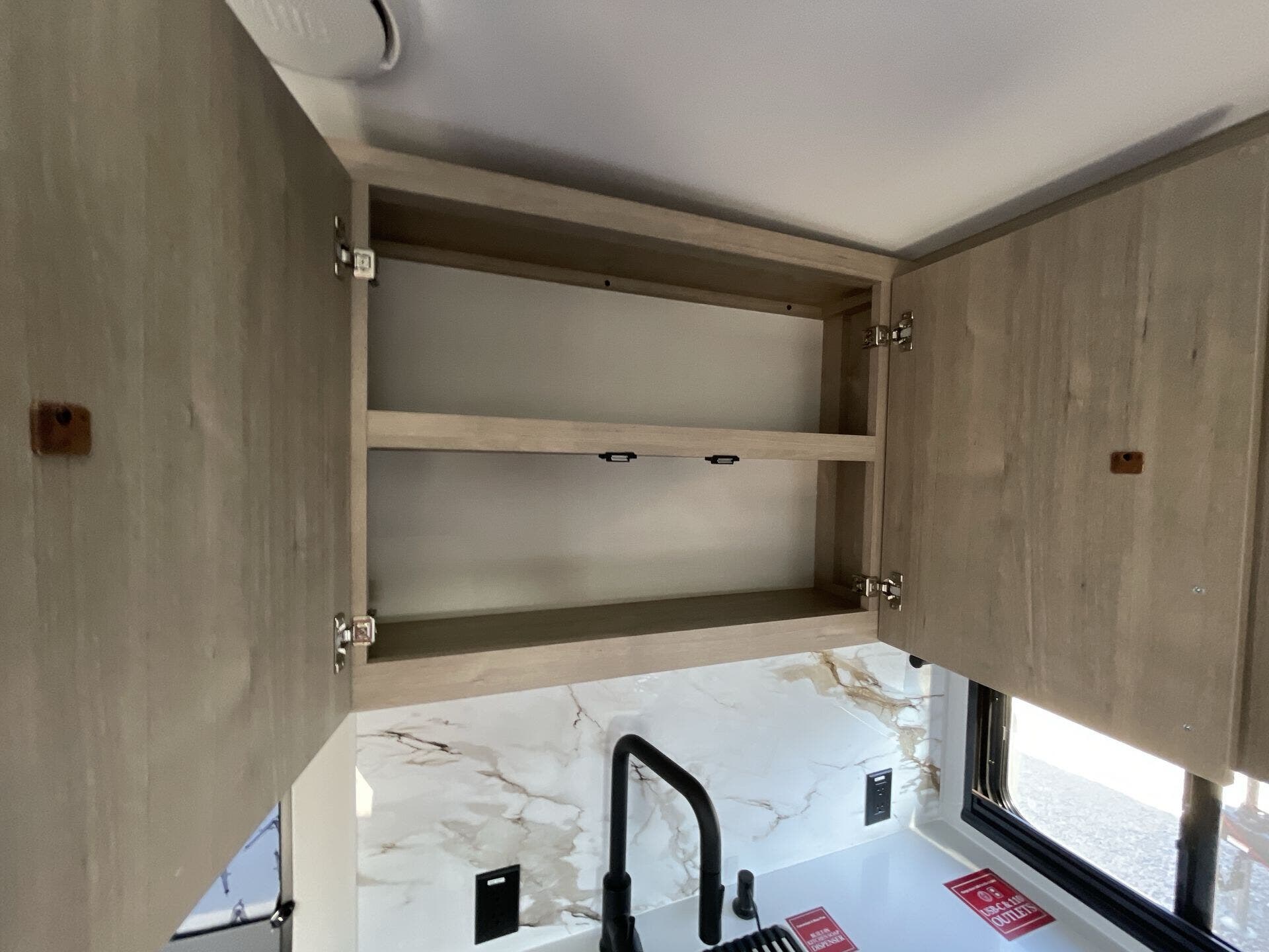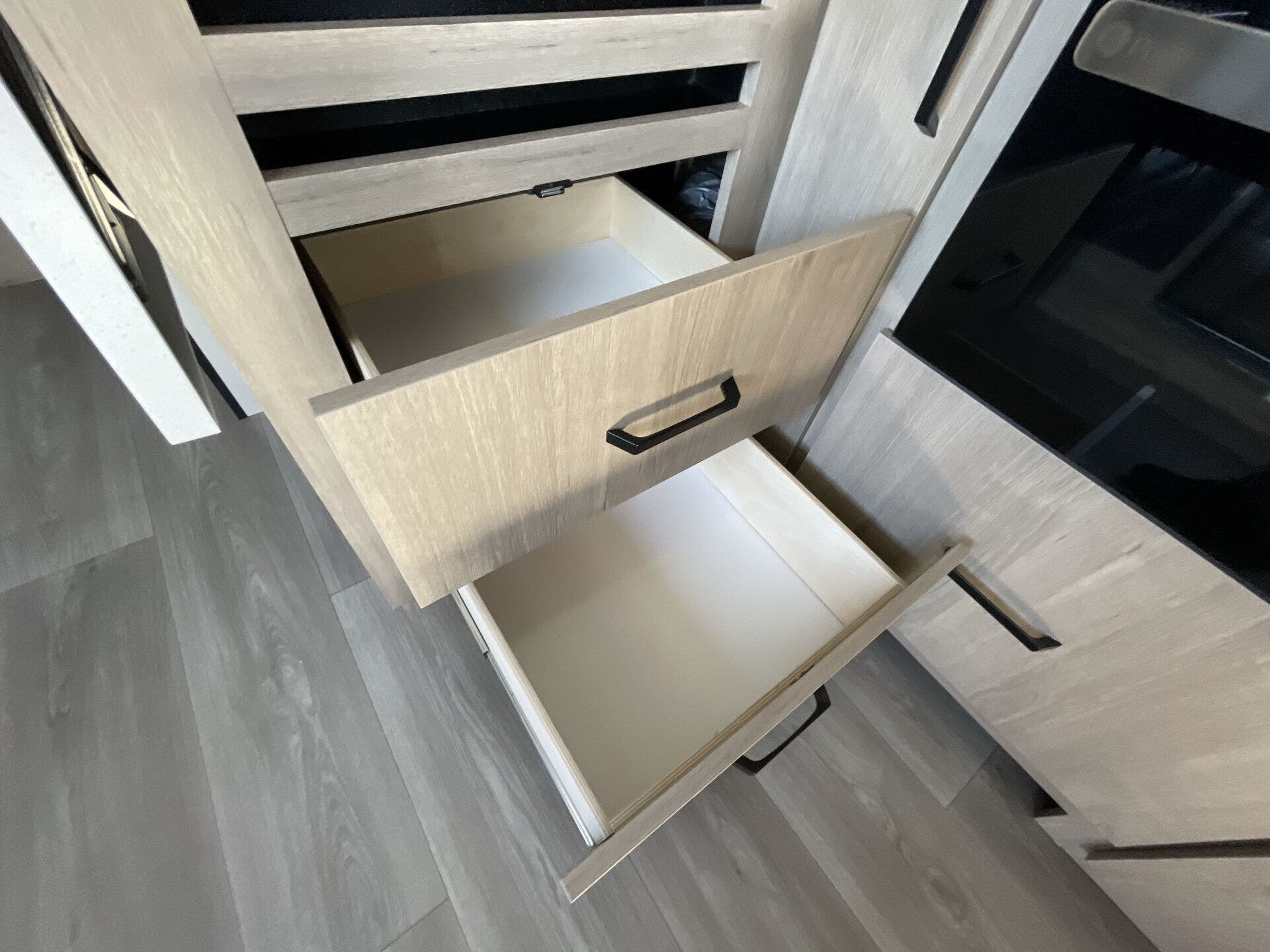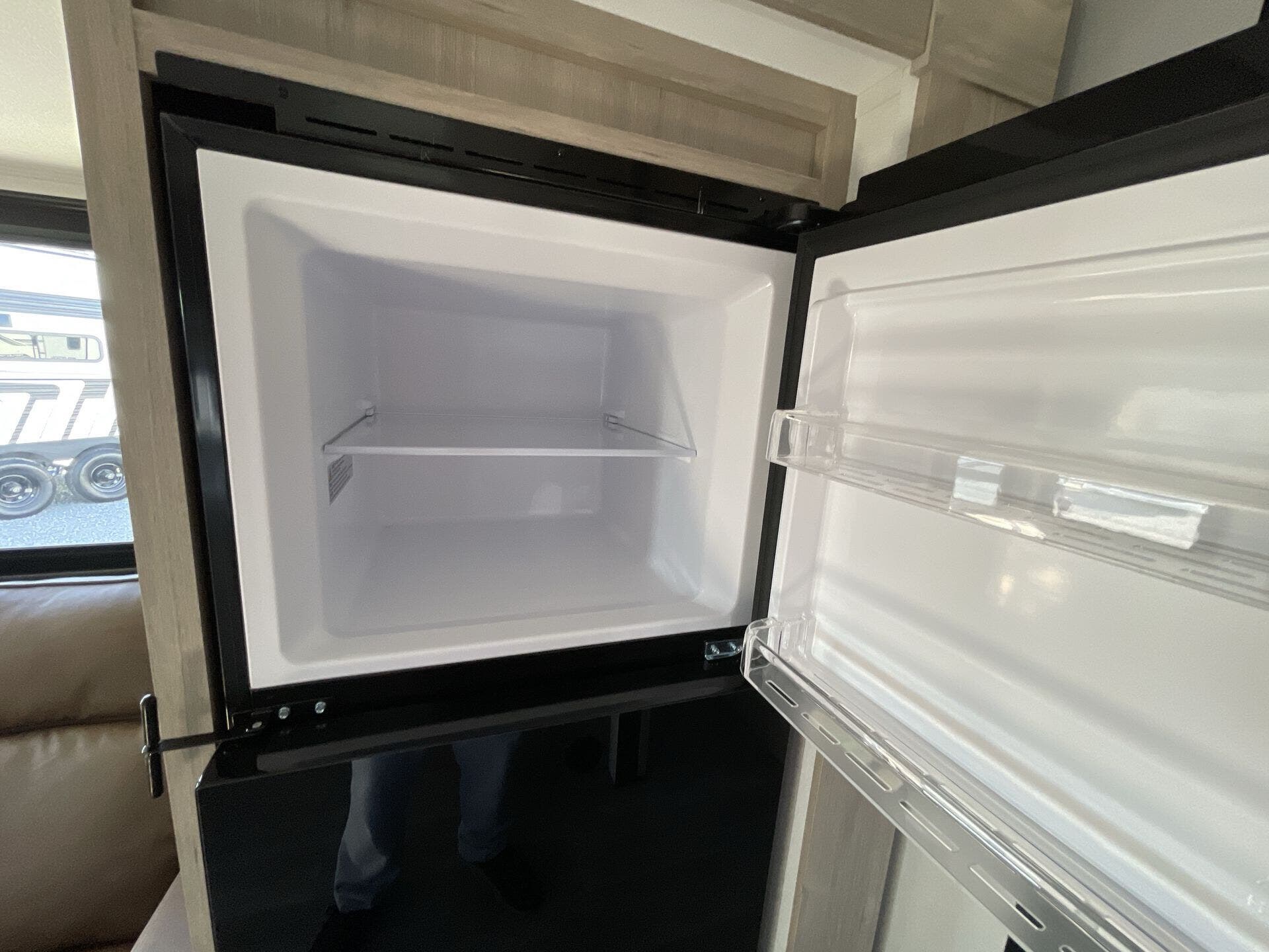 Step inside, and the 2300MK immediately impresses with its bright, open layout and upscale finishes. The rear kitchen design provides abundant counter space, stainless-steel appliances, a spacious pantry, and everything you need to prepare meals with ease. The slide-out hosts a comfortable theater seating or dinette option, perfectly positioned across from the entertainment center with a large LED TV and fireplace—ideal for cozy nights in. The dedicated desk/workstation is a standout feature, giving travelers a true workspace for remote work, hobbies, or planning the next leg of your adventure.