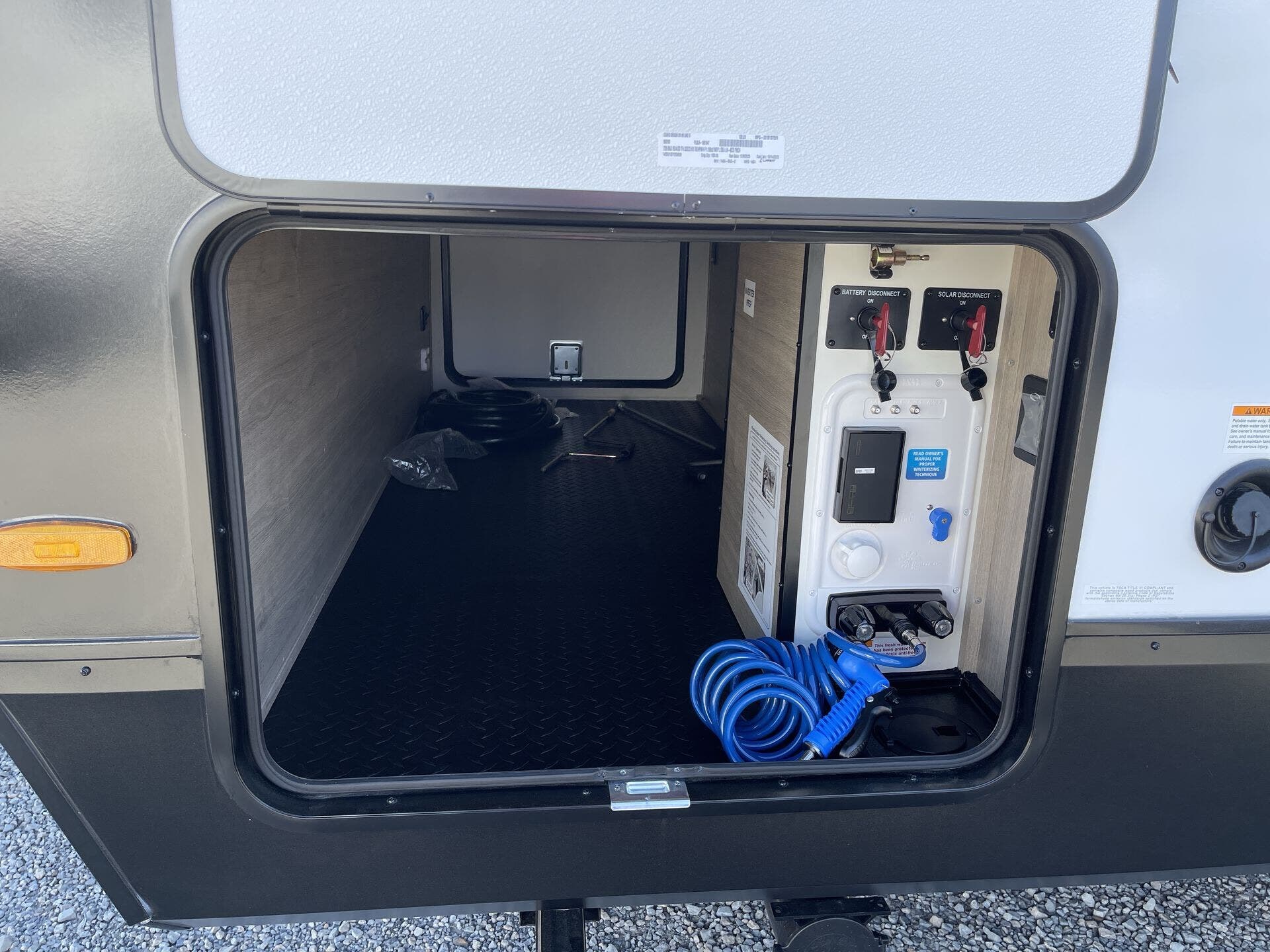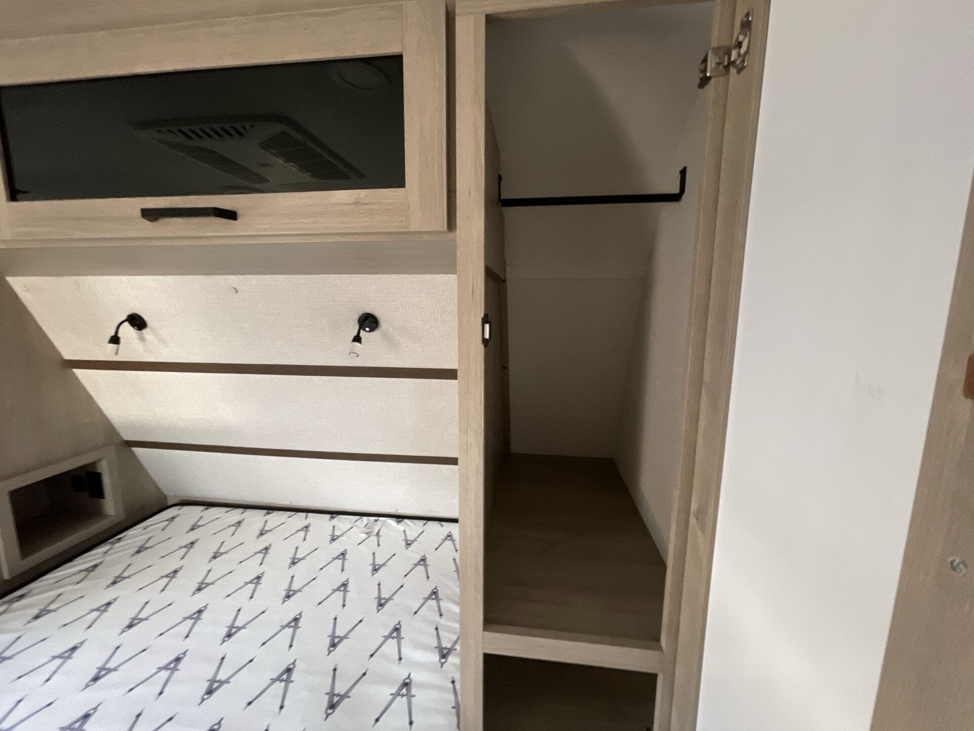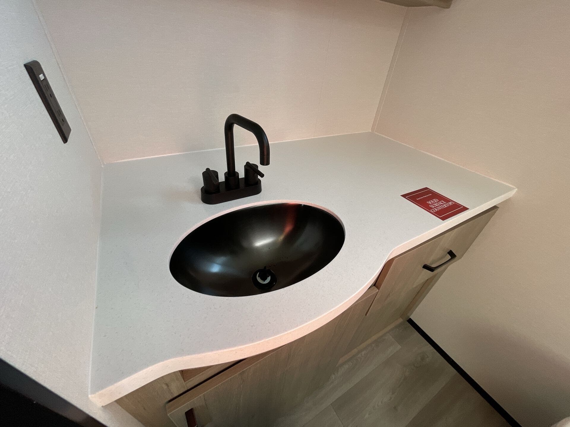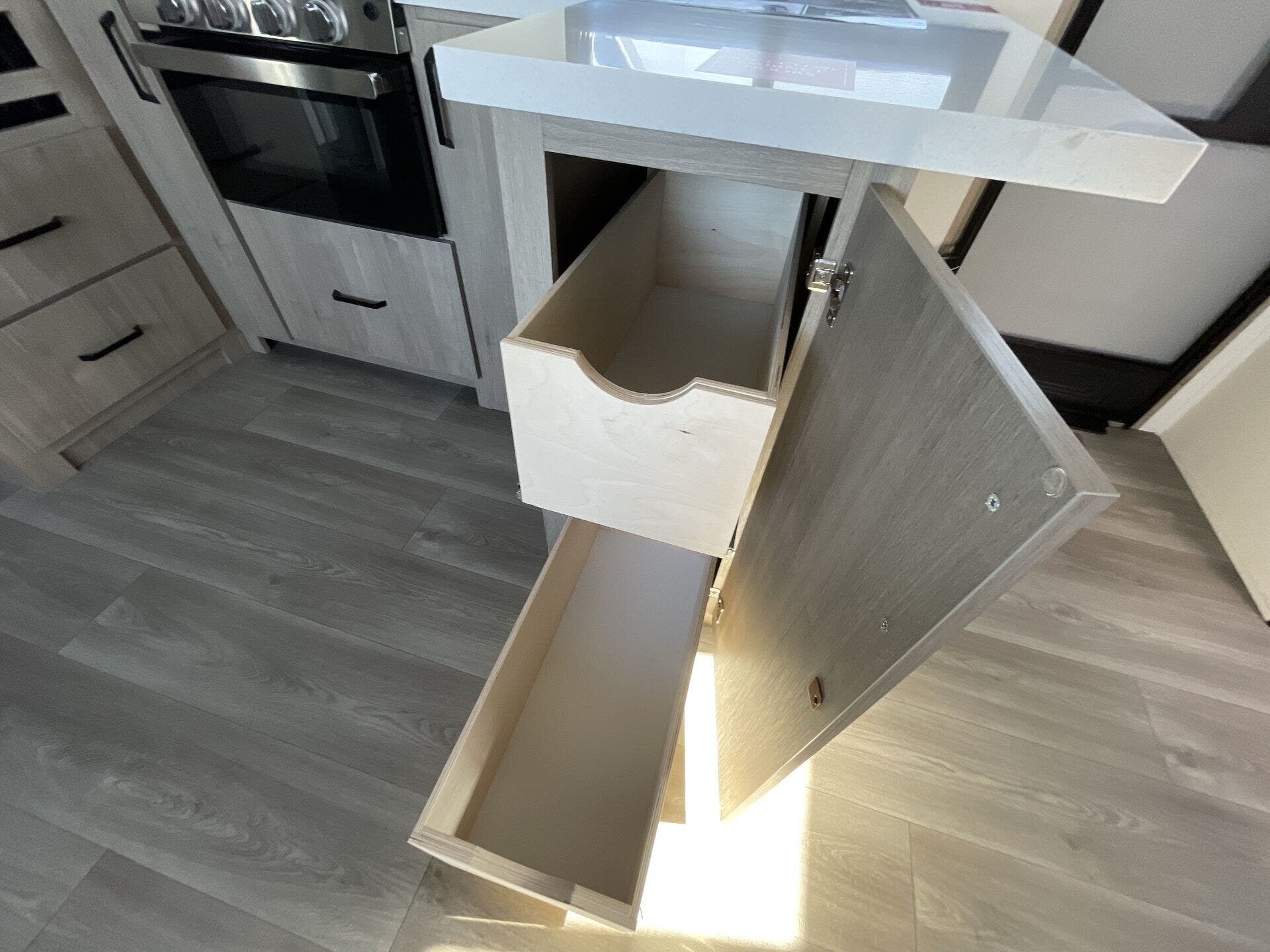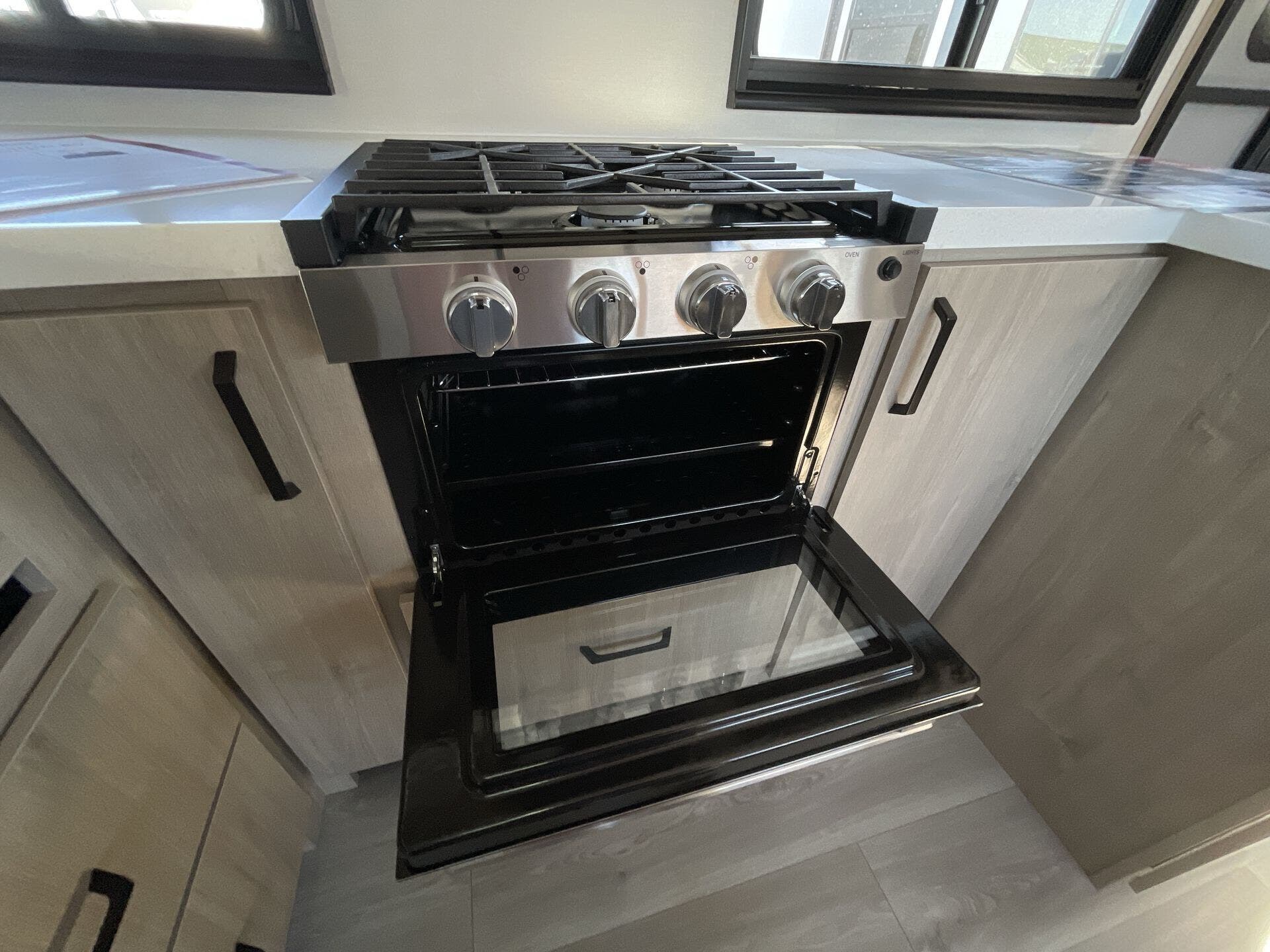 Step inside, and the 2300MK immediately impresses with its bright, open layout and upscale finishes. The rear kitchen design provides abundant counter space, stainless-steel appliances, a spacious pantry, and everything you need to prepare meals with ease. The slide-out hosts a comfortable theater seating or dinette option, perfectly positioned across from the entertainment center with a large LED TV and fireplace—ideal for cozy nights in. The dedicated desk/workstation is a standout feature, giving travelers a true workspace for remote work, hobbies, or planning the next leg of your adventure.