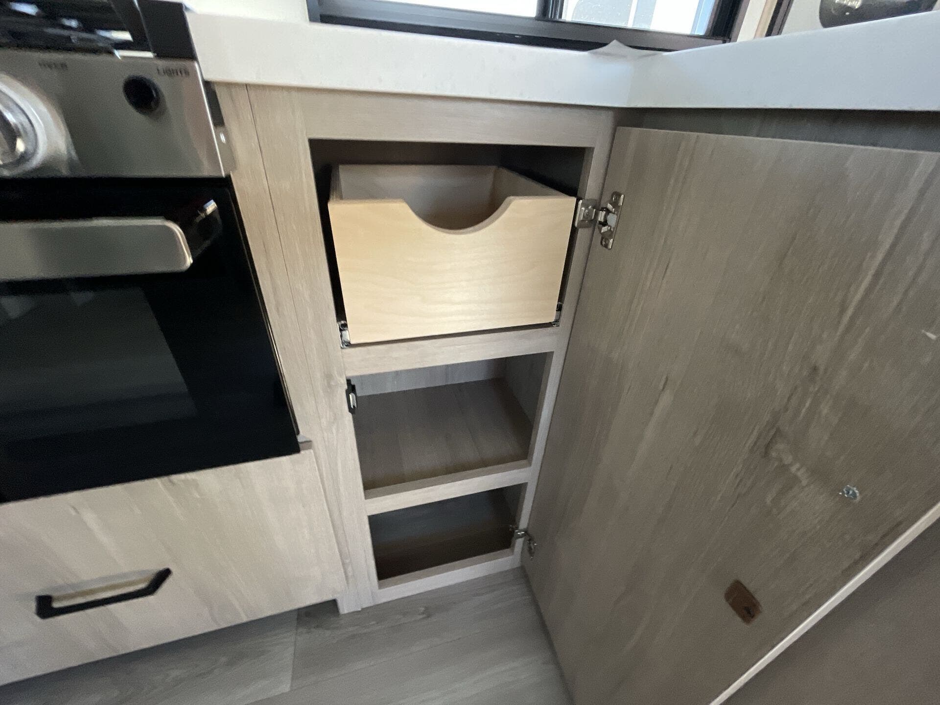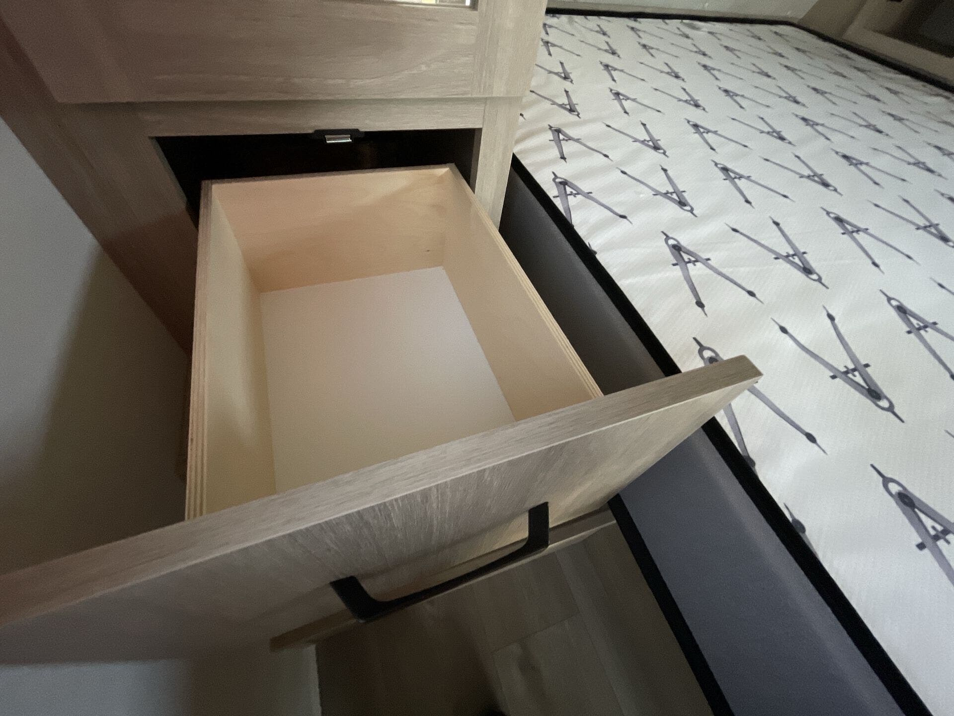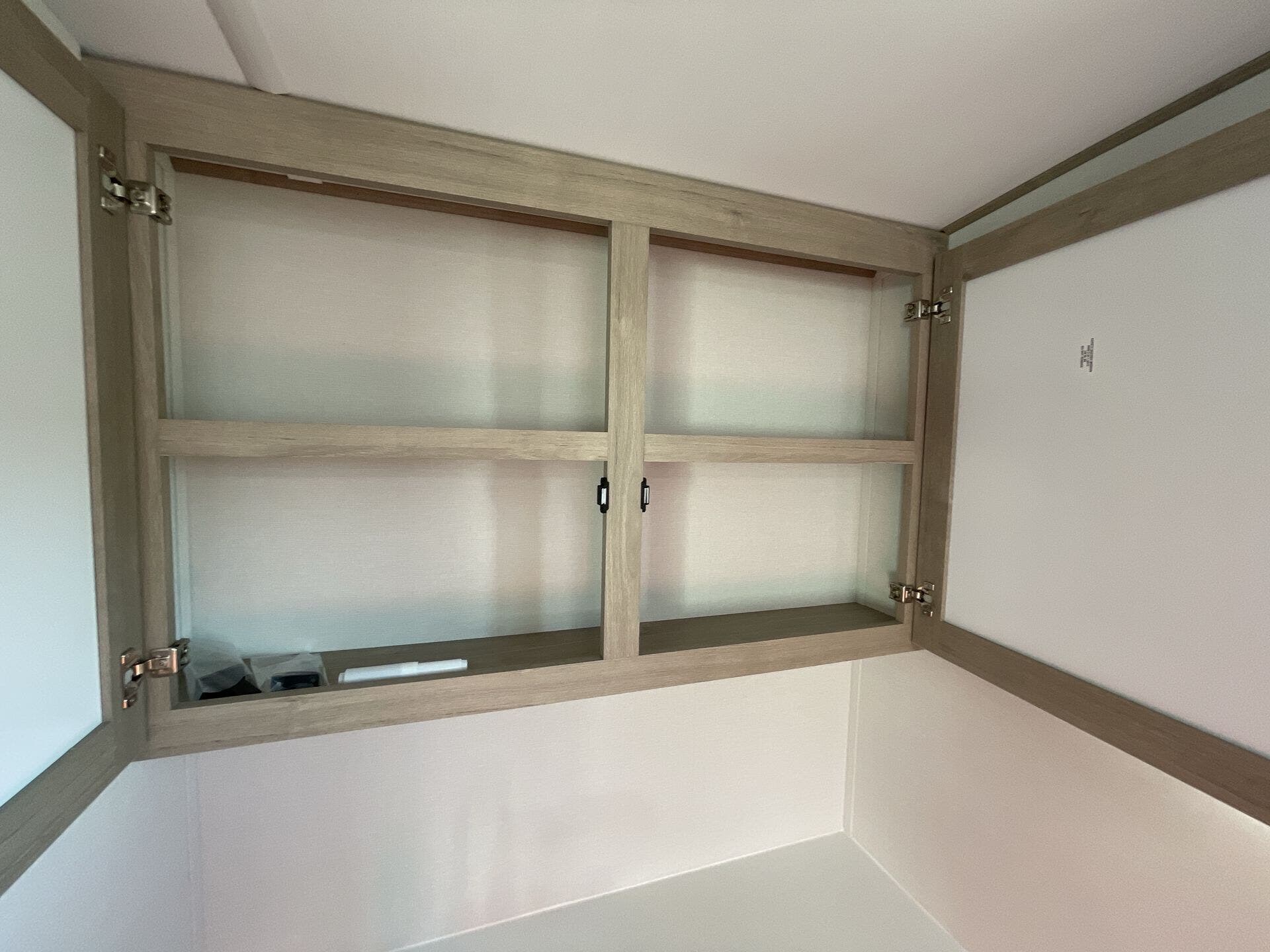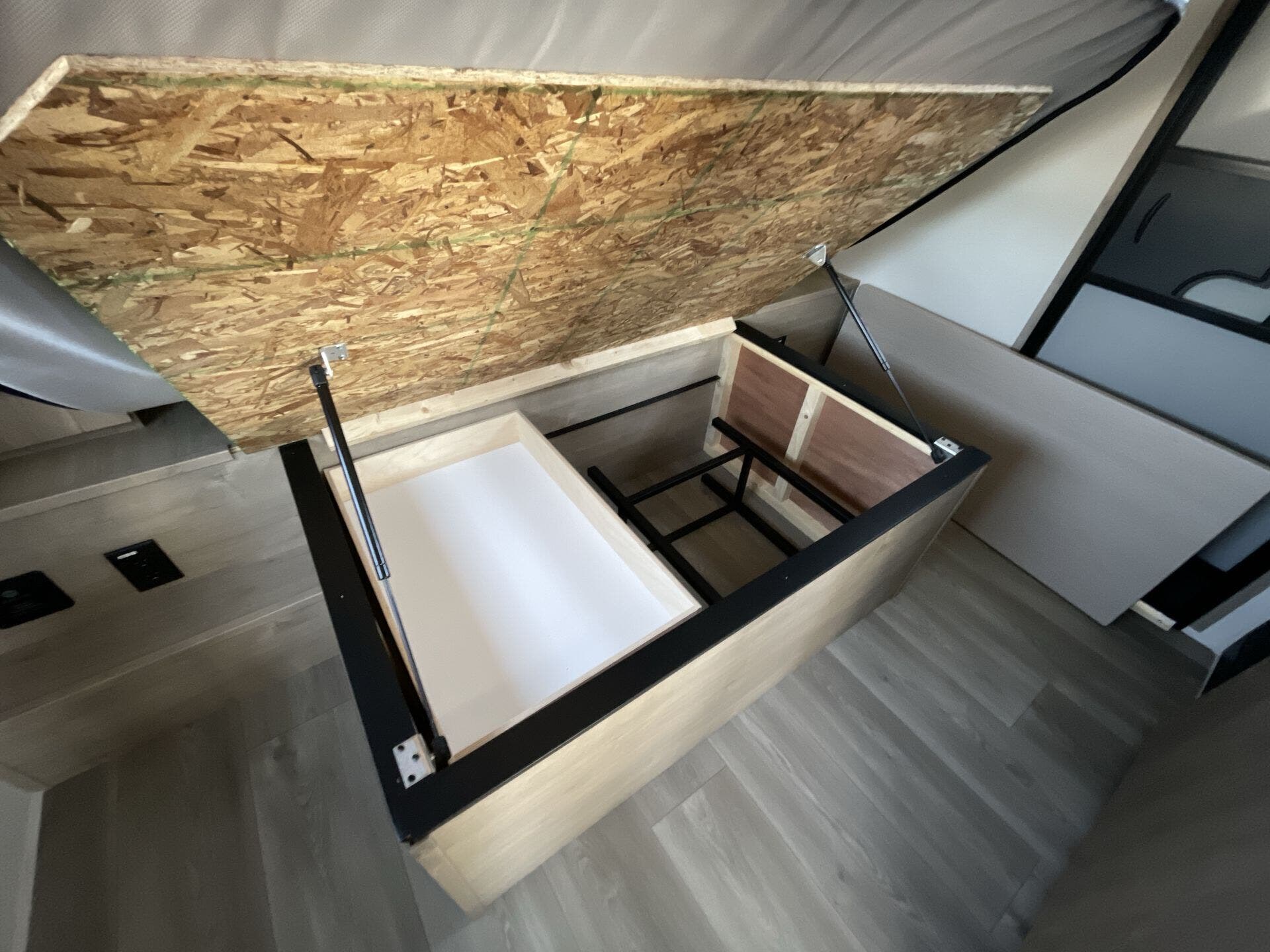 Step inside, and the 2300MK immediately impresses with its bright, open layout and upscale finishes. The rear kitchen design provides abundant counter space, stainless-steel appliances, a spacious pantry, and everything you need to prepare meals with ease. The slide-out hosts a comfortable theater seating or dinette option, perfectly positioned across from the entertainment center with a large LED TV and fireplace—ideal for cozy nights in. The dedicated desk/workstation is a standout feature, giving travelers a true workspace for remote work, hobbies, or planning the next leg of your adventure.