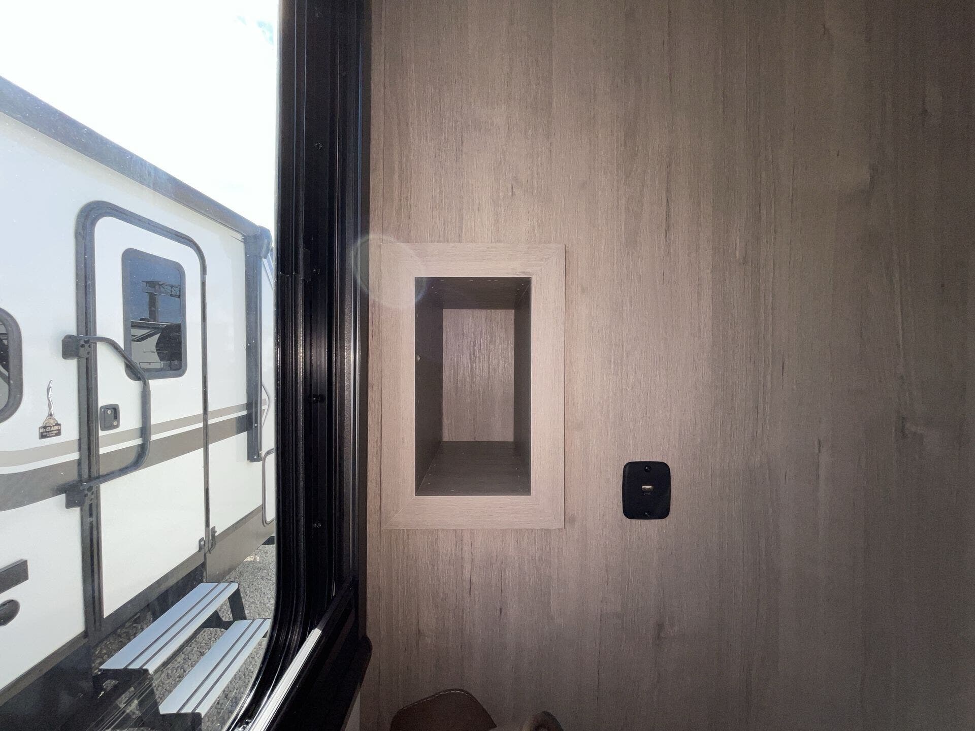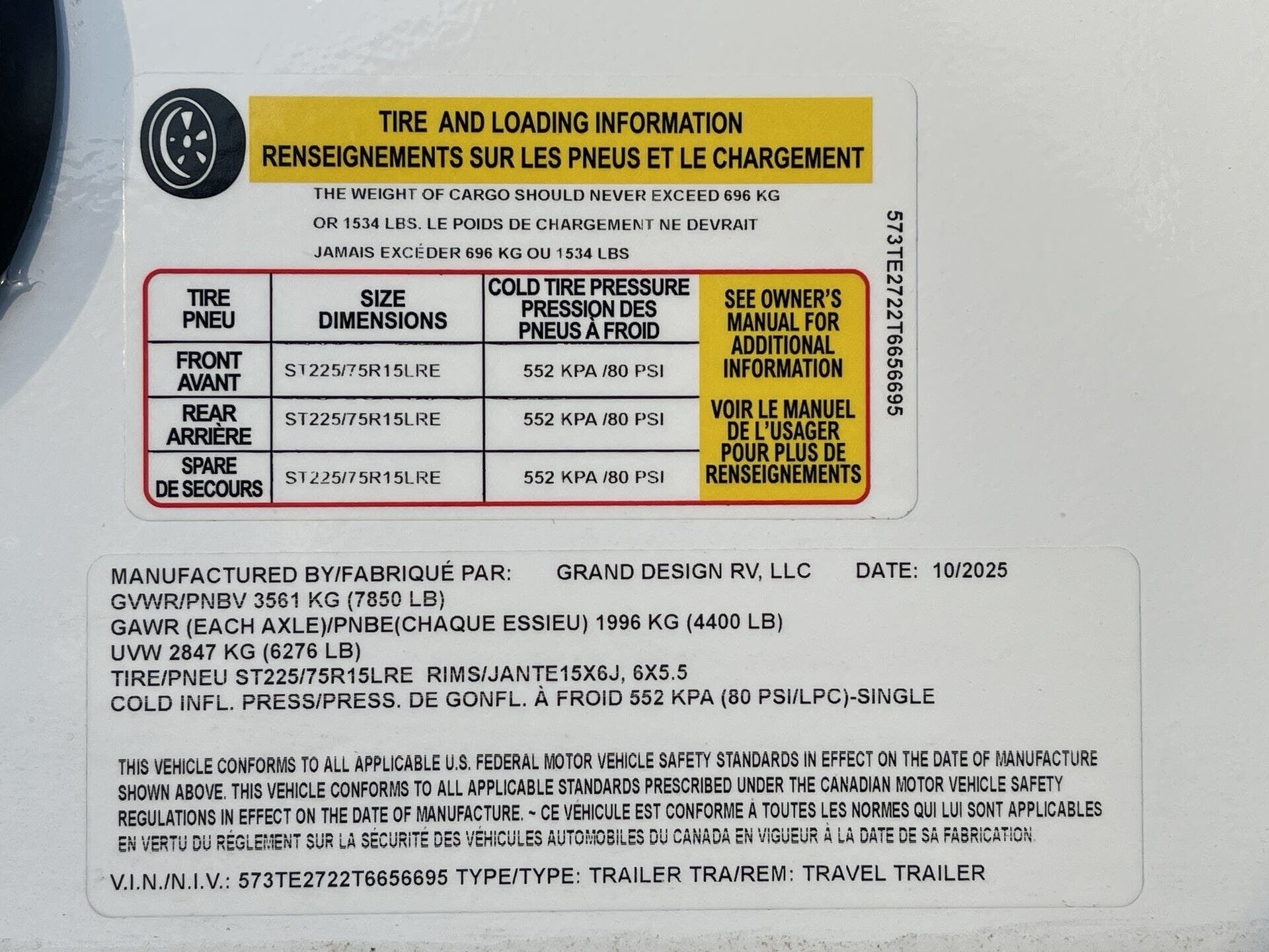 Awning, Black Tank Flush, Detachable, Detachable Power Cord, Enclosed Underbelly, Hitch, Ladder, Pass Thru Storage, Power Awning, Roof Vent, Screen Door, Slam Latch Baggage Doors, Spare Tire Kit -