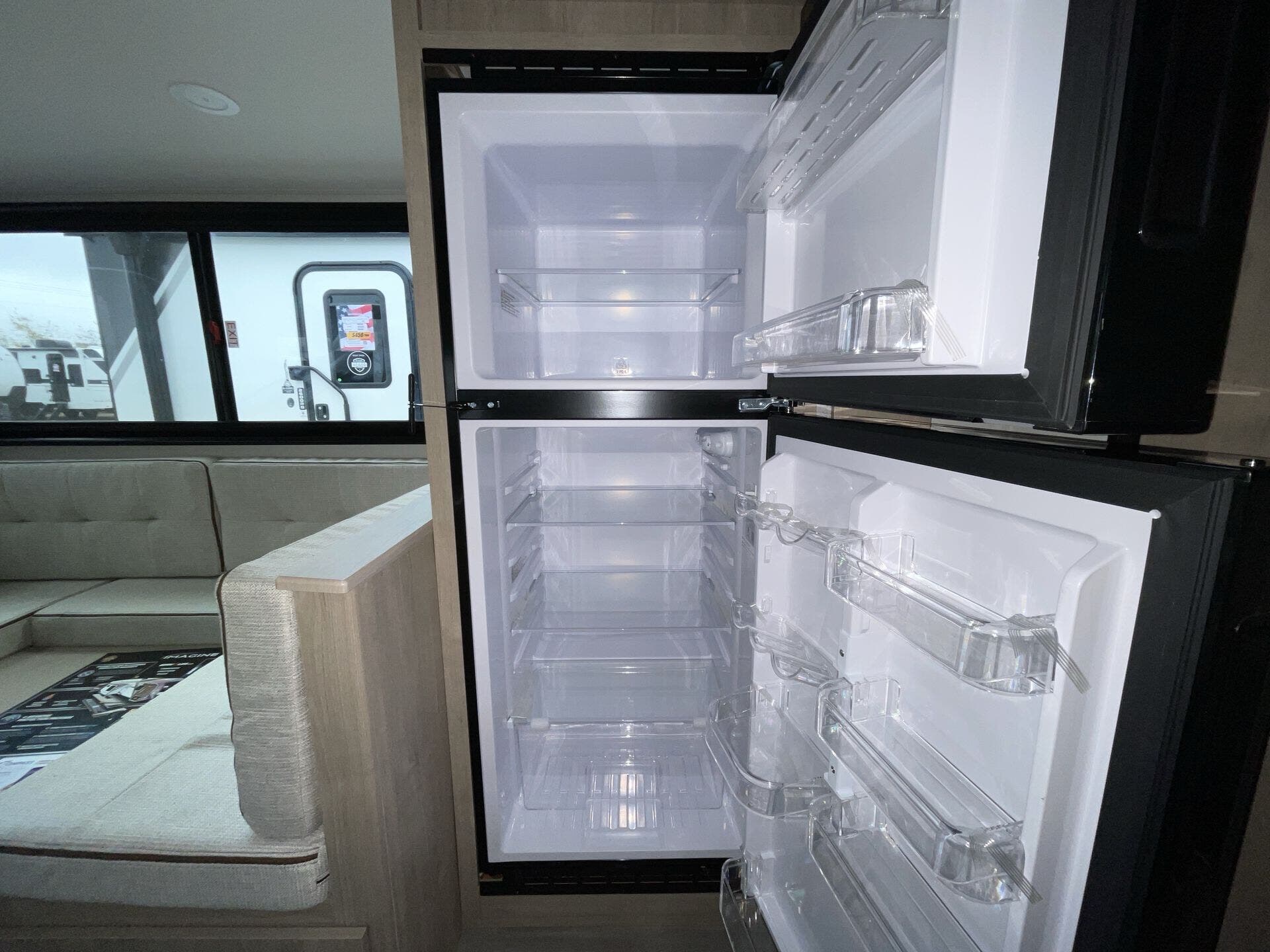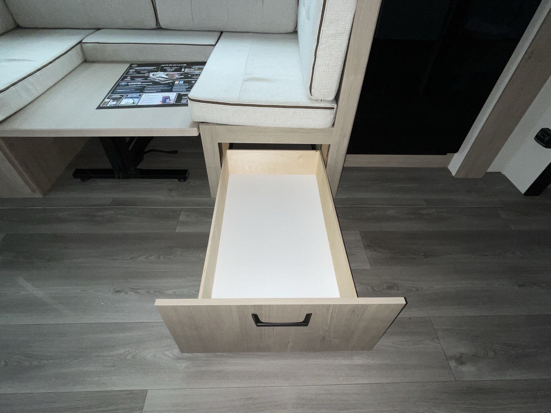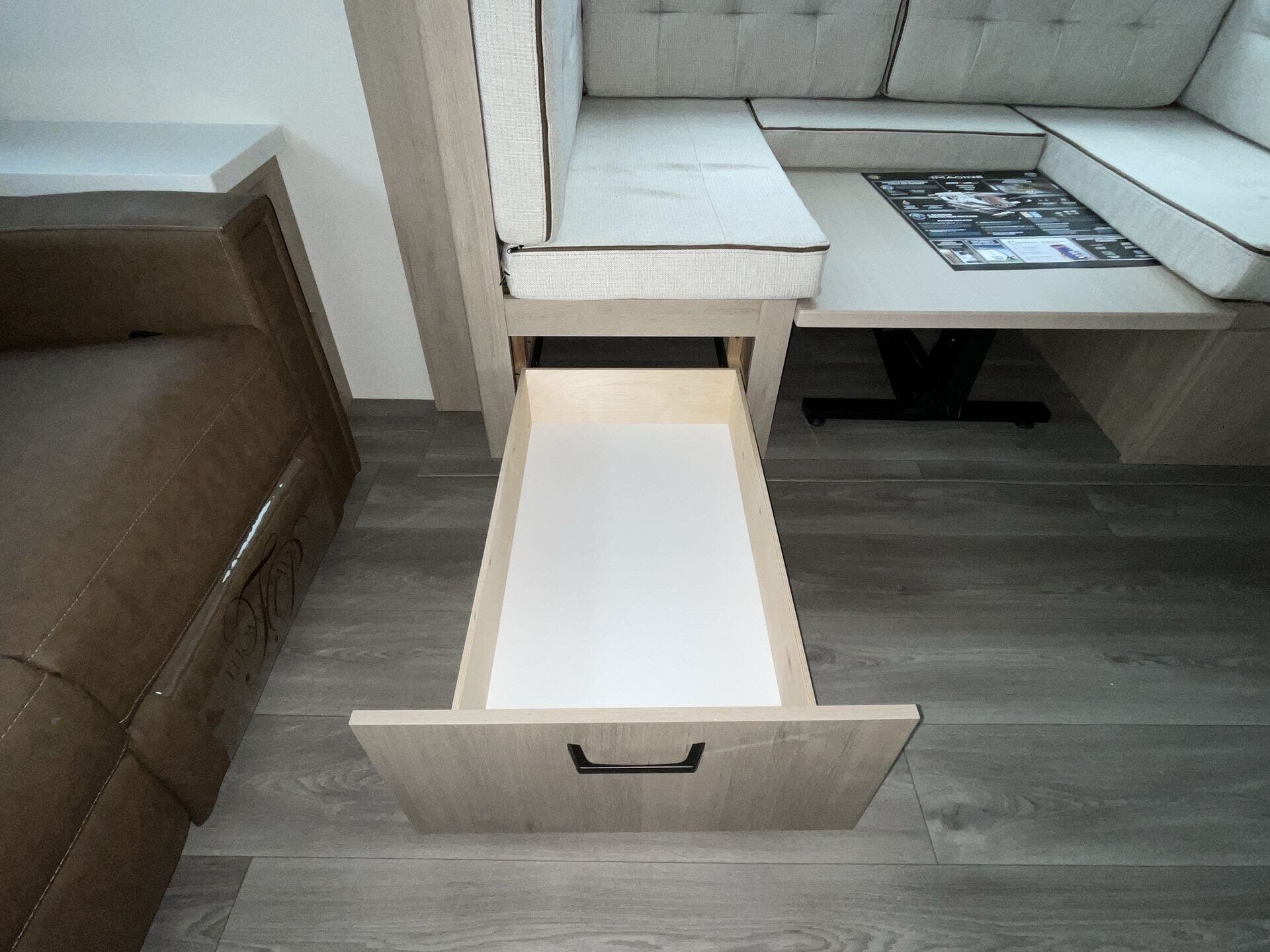 Up front you get a queen bed and a full-size private bedroom. Back in the living area, you’ve got enough space with booth dinette and the kitchen and bath are laid out sensibly.