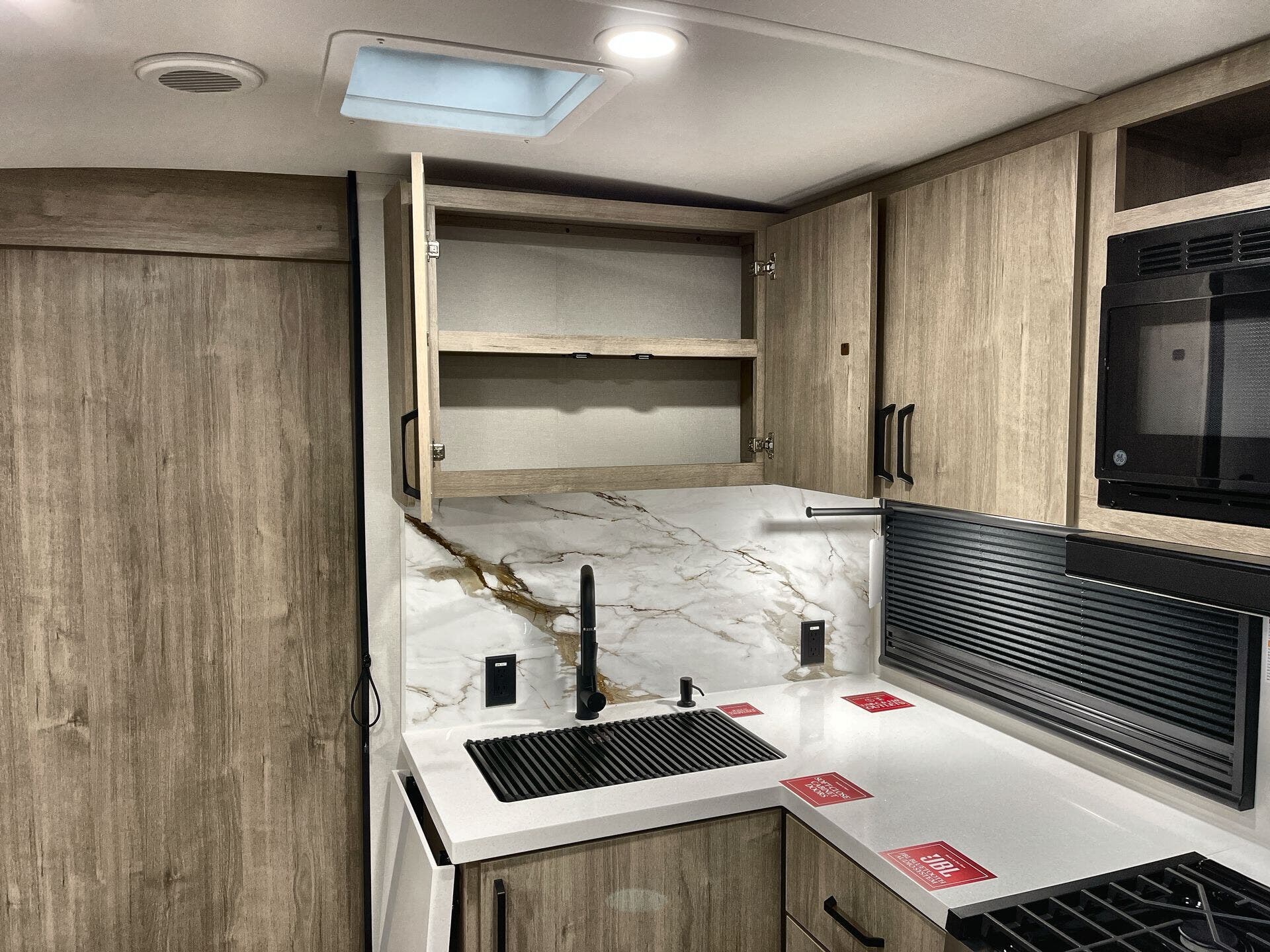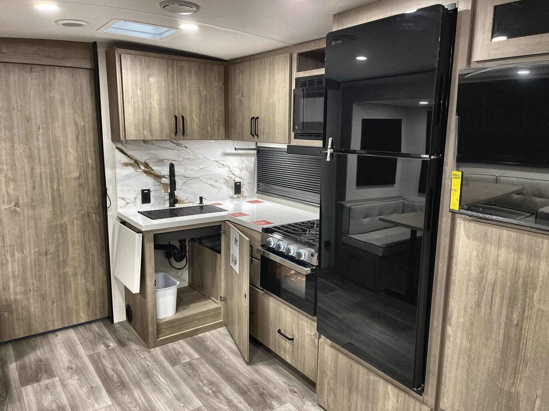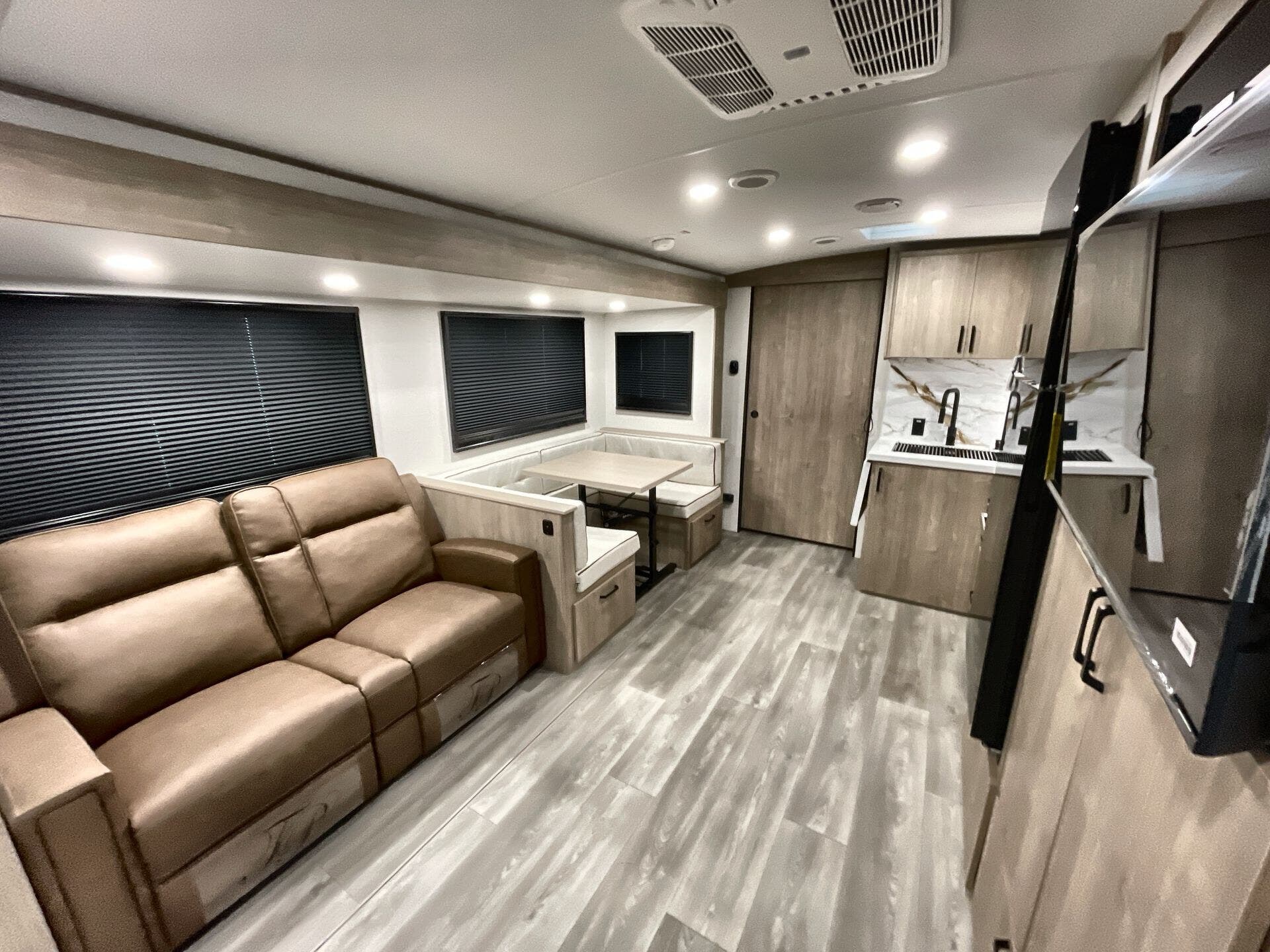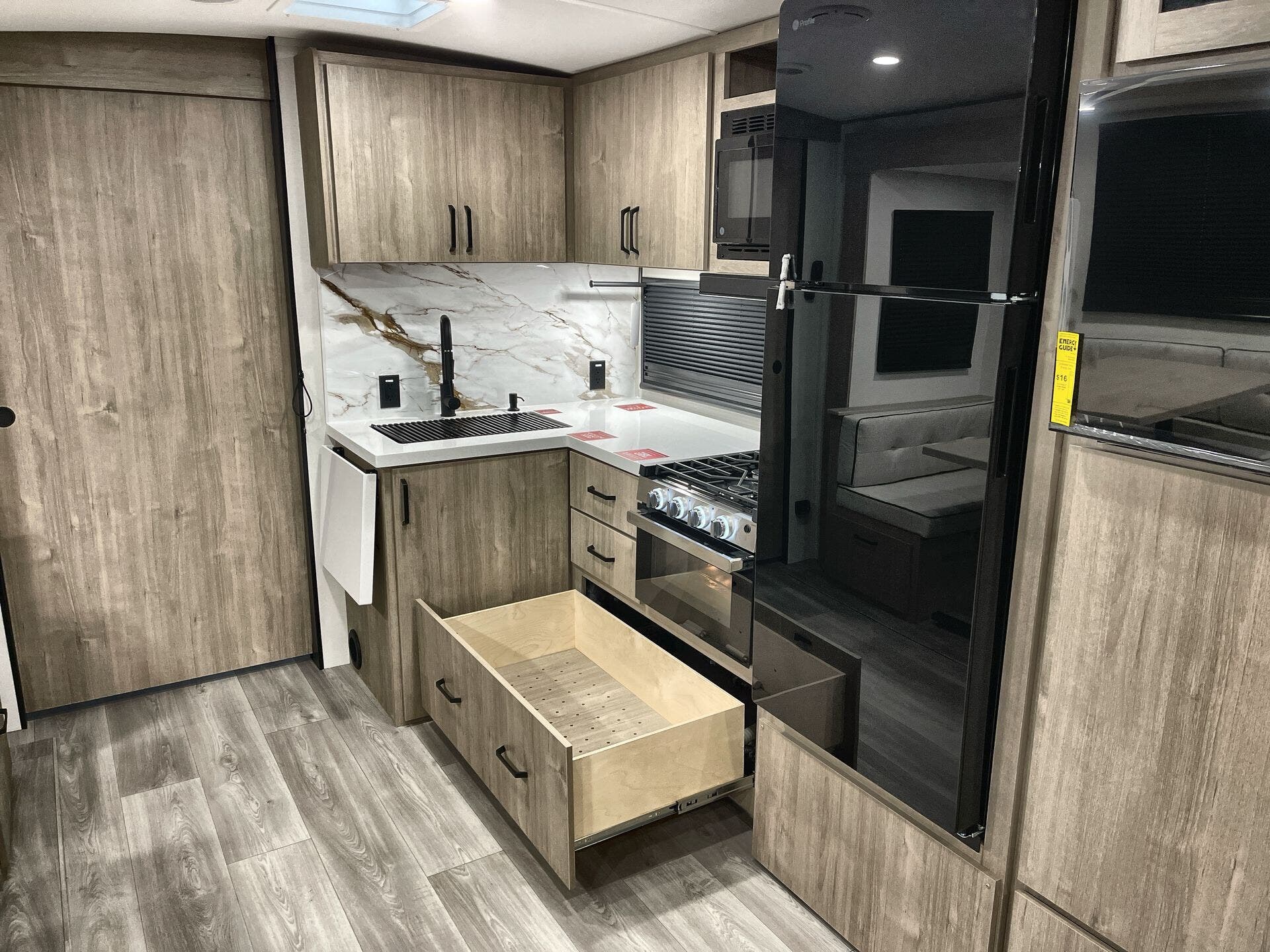 Inside, the Imagine 2600RB accommodates up to six travelers, making it ideal for family adventures or group excursions. The front bedroom offers a comfortable Queen bed with ample storage for clothes and personal items, creating a private retreat after a day of exploring. The well-equipped kitchen includes a microwave, oven, refrigerator, and a reliable water heater, empowering you to cook, bake, and serve meals with ease. A dedicated living area features a TV, bright LED lighting, and a skylight that brightens the space, while the durable furnishings and thoughtful cabinetry provide everyday practicality and longevity for years of recreation.