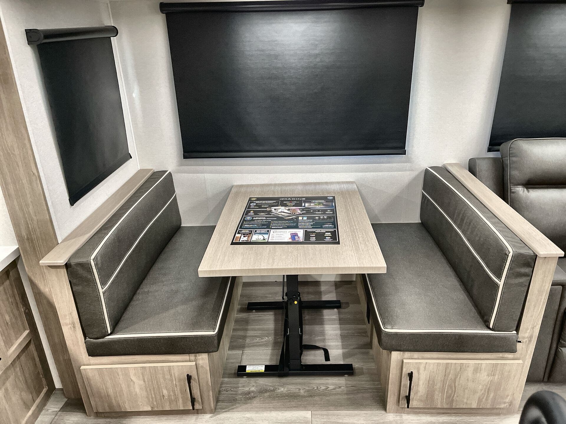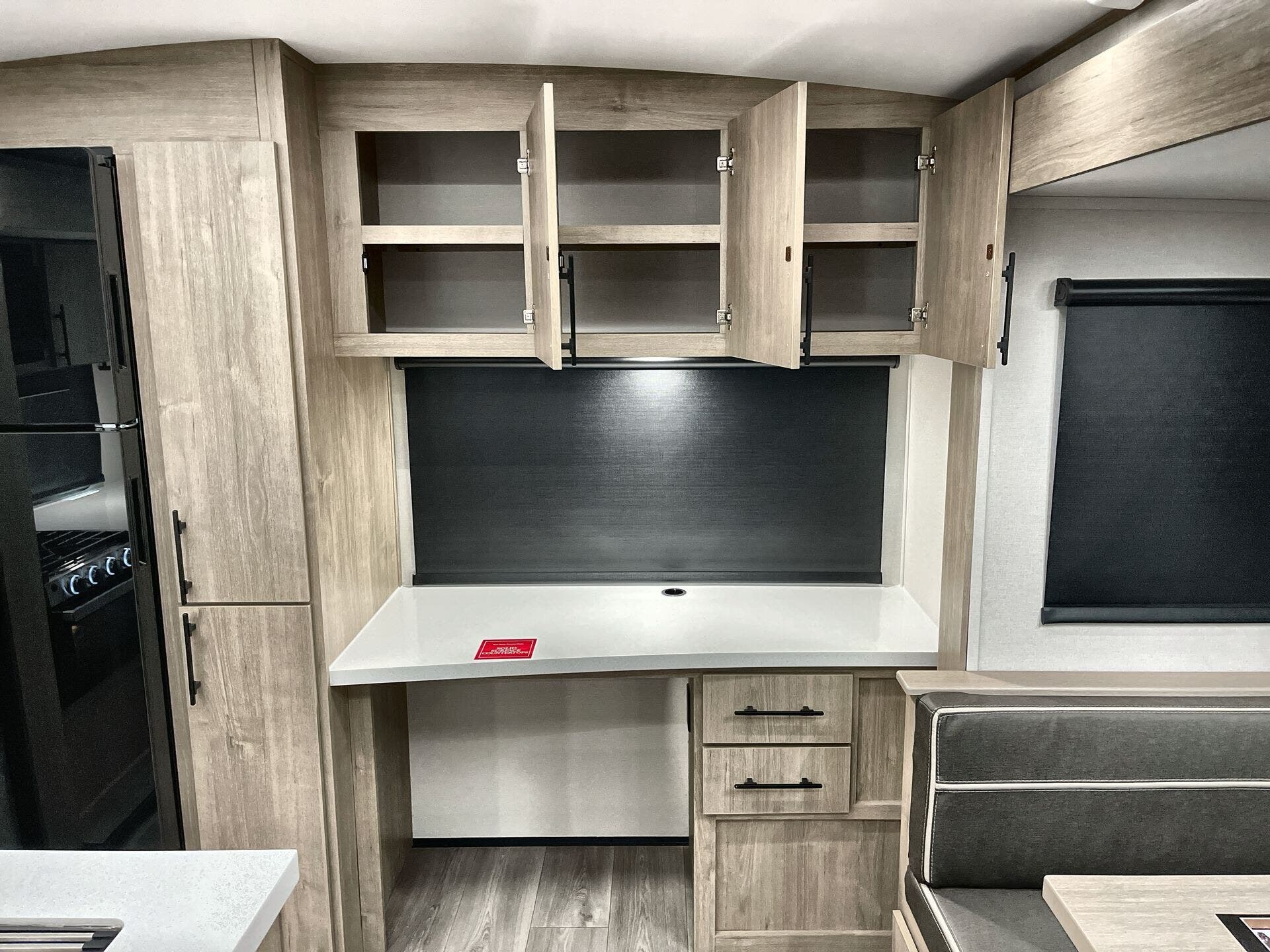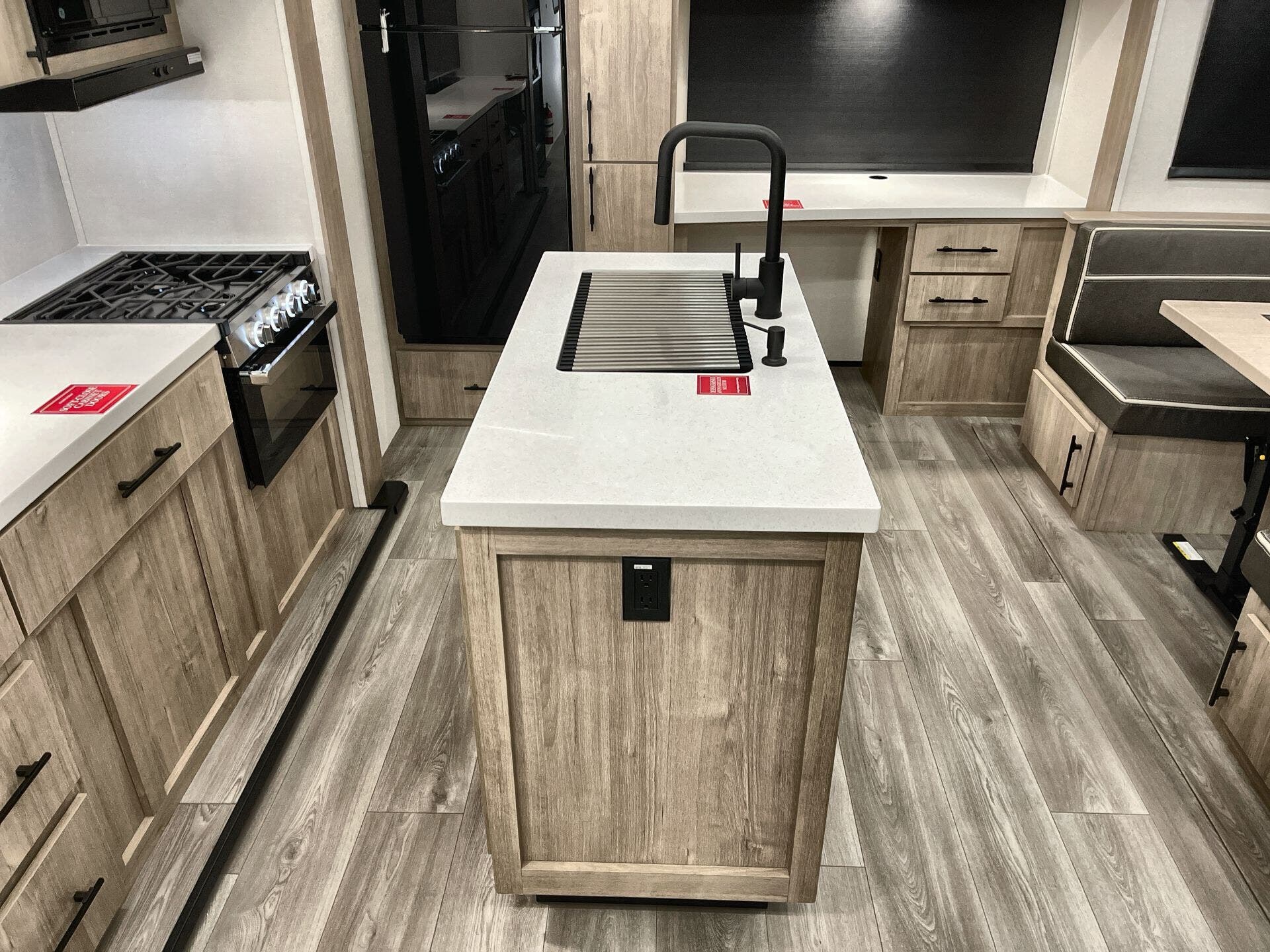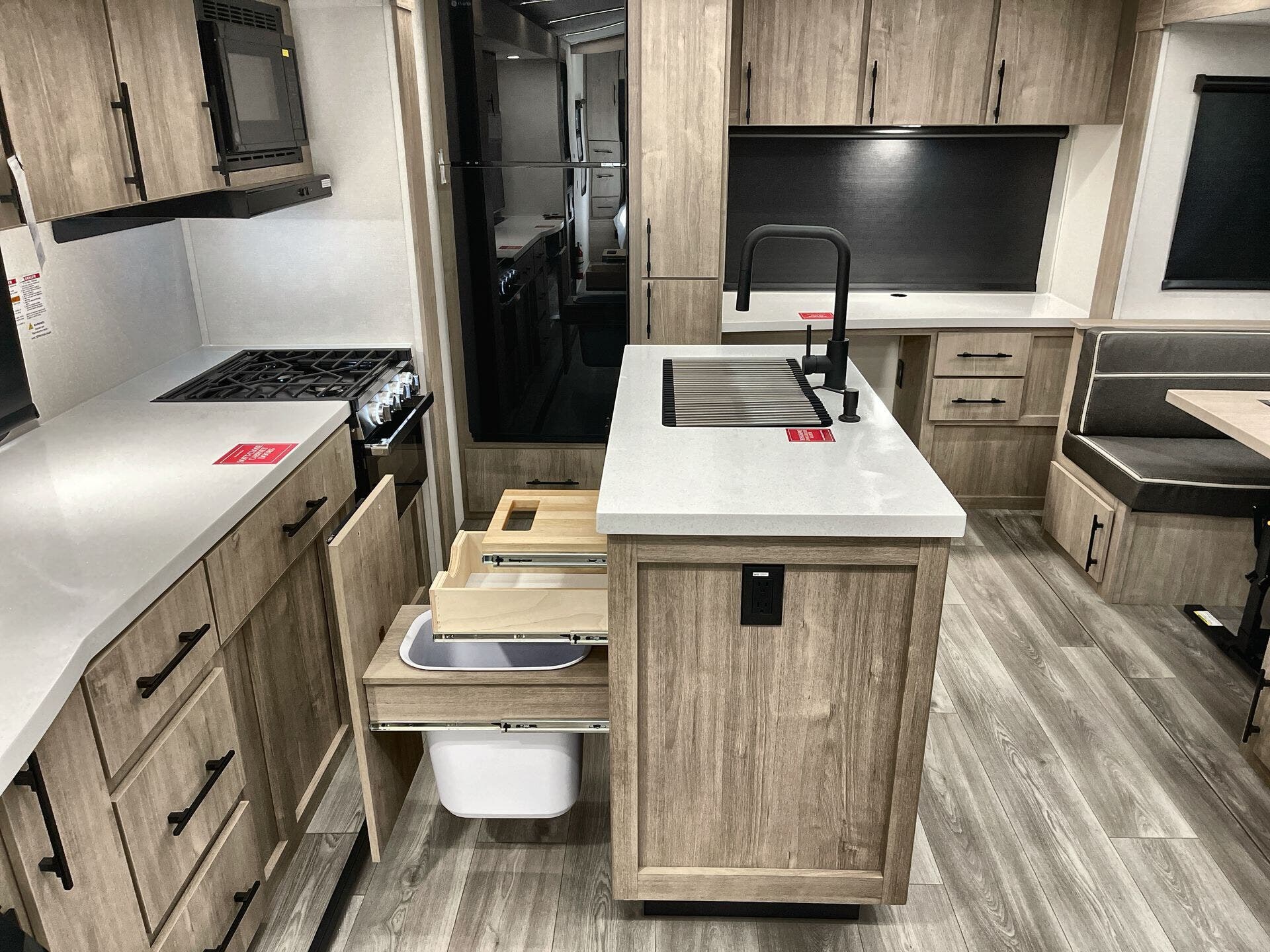 Booth Dinette, Island Kitchen, Kitchen Sink, Medicine Cabinet, Overhead Cabinetry, Pantry, Queen Bed, Shower, Toilet