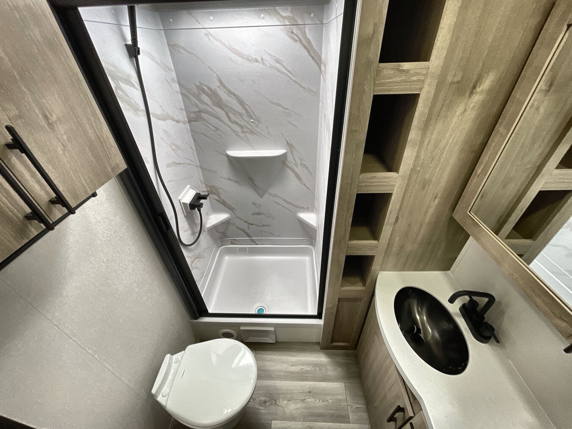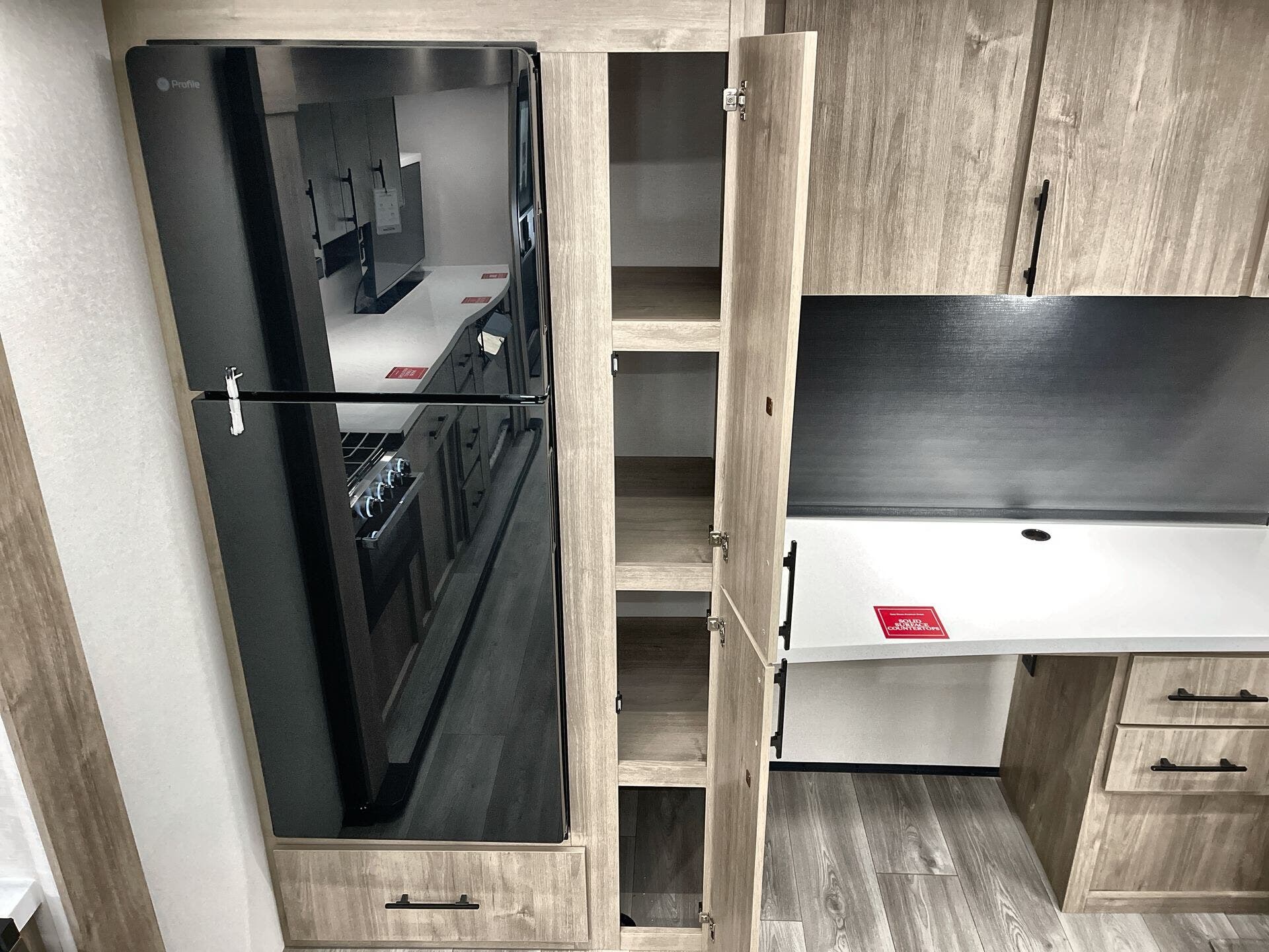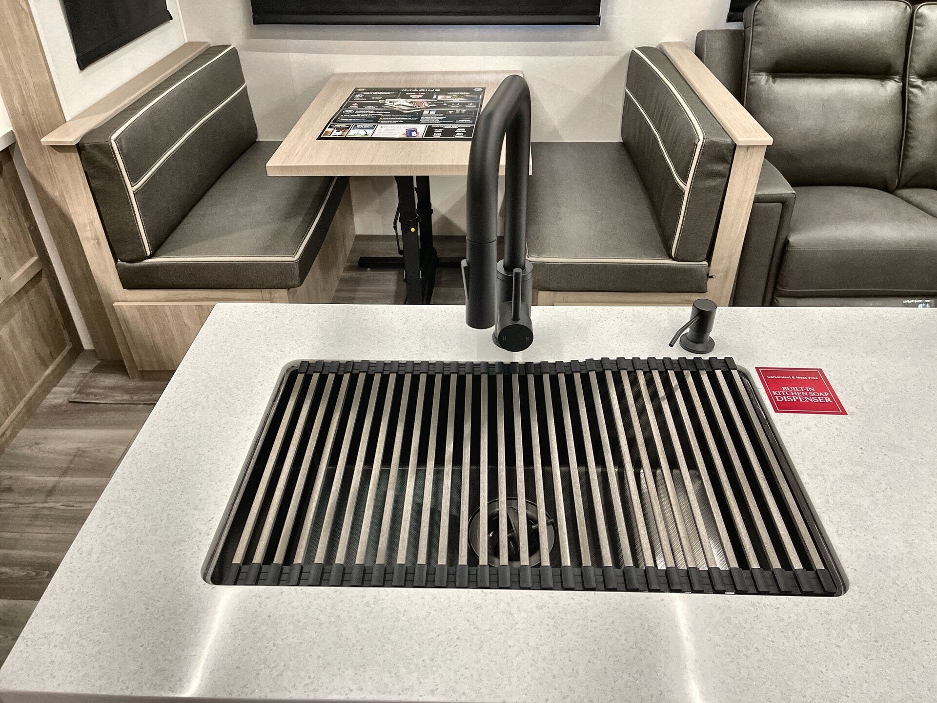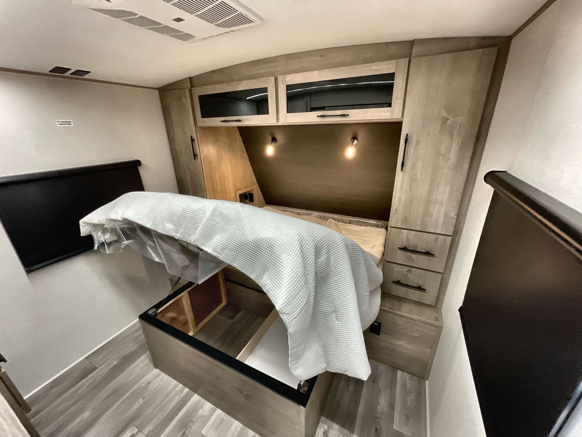 Booth Dinette, Island Kitchen, Kitchen Sink, Medicine Cabinet, Overhead Cabinetry, Pantry, Queen Bed, Shower, Toilet