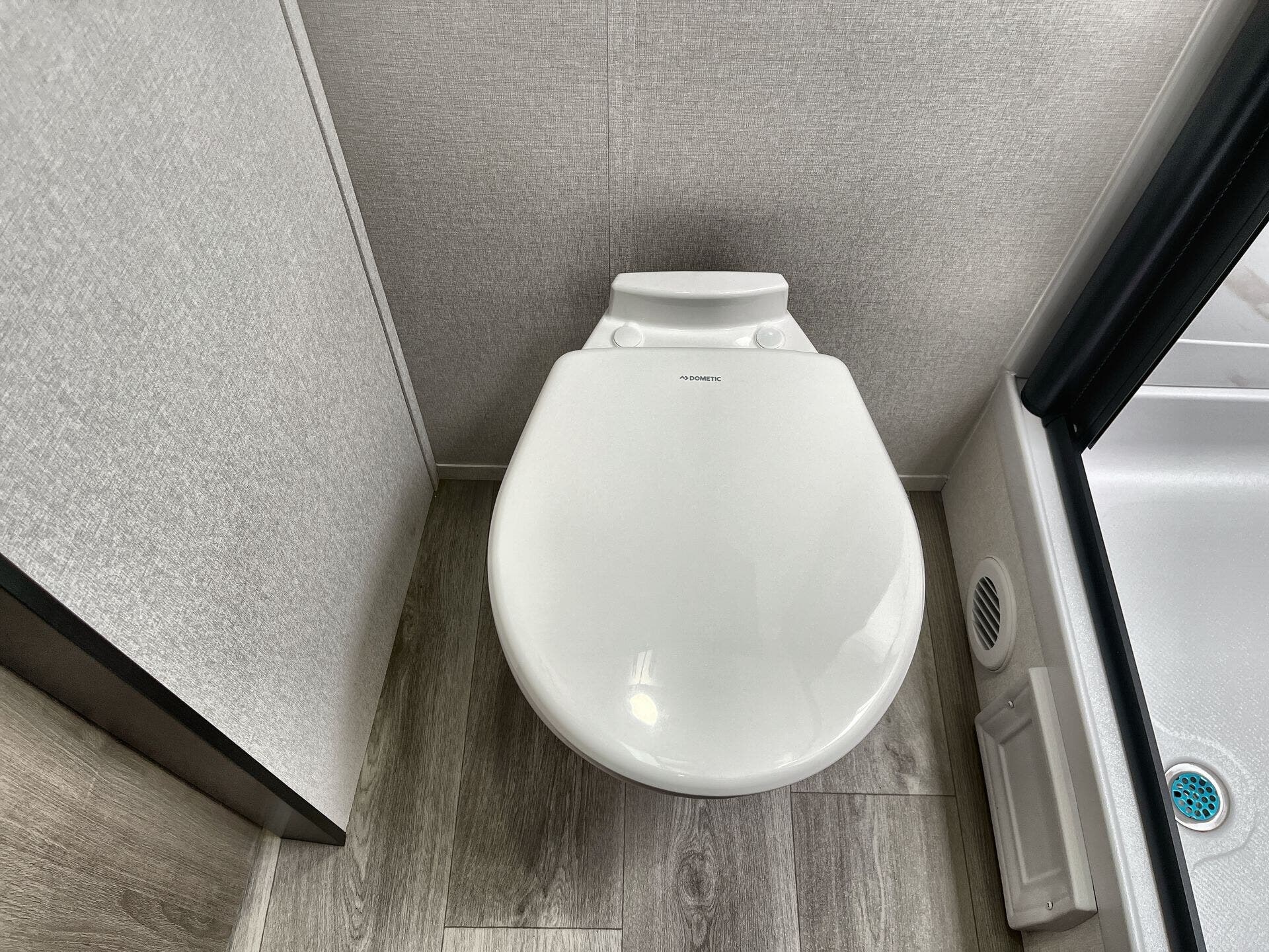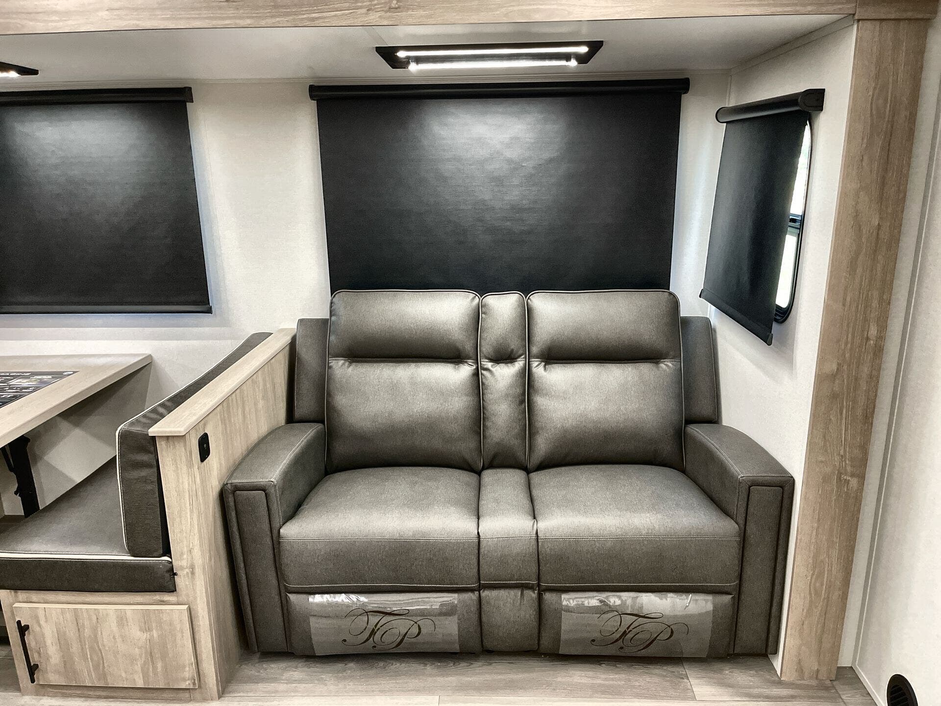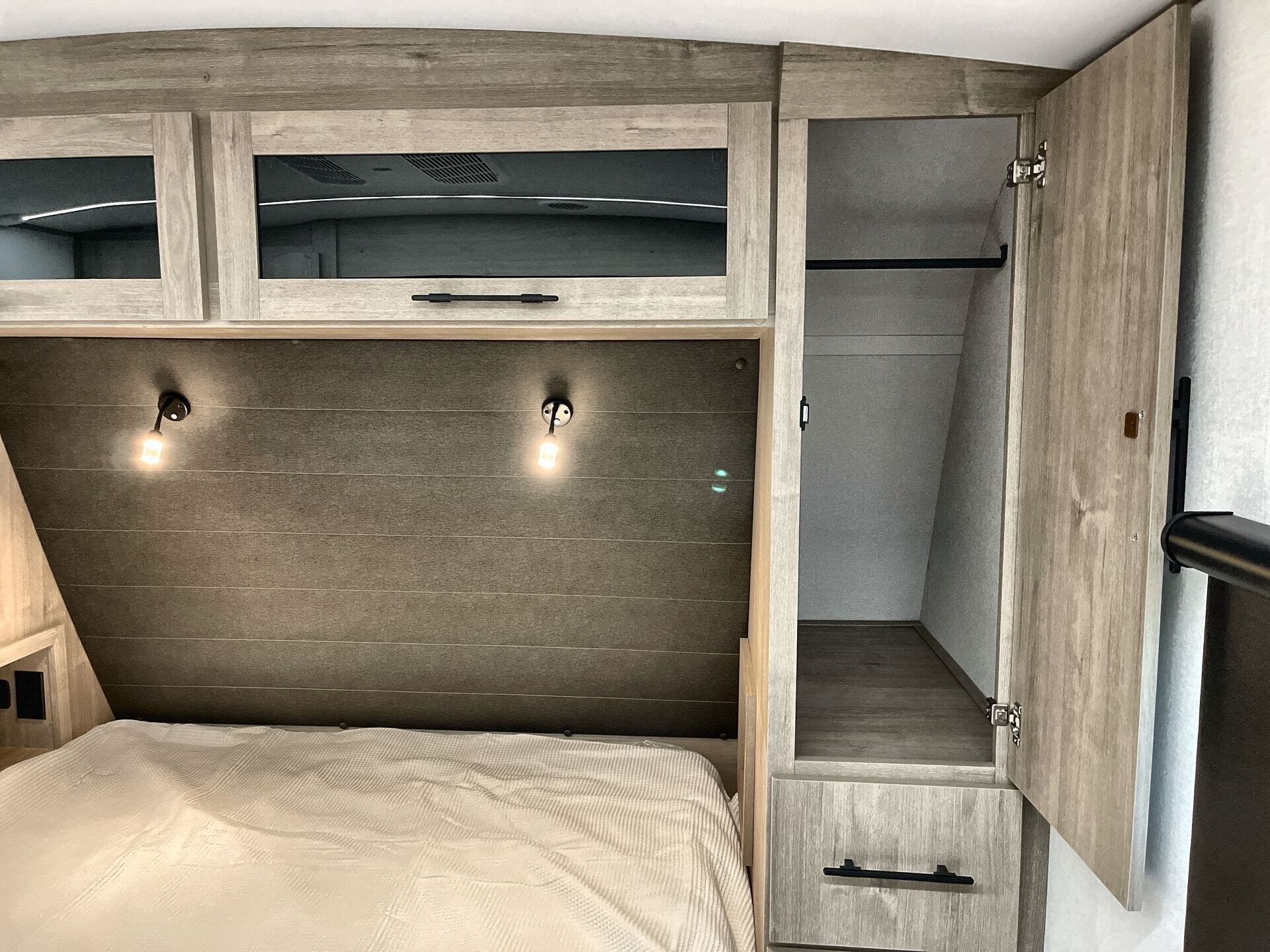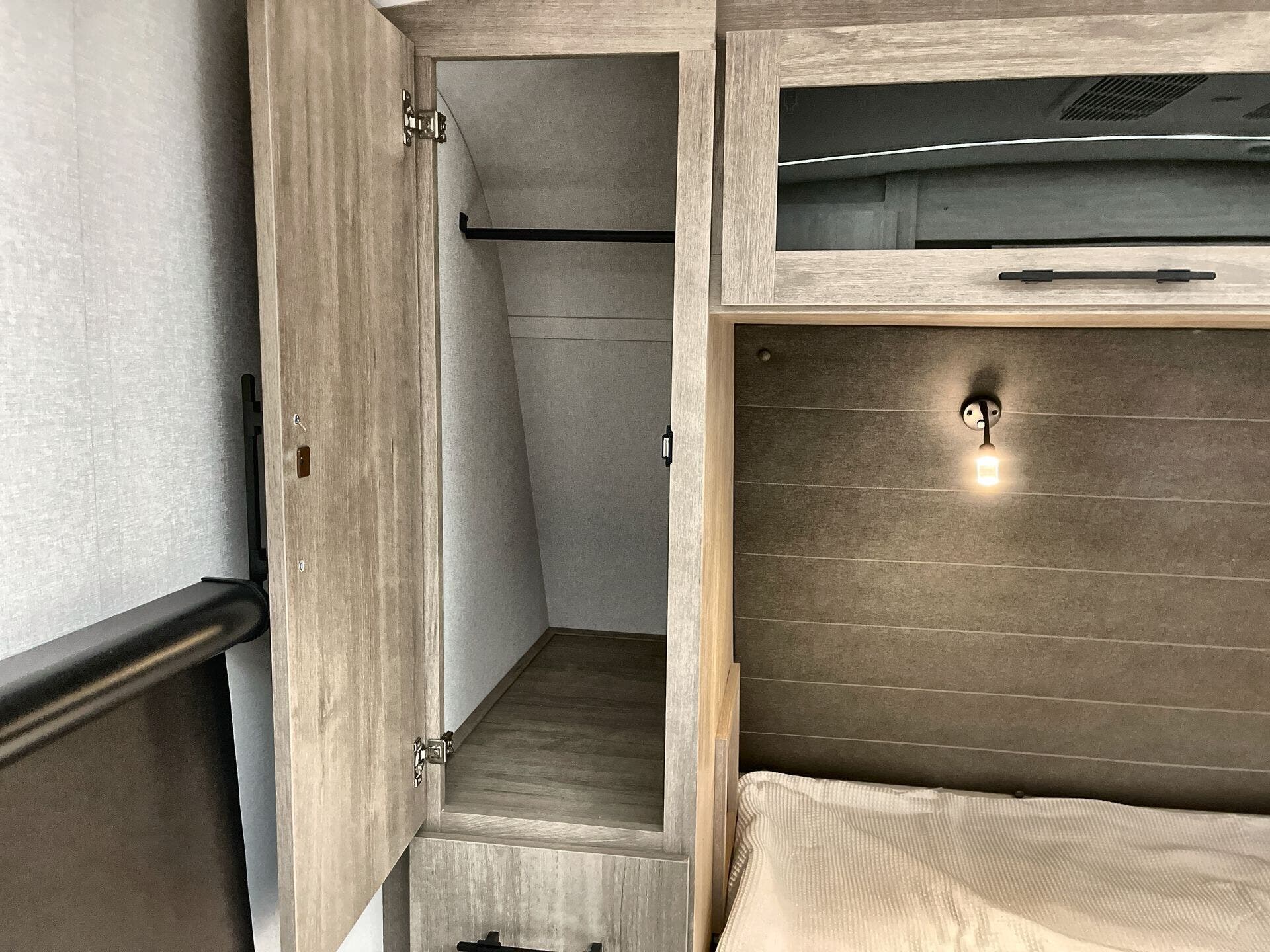 Booth Dinette, Island Kitchen, Kitchen Sink, Medicine Cabinet, Overhead Cabinetry, Pantry, Queen Bed, Shower, Toilet