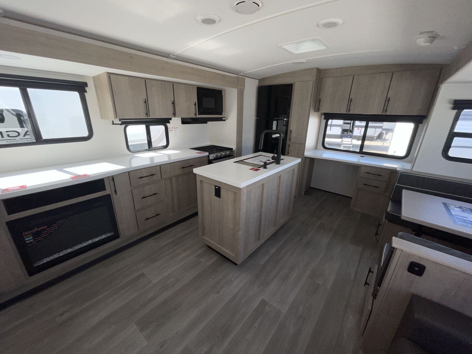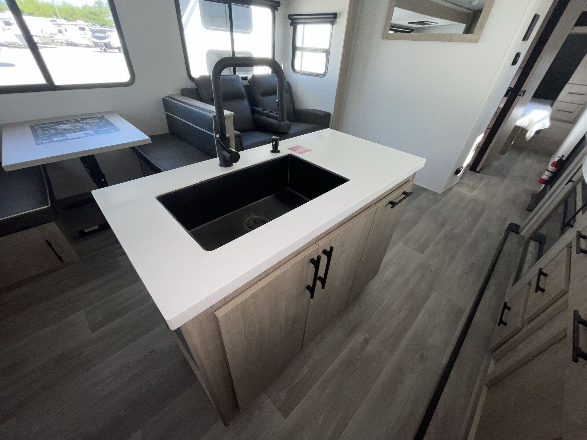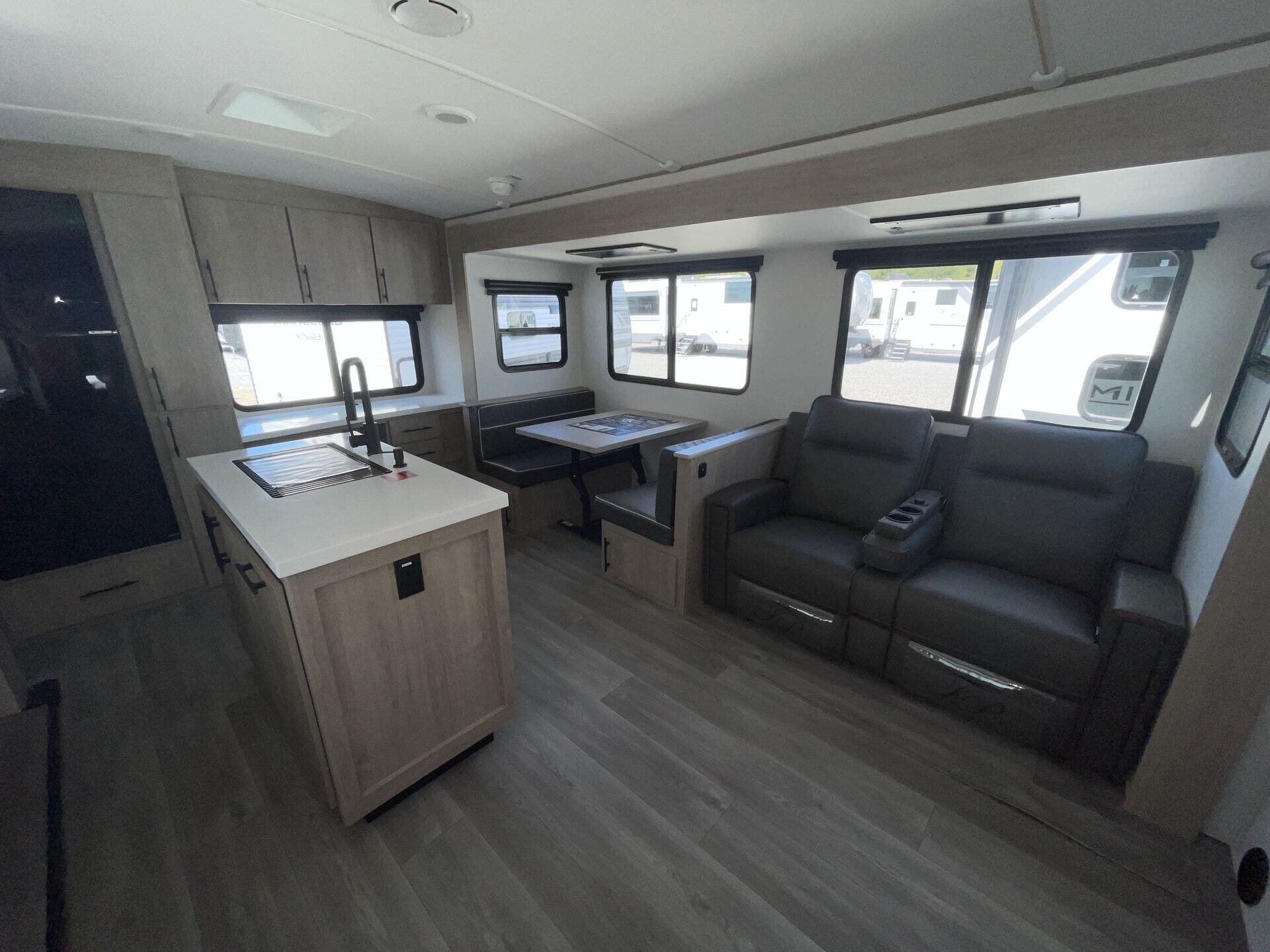Inside, the rear kitchen layout provides an abundance of counter space, solid-surface countertops, stainless steel appliances, and a deep farmhouse sink—perfect for cooking meals on the road. The large slide-out opens the living area, where you’ll find theater seating or a tri-fold sofa, a booth dinette, and a full entertainment center with a fireplace, making it a cozy retreat after a day outdoors. A dedicated desk workspace adds even more flexibility, making the 2670MK especially appealing for remote workers or those who want a spot to stay organized while traveling.