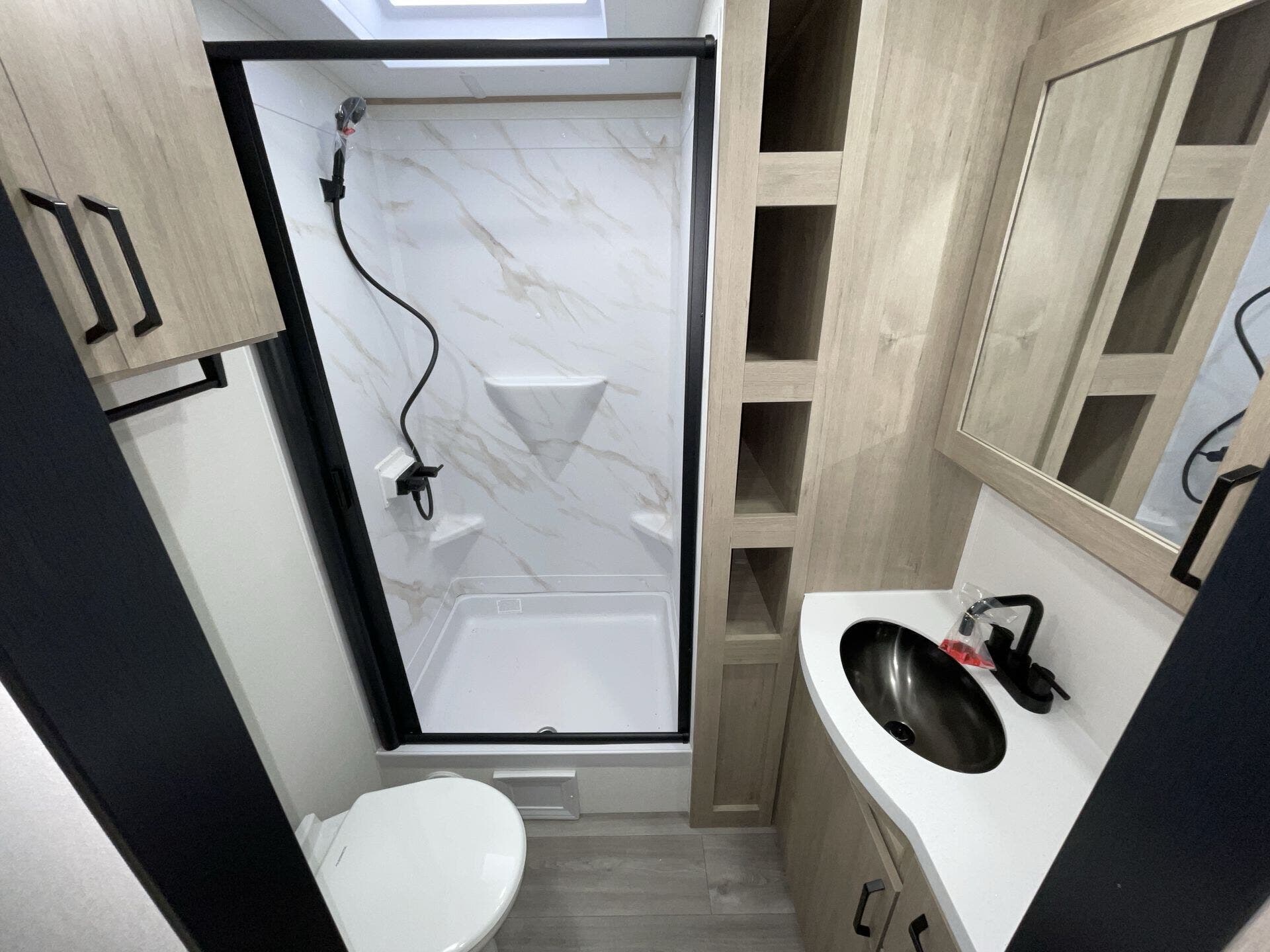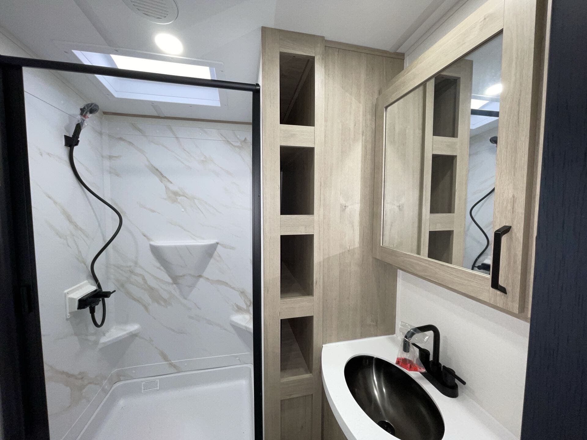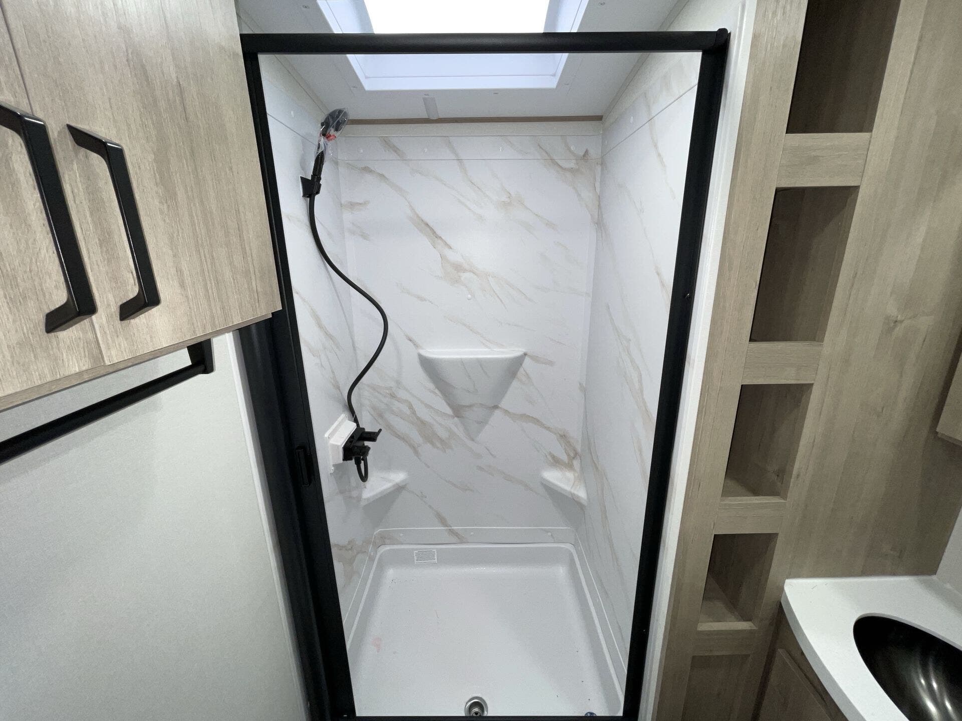 Spacious bathroom with residential height shower