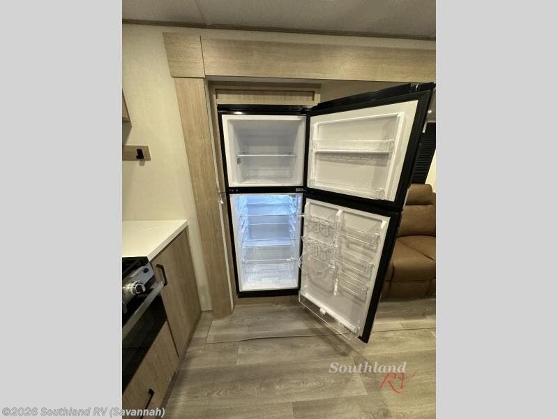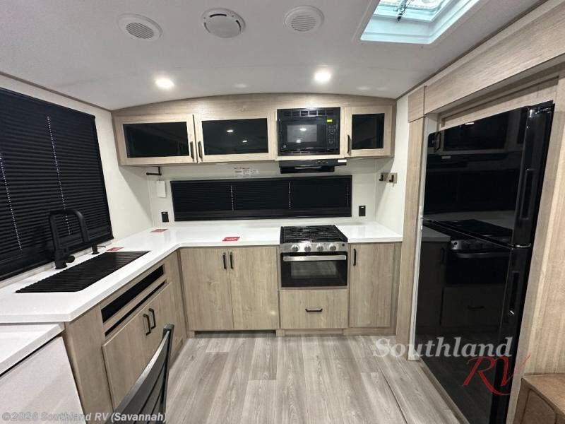 At the front of the 2700BS trailer, you’ll find a spacious full bedroom featuring a 70" x 80" king bed housed in one of two slide outs, offering both generous space and a comfortable night’s rest. The room also includes a wardrobe and dresser, providing ample storage for clothing and essentials. Moving toward the center, the walk-through bathroom boasts a 30" x 36" residential walk-in shower with a skylight, a toilet, and a sink opposite a mirrored medicine cabinet for added convenience and storage. At the rear, the open-concept kitchen and living area make excellent use of the second slide out, which includes cozy theater seating, perfect for dining or relaxing while watching TV. Next to it sits a 10-cu. ft. refrigerator, offering plenty of room for groceries and refreshments. Across the space, the L-shaped kitchen spans the entire rear wall, giving you extensive countertop room for meal prep. Equipped with a three-burner range, oven, microwave, and stainless steel sink, this kitchen allows you to cook in comfort and style without relying on campsite facilities.