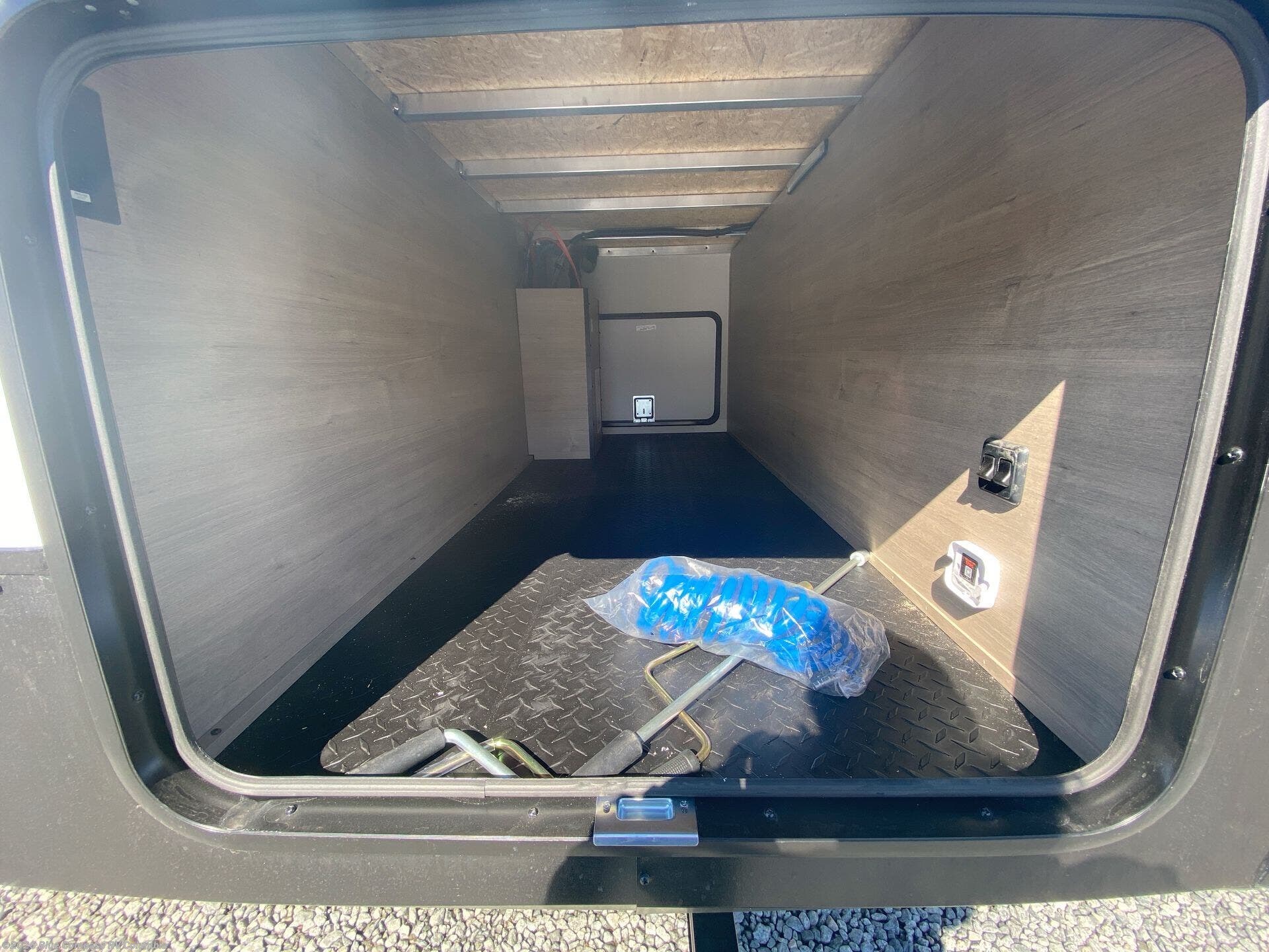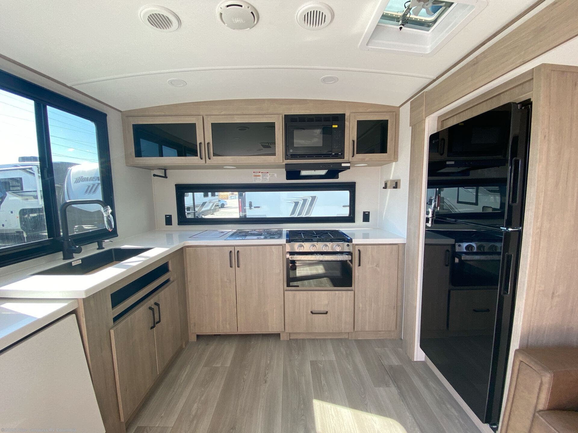 At the front of the 2700BS trailer, you’ll find a spacious full bedroom featuring a 70" x 80" king bed housed in one of two slide outs, offering both generous space and a comfortable night’s rest. The room also includes a wardrobe and dresser, providing ample storage for clothing and essentials. Moving toward the center, the walk-through bathroom boasts a 30" x 36" residential walk-in shower with a skylight, a toilet, and a sink opposite a mirrored medicine cabinet for added convenience and storage. At the rear, the open-concept kitchen and living area make excellent use of the second slide out, which includes cozy theater seating, perfect for dining or relaxing while watching TV. Next to it sits a 10-cu. ft. refrigerator, offering plenty of room for groceries and refreshments. Across the space, the L-shaped kitchen spans the entire rear wall, giving you extensive countertop room for meal prep. Equipped with a three-burner range, oven, microwave, and stainless steel sink, this kitchen allows you to cook in comfort and style without relying on campsite facilities.