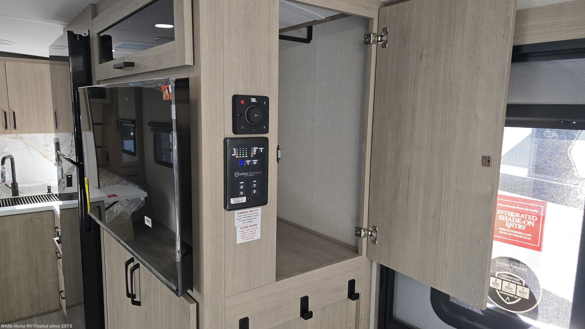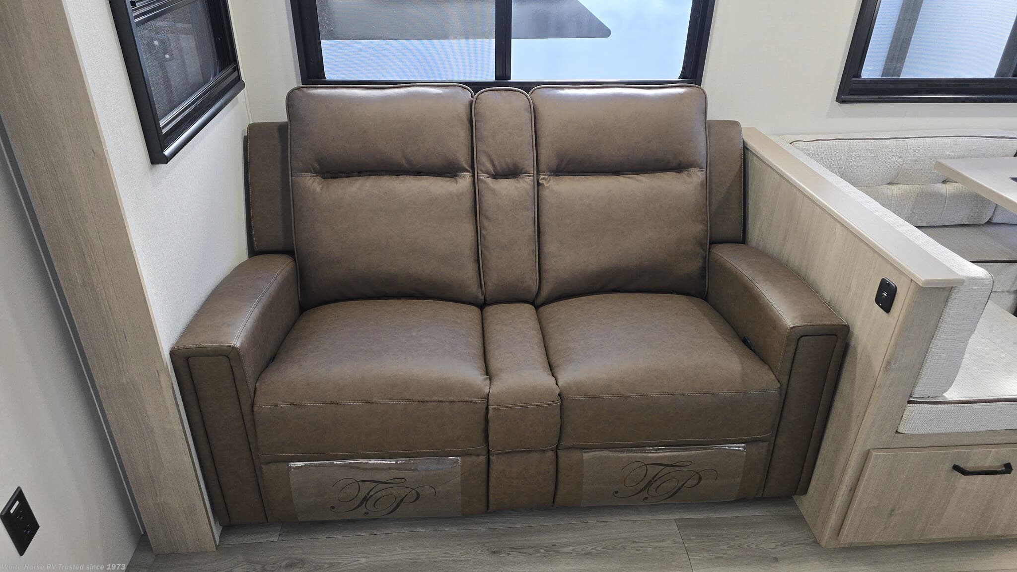 • Spacious living area featuring a tri-fold sofa or theater seat (depending on build) directly across from the entertainment center