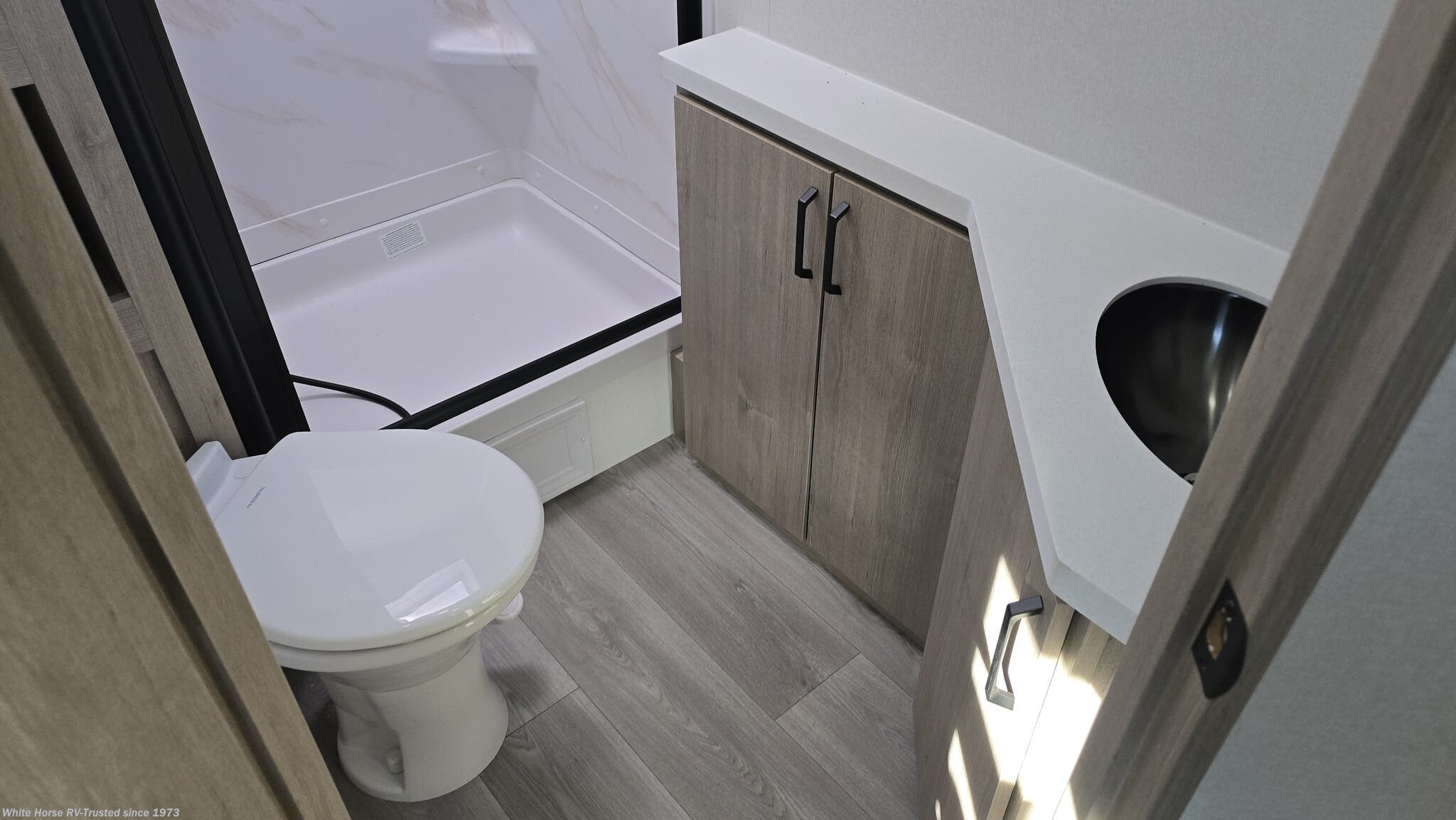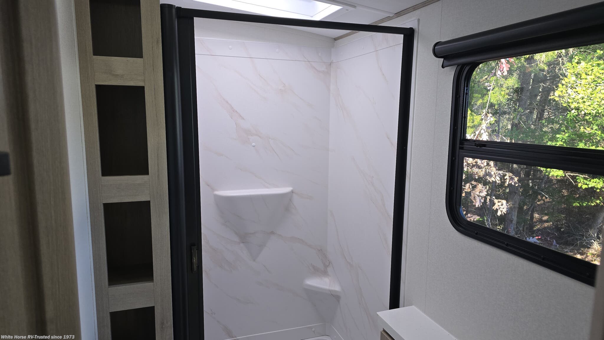 • Rear corner bath with walk-in shower, linen storage, and exterior access to keep dirt out of the main living area