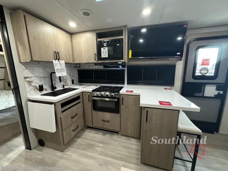 At the front of this 2810BH travel trailer, you’ll find a spacious full bedroom featuring a 60" x 80" queen bed, perfect for resting in comfort after a long day, along with dual wardrobes on each side to store your clothes and essentials. For added convenience, one of the two entry doors is located directly in the bedroom. Moving toward the center, the living area and kitchen create a welcoming space to relax and dine. The slide-out houses a quad theater seat, offering plenty of room to lounge, as well as a 10-cu. ft. refrigerator to keep your groceries fresh. Across from it, the U-shaped kitchen comes fully equipped with everything you need to cook comfortably, including a stainless-steel sink, three-burner range with oven, microwave, and solid surface countertops for meal prep. A bar top with stools provides a cozy dining spot, while a pull-out pantry keeps snacks organized. At the rear, the corner bathroom includes a 30" x 36" residential walk-in shower with skylight and a mirrored medicine cabinet, so you can skip the campsite facilities. Adjacent to it, the bunkhouse accommodates guests with a 36" flip-top bunk, tri-fold sofa, and even a flip-up desk, perfect for studying or remote work while on the road.