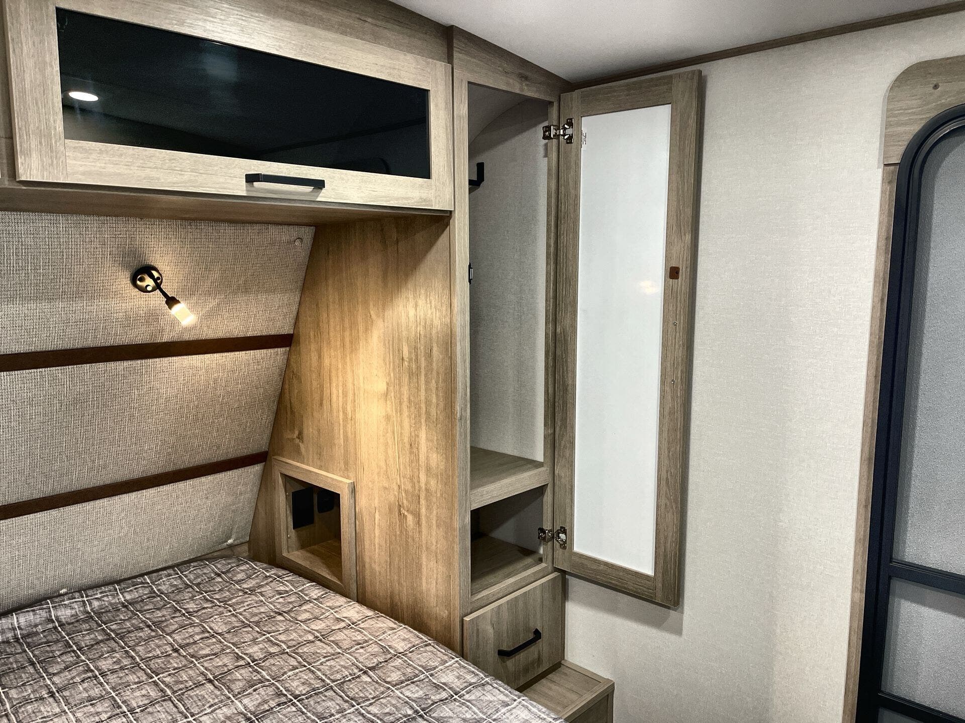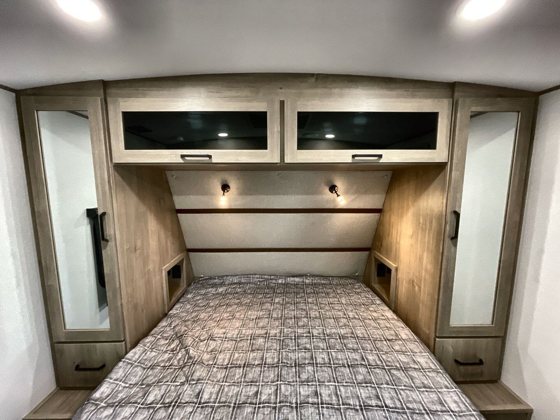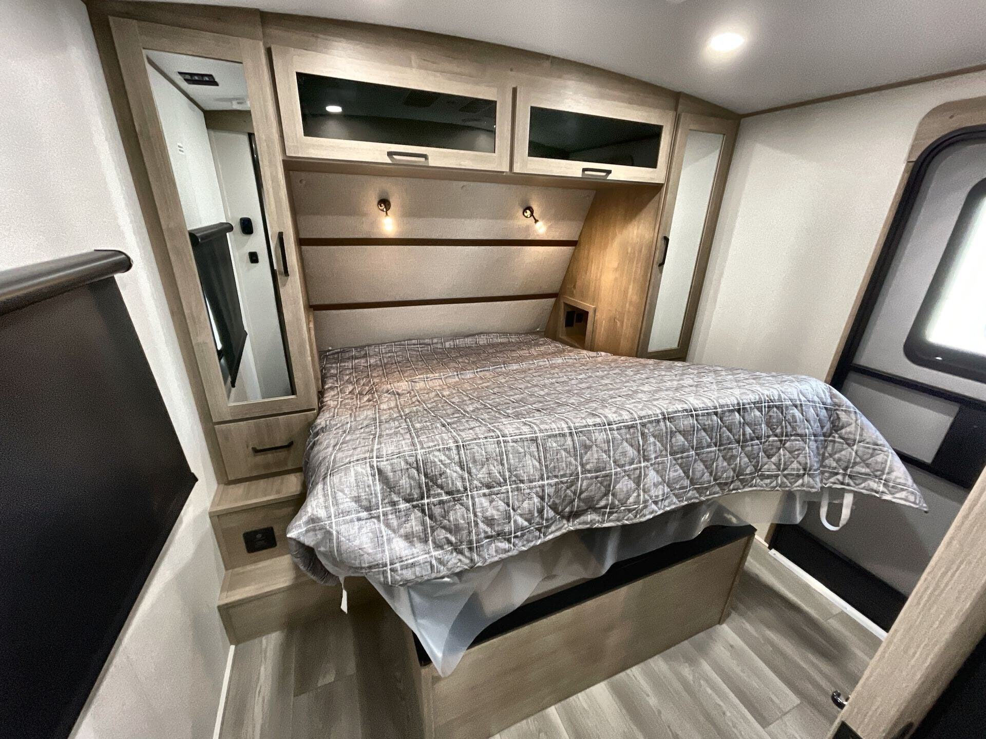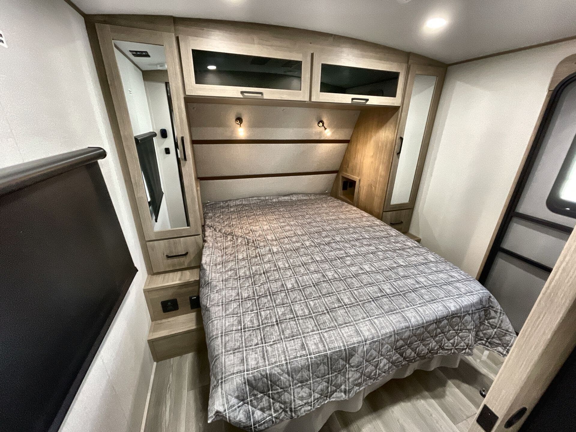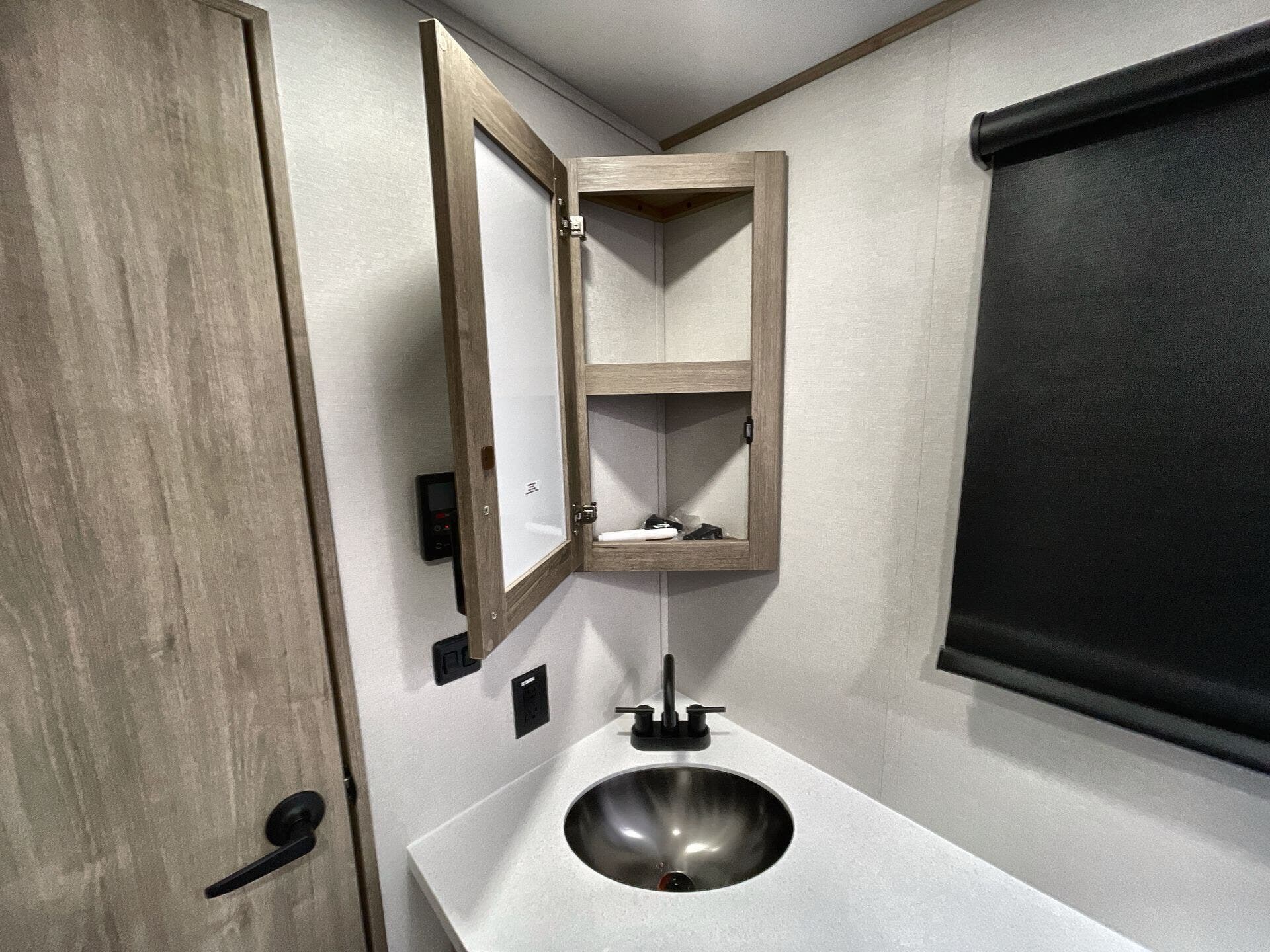 - Medicine cabinet and queen bed for convenient, relaxing nights