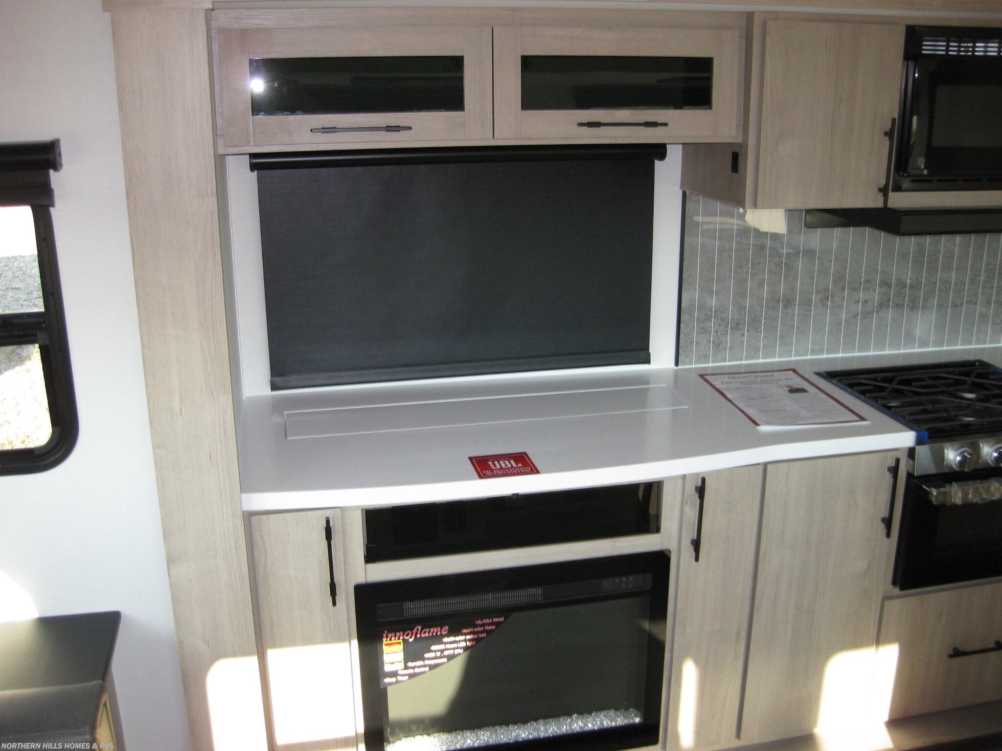 Inside, you’ll enjoy a thoughtfully appointed space built for everyday life on the road. The kitchen delivers a full suite of appliances, including a microwave, oven, stove top burner, and a generous refrigerator. A roomy booth dinette adds dining space and can serve as extra sleeping accommodations when needed. Relax in comfort with a pair of rocker recliners, and unwind by the cozy fireplace. The living area flows into a private bedroom with a queen bed, while practical features such as a medicine cabinet, dual detectors (CO, LP, Smoke), and ample roof vents contribute to safety and convenience. Storage is abundant, helping you bring along gear for adventures and family fun.