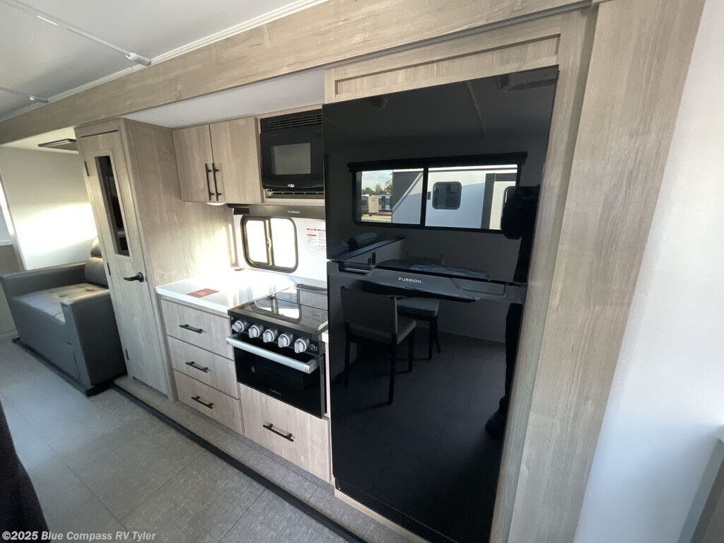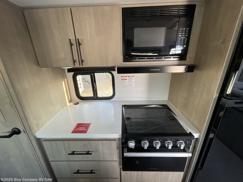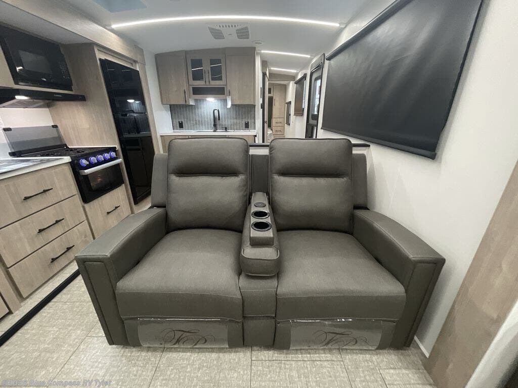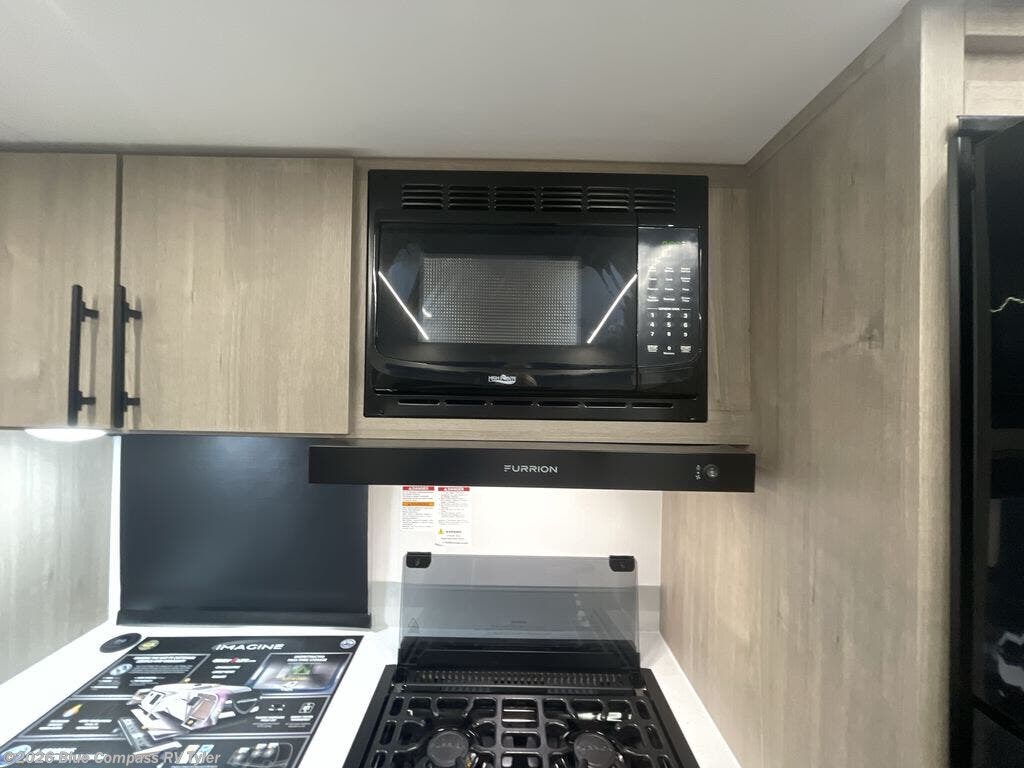 The rear living room on this Imagine travel trailer is just what you'll want when you're looking for a little down time. This room has opposing tri-fold sofas within slides, theater seating, and a LED HDTV. Another place that you can sit down at is the free-standing adjustable dinette. You can sit here with a fresh cup of coffee in the afternoon as you map out your hike for tomorrow. The kitchen offers you a flip-up countertop extension, a microwave, a three-burner range with oven, a 10-cubic foot 12V refrigerator, and pantry to help you make meals, and there is a private bedroom with a 60" x 80" bed to rest on at the end of the day.