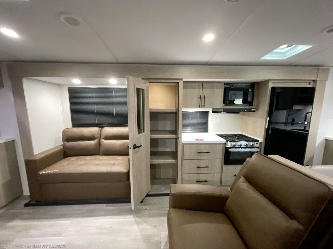 The rear living room on this Imagine travel trailer is just what you'll want when you're looking for a little down time. This room has opposing tri-fold sofas within slides, theater seating, and a LED HDTV. Another place that you can sit down at is the free-standing adjustable dinette. You can sit here with a fresh cup of coffee in the afternoon as you map out your hike for tomorrow. The kitchen offers you a flip-up countertop extension, a microwave, a three-burner range with oven, a 10-cubic foot 12V refrigerator, and pantry to help you make meals, and there is a private bedroom with a 60" x 80" bed to rest on at the end of the day.
