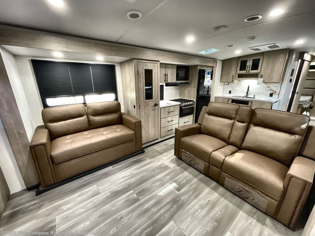 The rear living room on this Imagine travel trailer is just what you'll want when you're looking for a little down time. This room has opposing tri-fold sofas within slides, theater seating, and a LED HDTV. Another place that you can sit down at is the free-standing adjustable dinette. You can sit here with a fresh cup of coffee in the afternoon as you map out your hike for tomorrow. The kitchen offers you a flip-up countertop extension, a microwave, a three-burner range with oven, a 10-cubic foot 12V refrigerator, and pantry to help you make meals, and there is a private bedroom with a 60" x 80" bed to rest on at the end of the day.