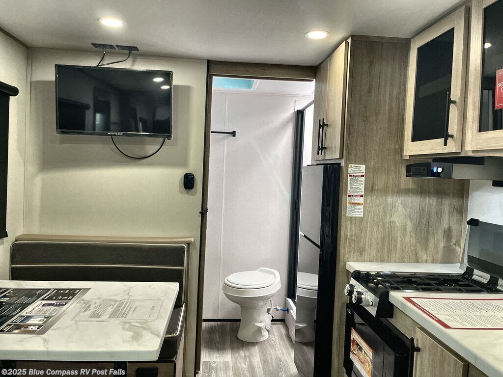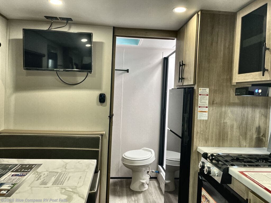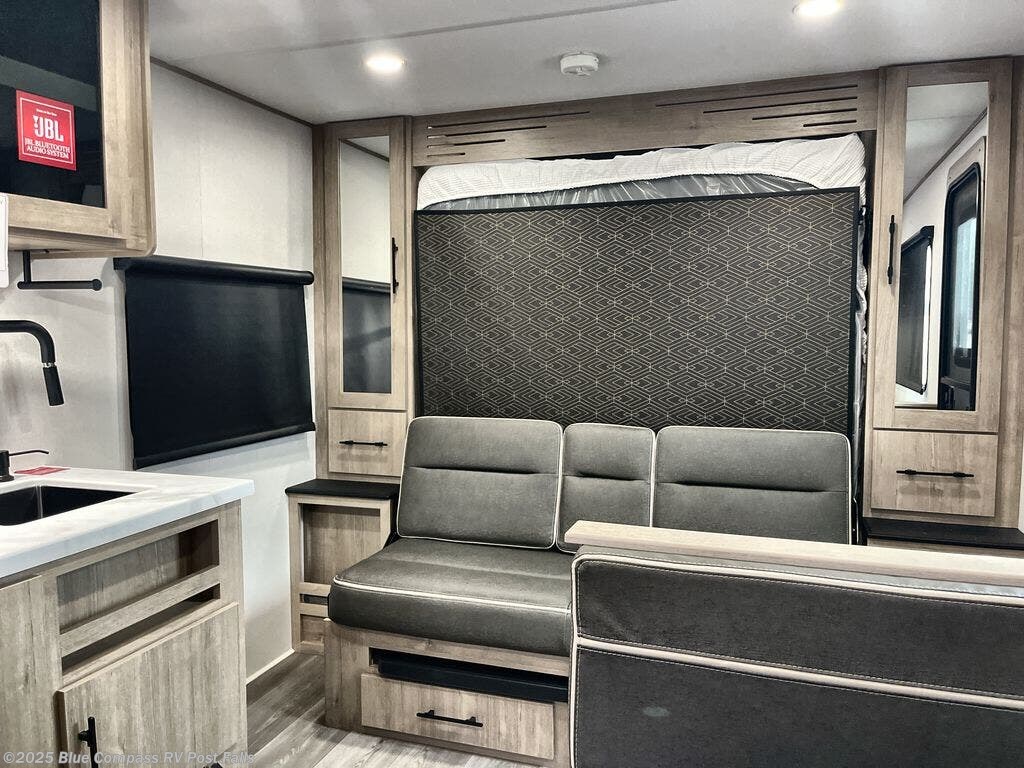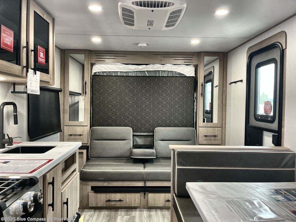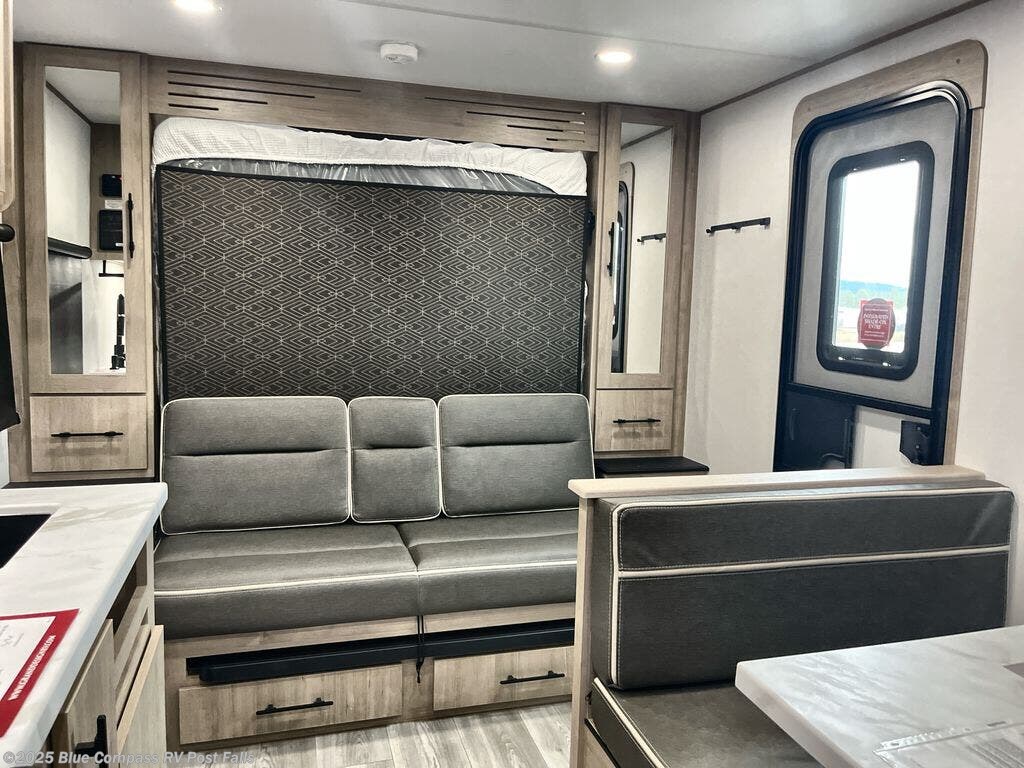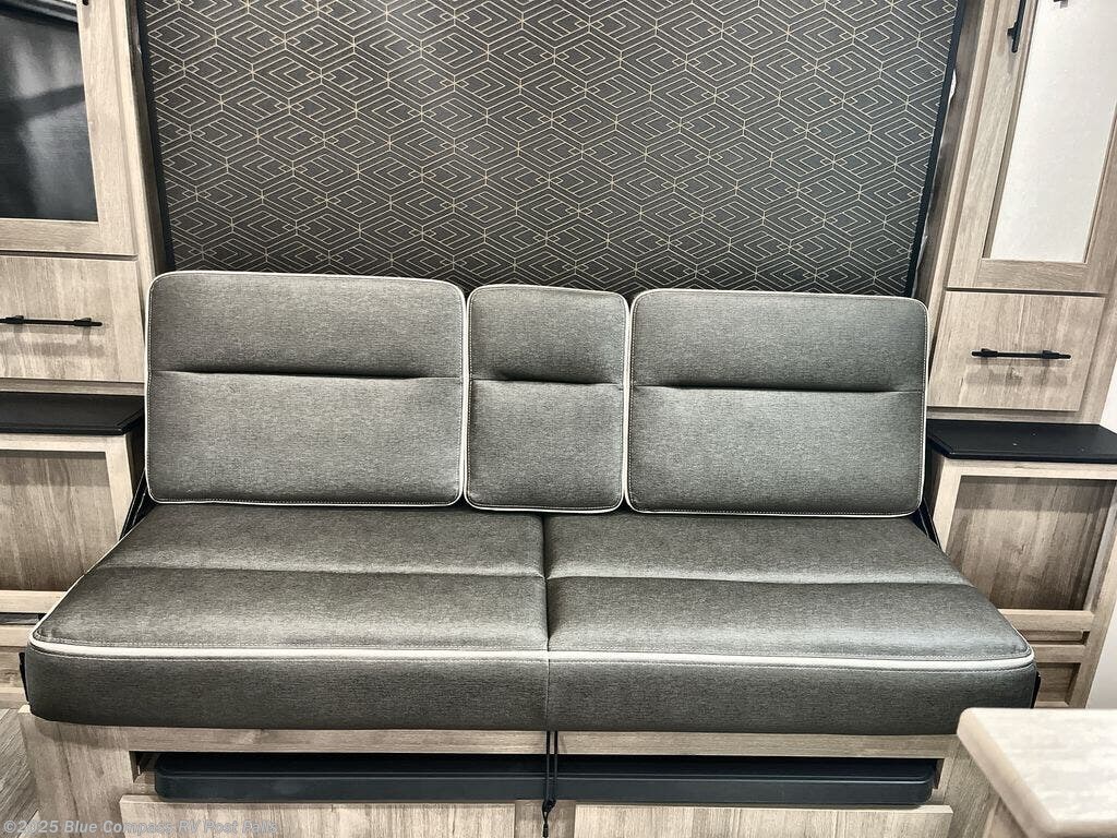 Start looking for your favorite campground to take this travel trailer to! After a fun day at the beach, you can rinse the sand out of your hair with the walk-in shower with a skylight in the full rear bathroom. Depending on what time you enter the unit will determine whether you see the Murphy bed or sofa with shoe storage underneath and wardrobes on either side of it. The booth dinette is not only great for enjoying meals prepared with the two-burner cooktop, but also for transforming into an extra sleeping space!