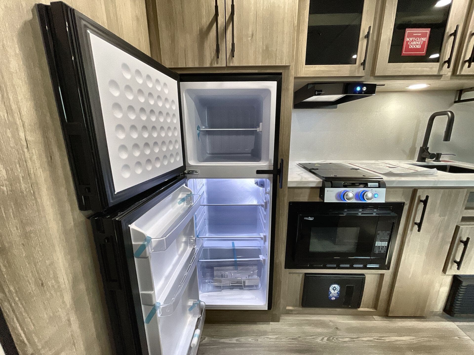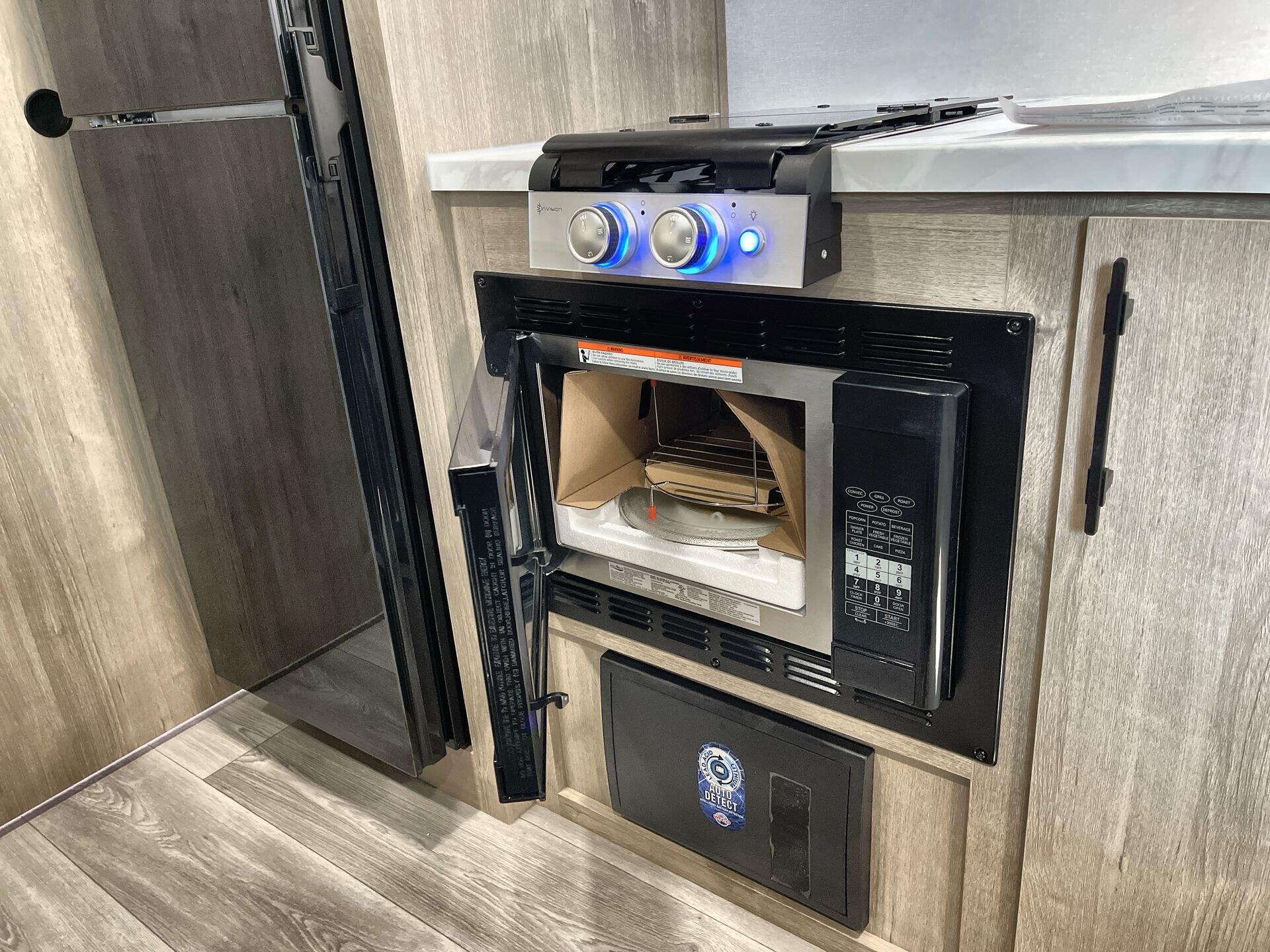 - Microwave, Refrigerator, and Stove for convenient meals on the road