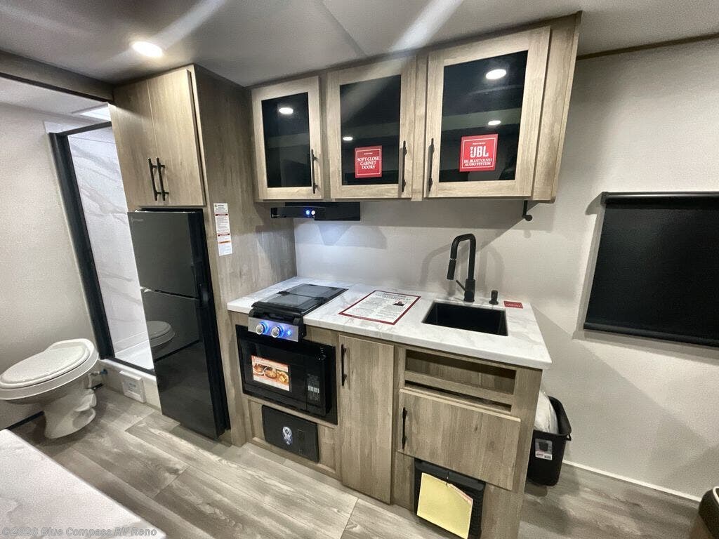 Start looking for your favorite campground to take this travel trailer to! After a fun day at the beach, you can rinse the sand out of your hair with the walk-in shower with a skylight in the full rear bathroom. Depending on what time you enter the unit will determine whether you see the Murphy bed or sofa with drawers underneath and wardrobes on either side of it. The booth dinette is not only great for enjoying meals prepared with the two burner cooktop or outside griddle, but also for transforming into an extra sleeping space!
