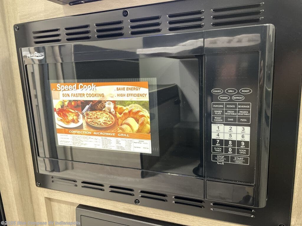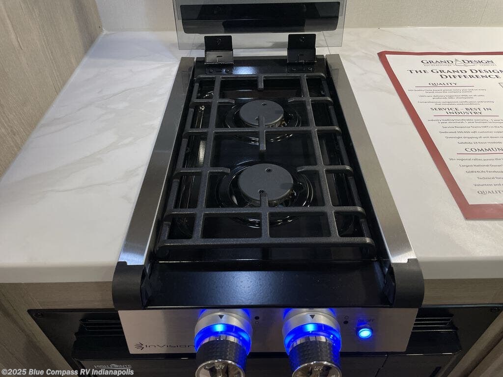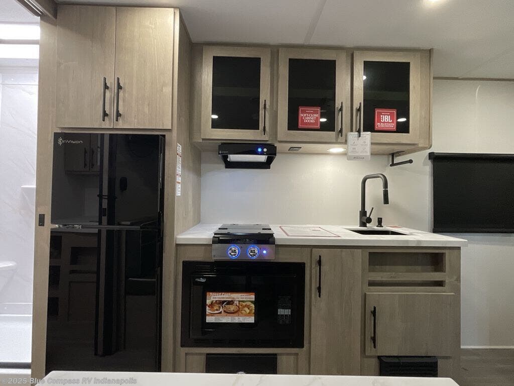 Kitchen features include a two-burner cooktop, convection microwave, stainless steel sink, and 6.2 cu. ft. 12V refrigerator