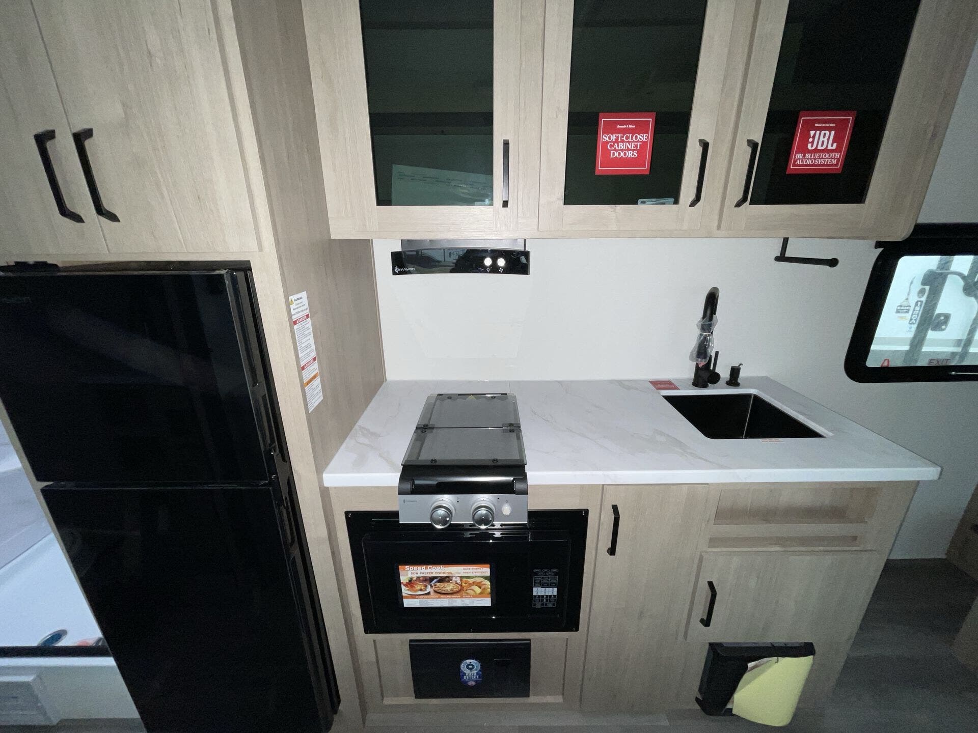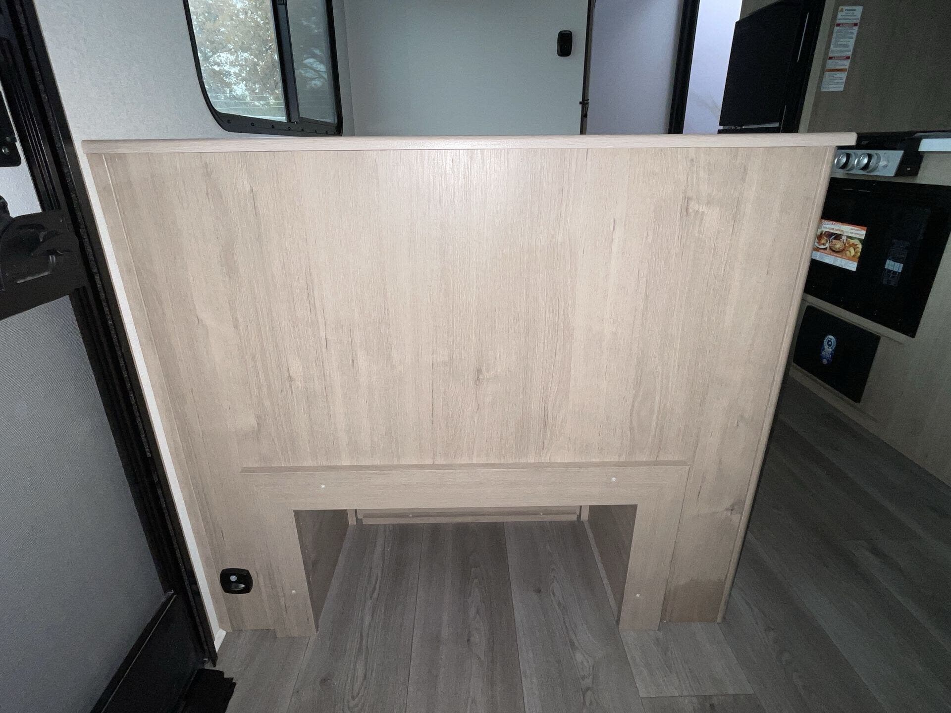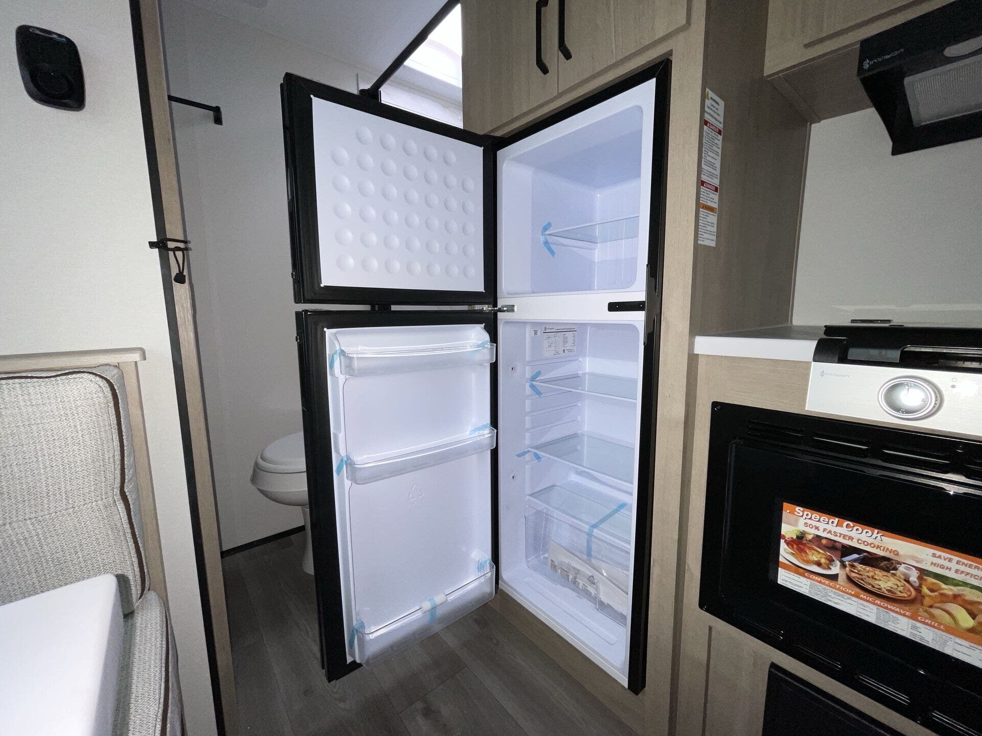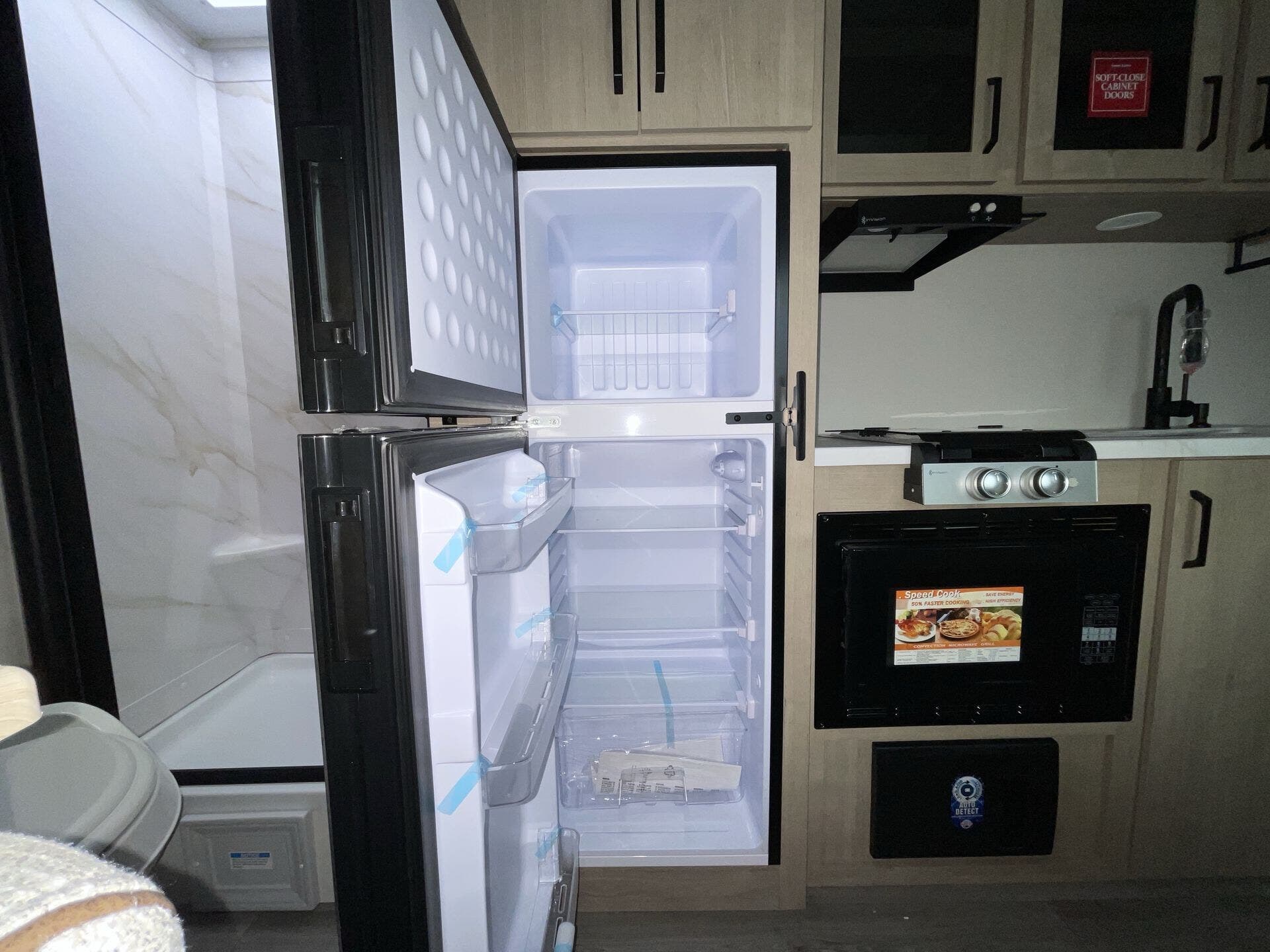 The rear bath setup is way better than having a tiny corner wet bath. It gives you real space to move around, and the front bedroom area feels private and practical. The kitchen handles the basics without feeling awkward — good fridge size, counter space that actually works, and storage that’s more than just a token cabinet.