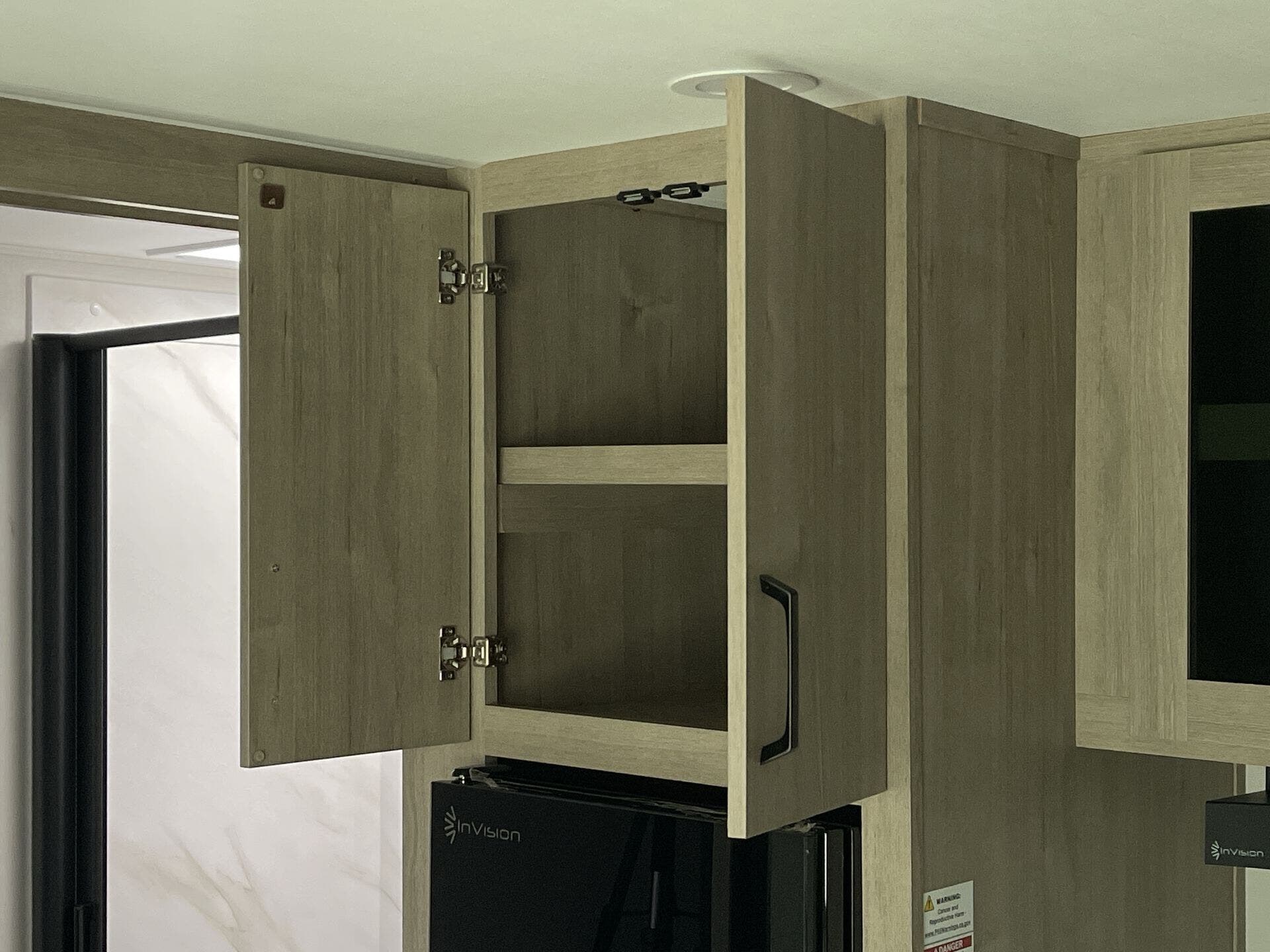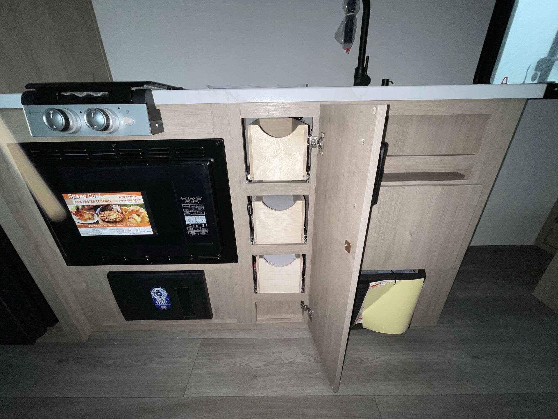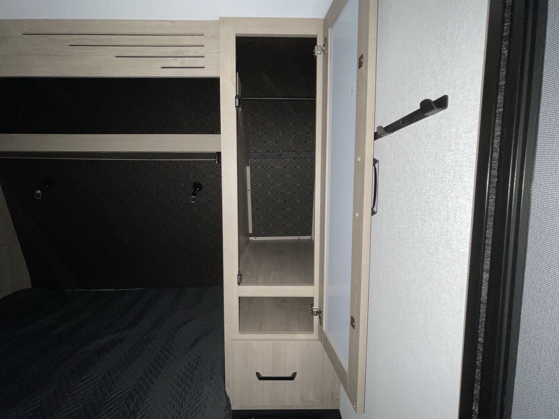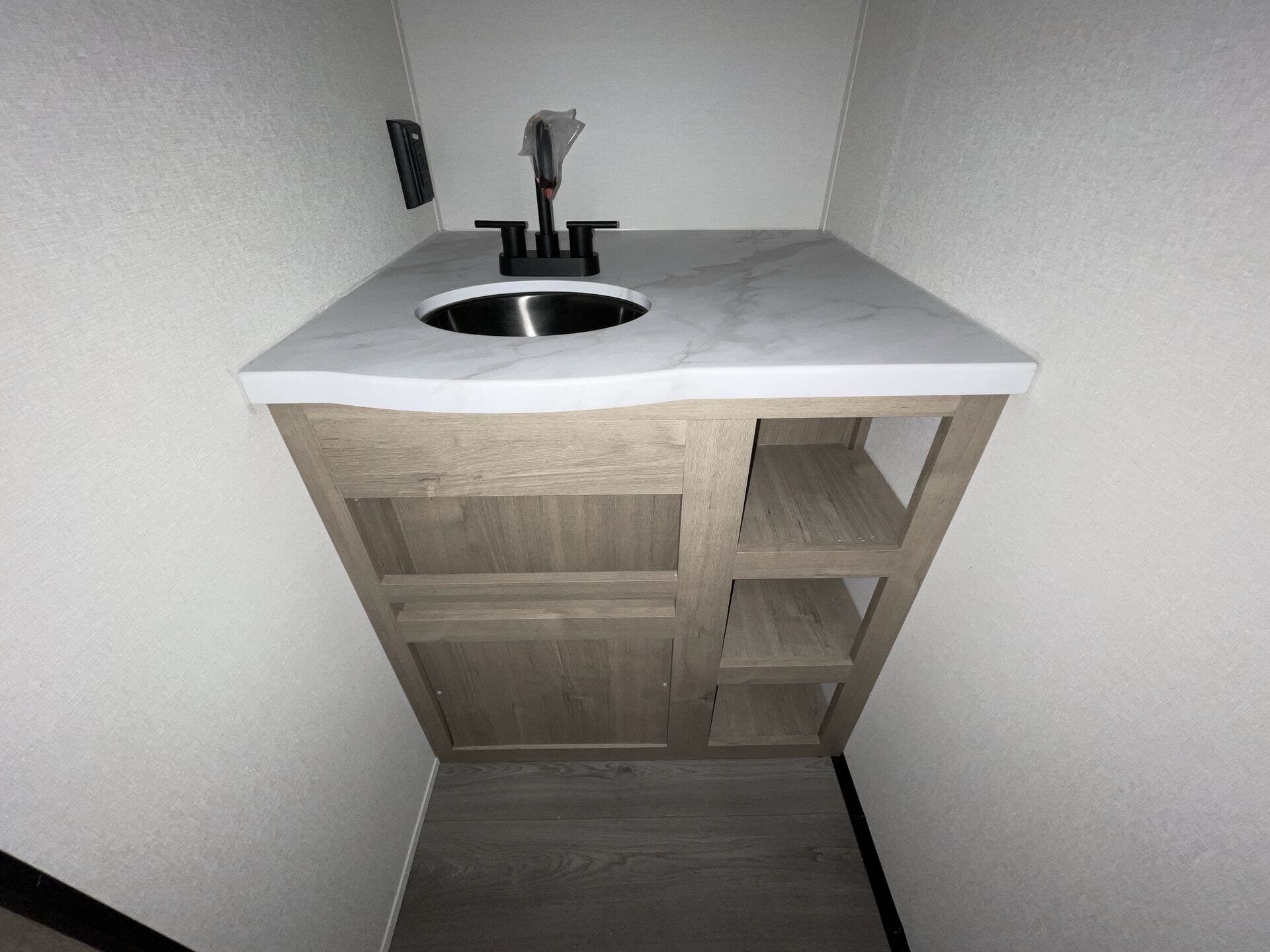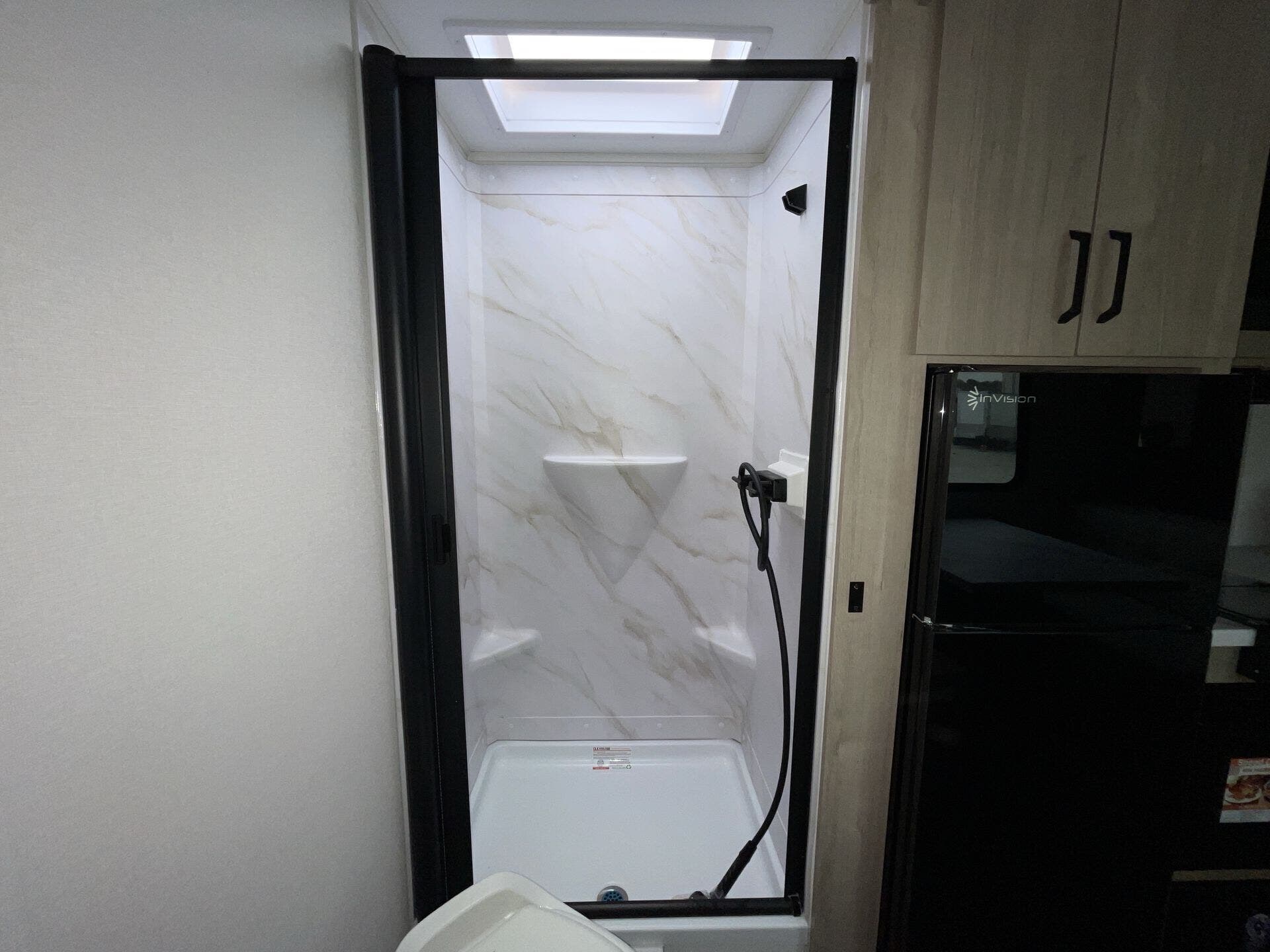 The rear bath setup is way better than having a tiny corner wet bath. It gives you real space to move around, and the front bedroom area feels private and practical. The kitchen handles the basics without feeling awkward — good fridge size, counter space that actually works, and storage that’s more than just a token cabinet.