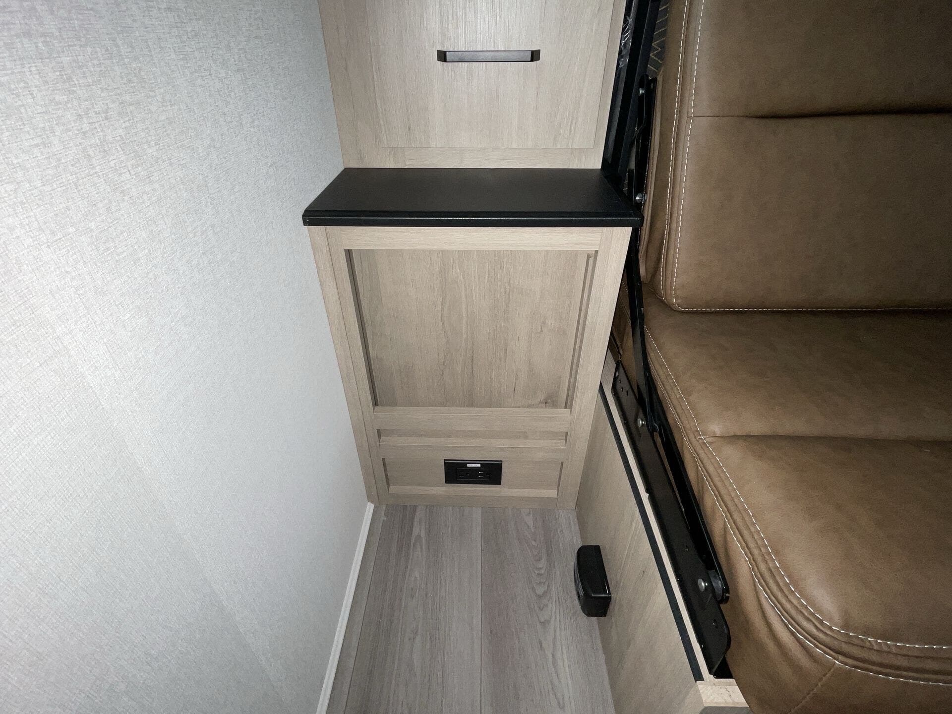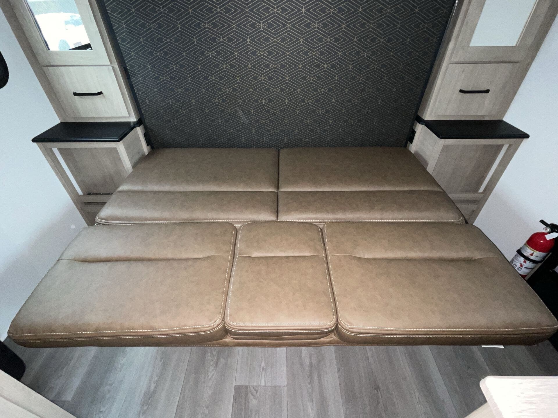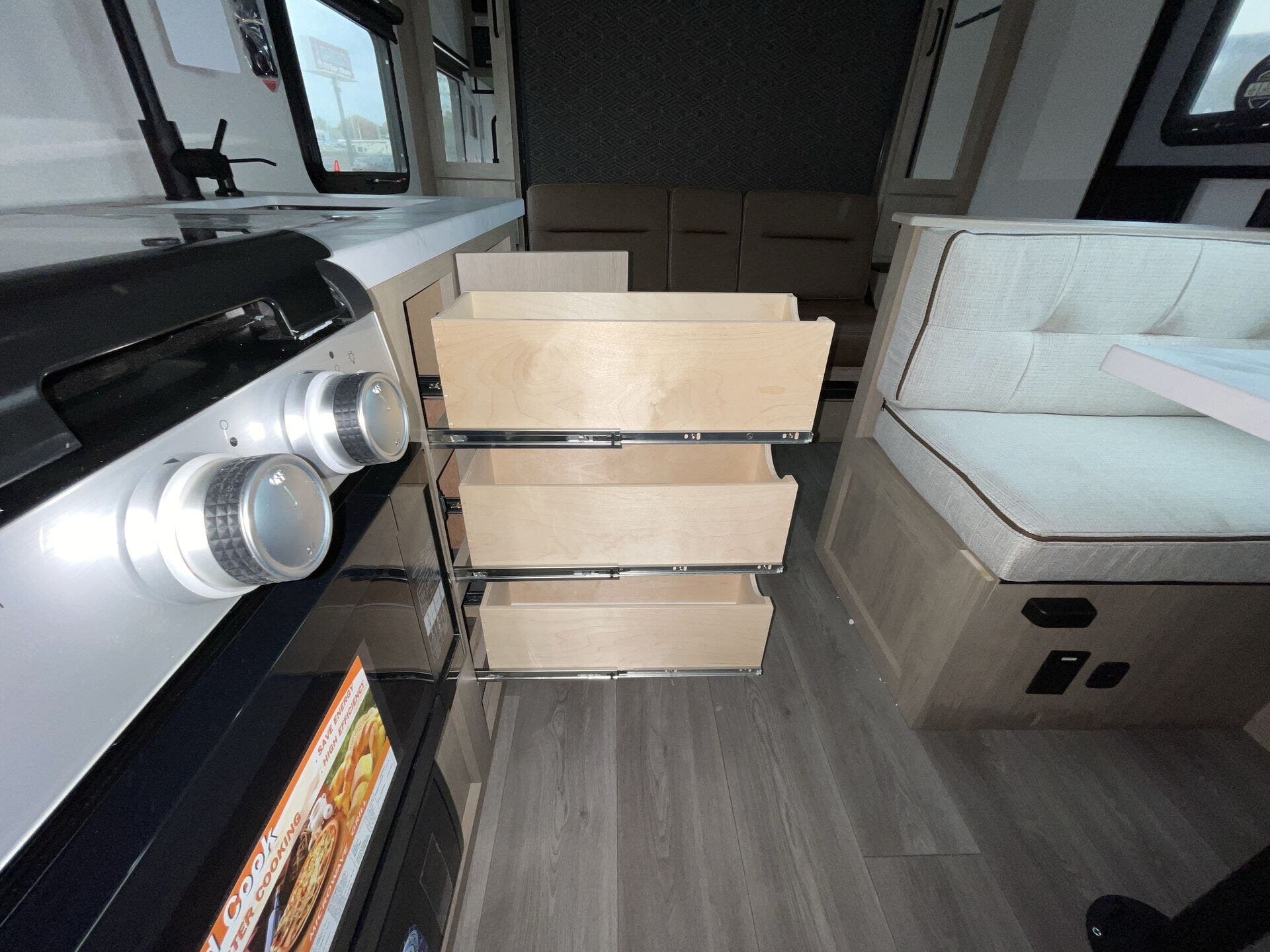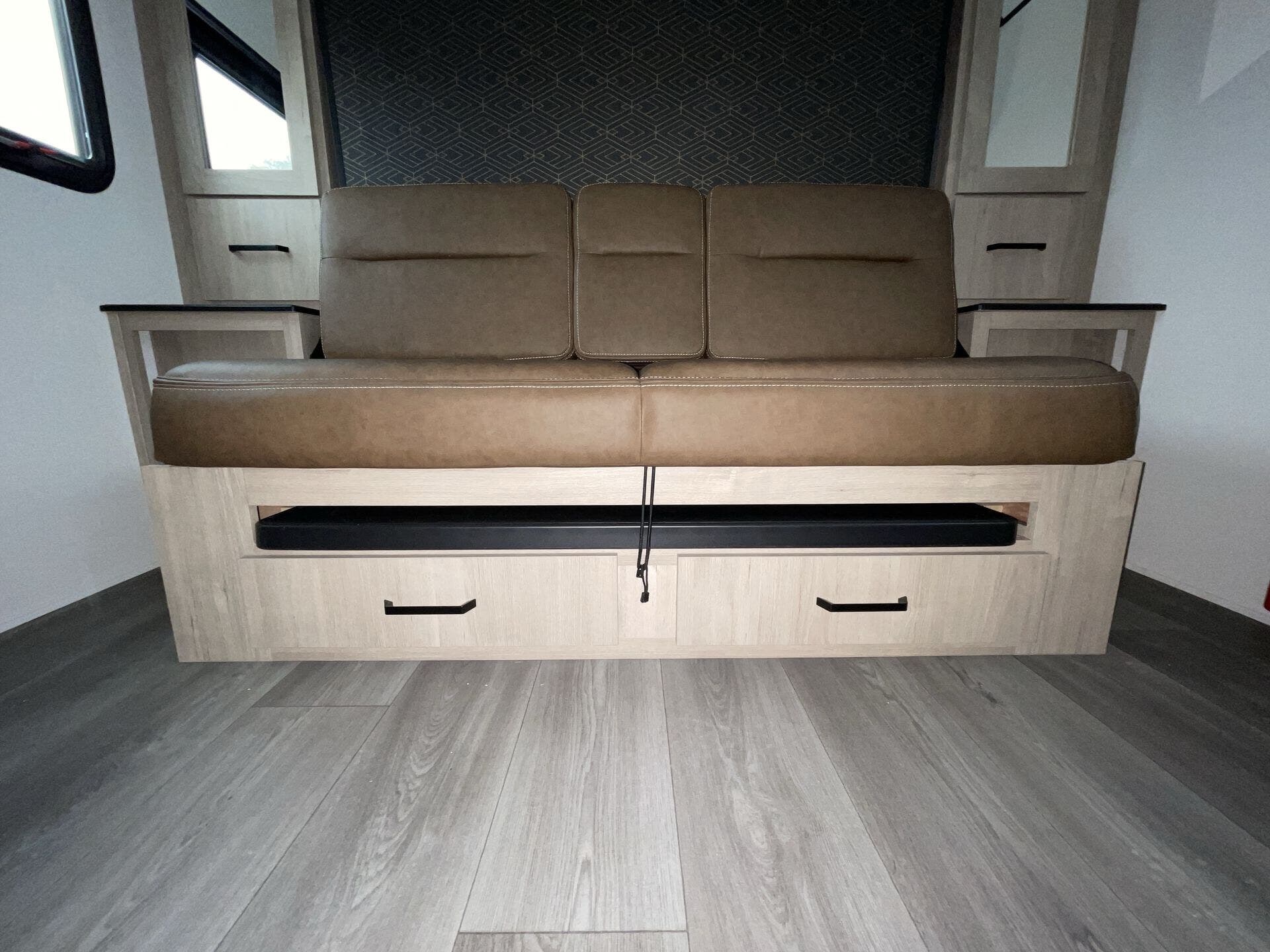 Booth Dinette, Dinette, Dinette Bed, Kitchen Sink, Medicine Cabinet, Murphy Bed, Overhead Cabinetry, Removable Table, Shower, Sofa Bed, Solid Surface Countertops, Toilet -