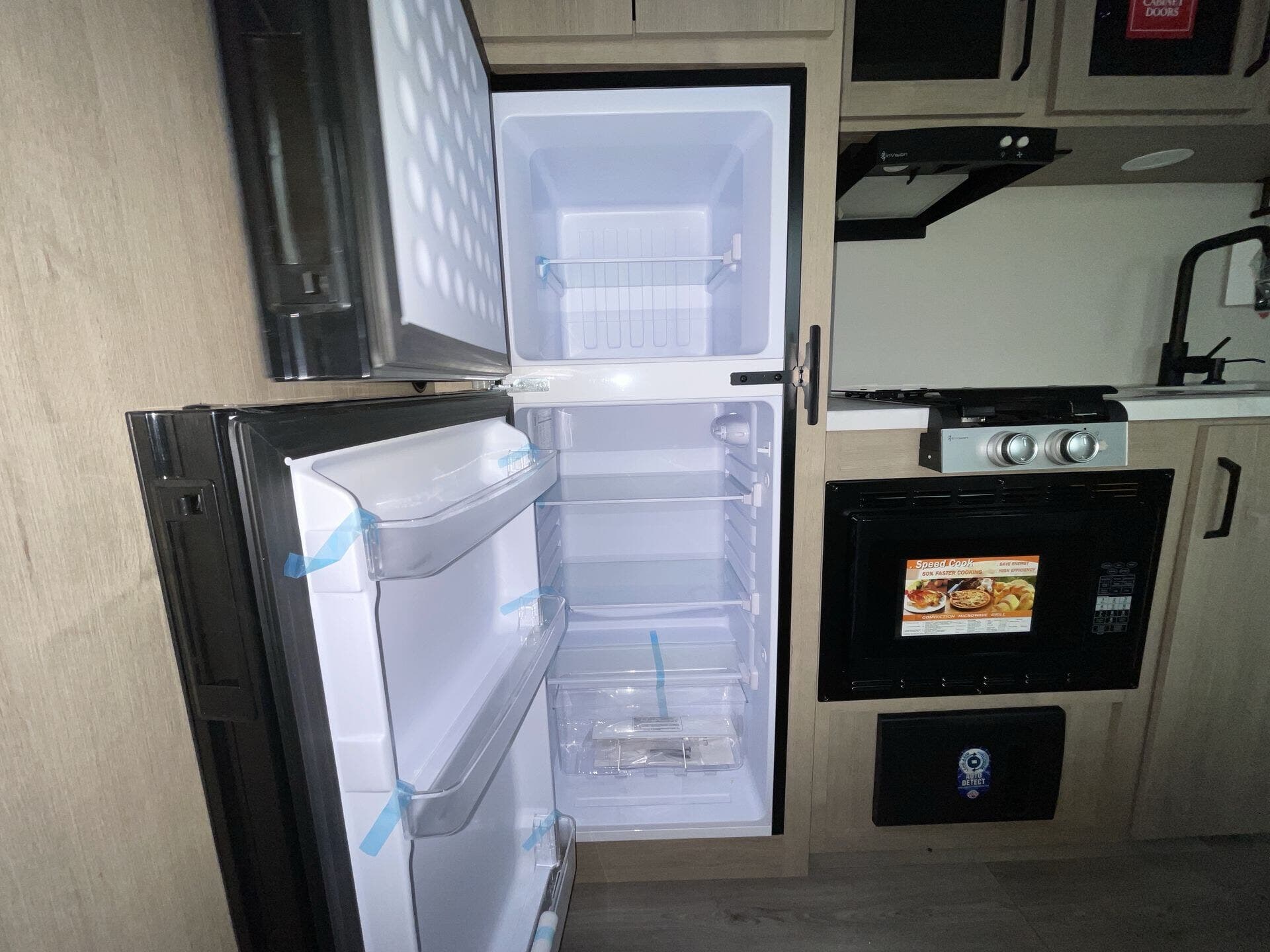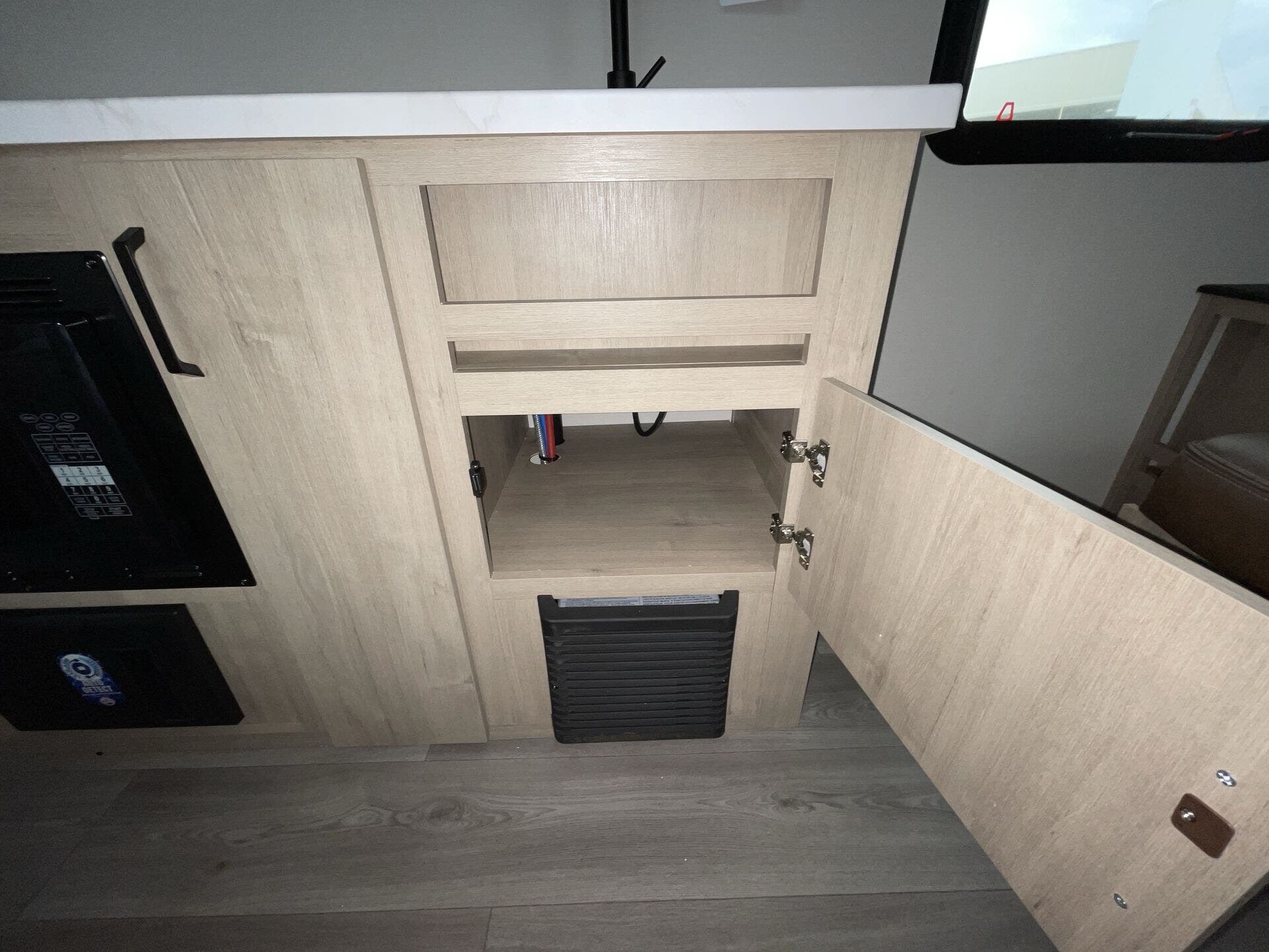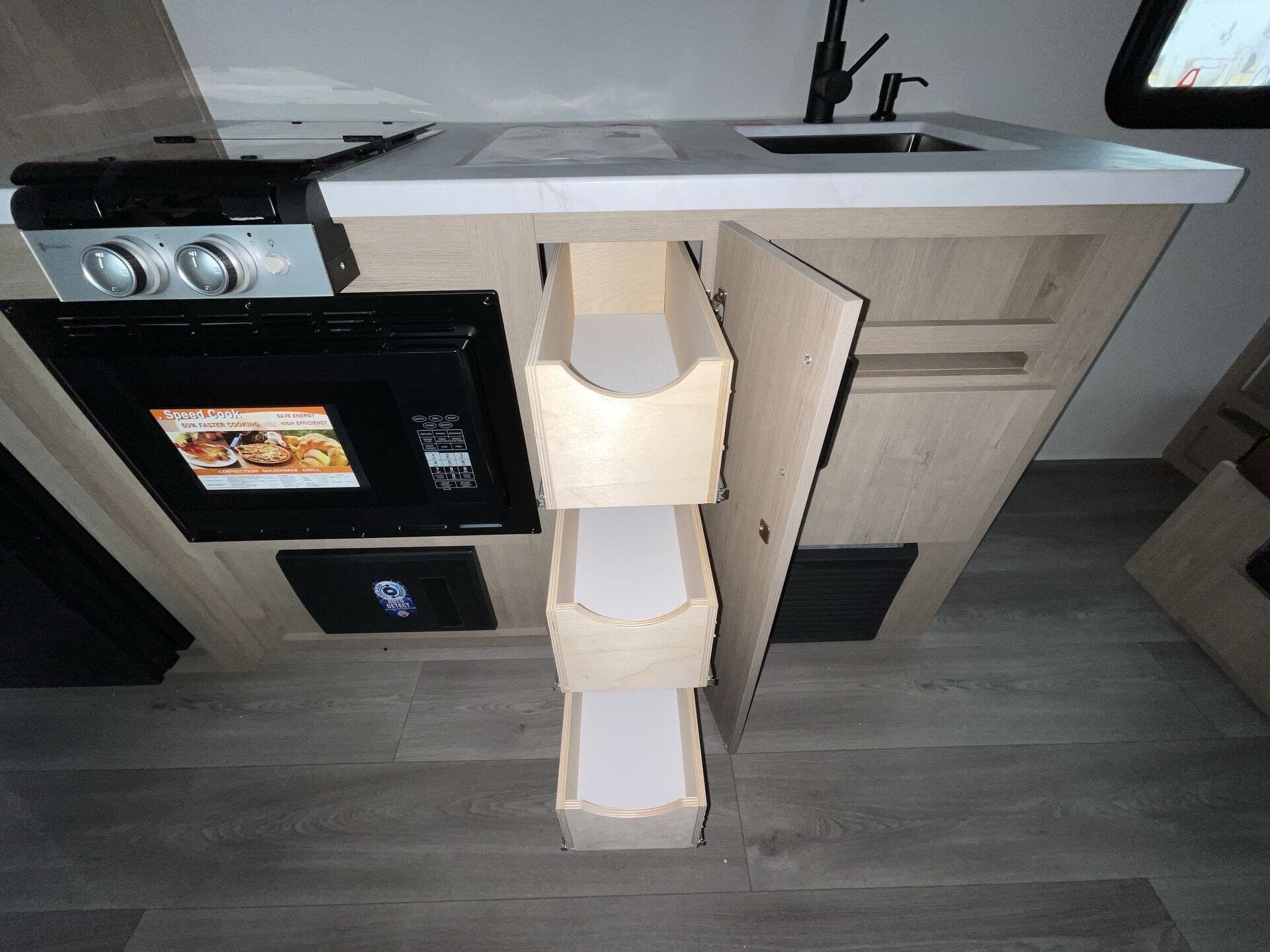 The rear bath setup is way better than having a tiny corner wet bath. It gives you real space to move around, and the front bedroom area feels private and practical. The kitchen handles the basics without feeling awkward — good fridge size, counter space that actually works, and storage that’s more than just a token cabinet.