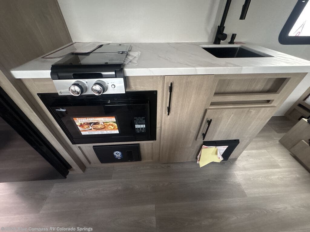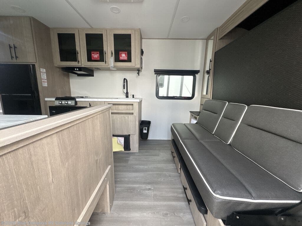 Start looking for your favorite campground to take this travel trailer to! After a fun day at the beach, you can rinse the sand out of your hair with the walk-in shower with a skylight in the full rear bathroom. Depending on what time you enter the unit will determine whether you see the Murphy bed or sofa with drawers underneath and wardrobes on either side of it. The booth dinette is not only great for enjoying meals prepared with the two burner cooktop or outside griddle, but also for transforming into an extra sleeping space!