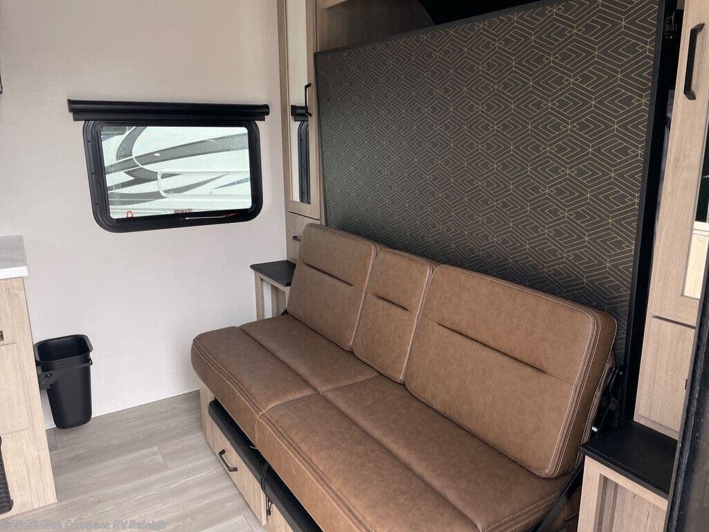 Start looking for your favorite campground to take this travel trailer to! After a fun day at the beach, you can rinse the sand out of your hair with the walk-in shower with a skylight in the full rear bathroom. Depending on what time you enter the unit will determine whether you see the Murphy bed or sofa with shoe storage underneath and wardrobes on either side of it. The booth dinette is not only great for enjoying meals prepared with the two-burner cooktop, but also for transforming into an extra sleeping space!