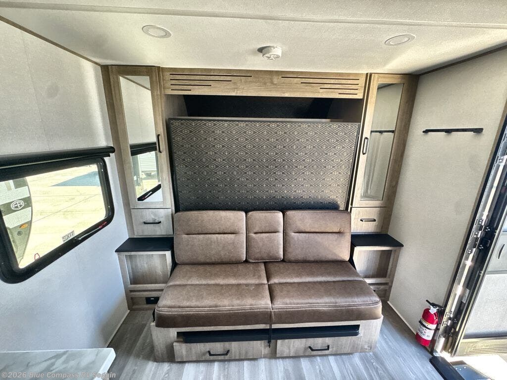 Start looking for your favorite campground to take this travel trailer to! After a fun day at the beach, you can rinse the sand out of your hair with the walk-in shower with a skylight in the full rear bathroom. Depending on what time you enter the unit will determine whether you see the Murphy bed or sofa with shoe storage underneath and wardrobes on either side of it. The booth dinette is not only great for enjoying meals prepared with the two-burner cooktop, but also for transforming into an extra sleeping space!