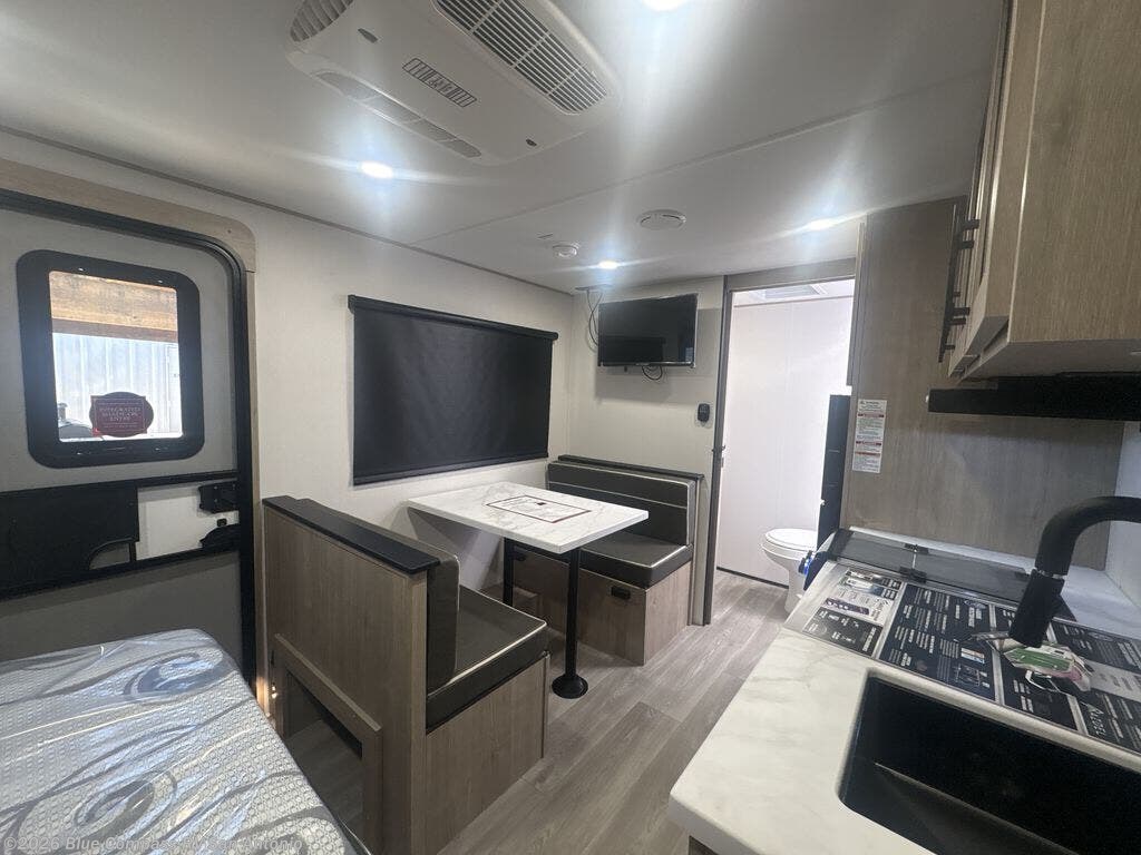 Start looking for your favorite campground to take this travel trailer to! After a fun day at the beach, you can rinse the sand out of your hair with the walk-in shower with a skylight in the full rear bathroom. Depending on what time you enter the unit will determine whether you see the Murphy bed or sofa with shoe storage underneath and wardrobes on either side of it. The booth dinette is not only great for enjoying meals prepared with the two-burner cooktop, but also for transforming into an extra sleeping space!