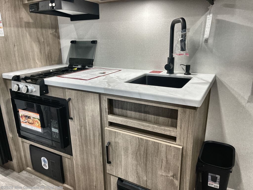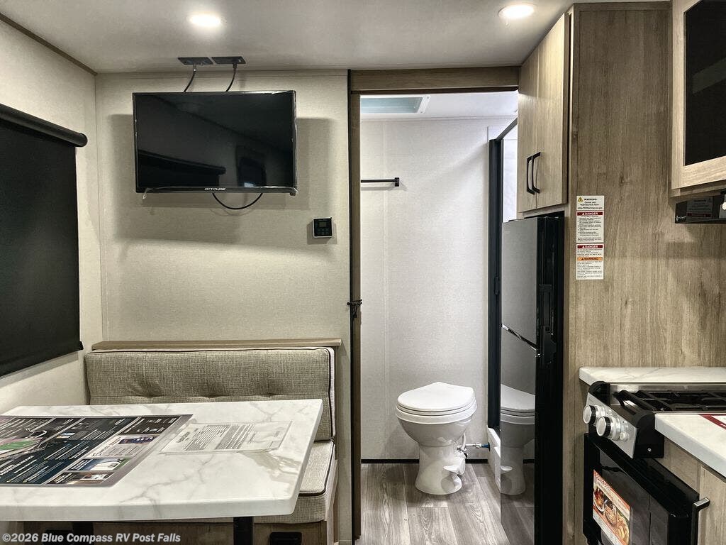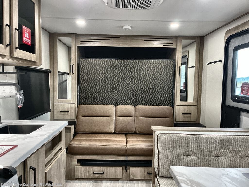 Start looking for your favorite campground to take this travel trailer to! After a fun day at the beach, you can rinse the sand out of your hair with the walk-in shower with a skylight in the full rear bathroom. Depending on what time you enter the unit will determine whether you see the Murphy bed or sofa with shoe storage underneath and wardrobes on either side of it. The booth dinette is not only great for enjoying meals prepared with the two-burner cooktop, but also for transforming into an extra sleeping space!