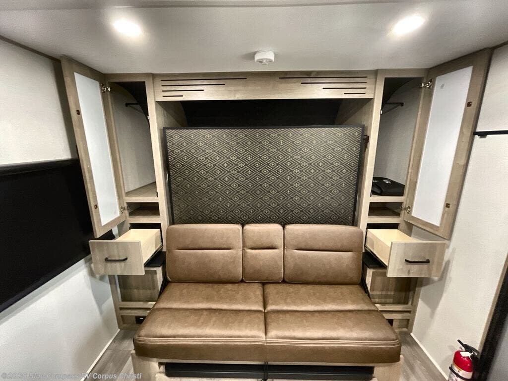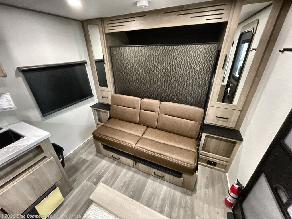 Start looking for your favorite campground to take this travel trailer to! After a fun day at the beach, you can rinse the sand out of your hair with the walk-in shower with a skylight in the full rear bathroom. Depending on what time you enter the unit will determine whether you see the Murphy bed or sofa with shoe storage underneath and wardrobes on either side of it. The booth dinette is not only great for enjoying meals prepared with the two-burner cooktop, but also for transforming into an extra sleeping space!