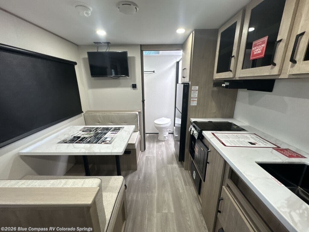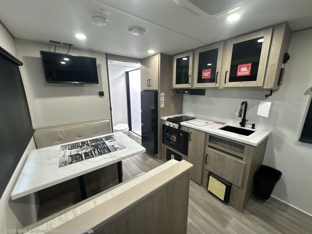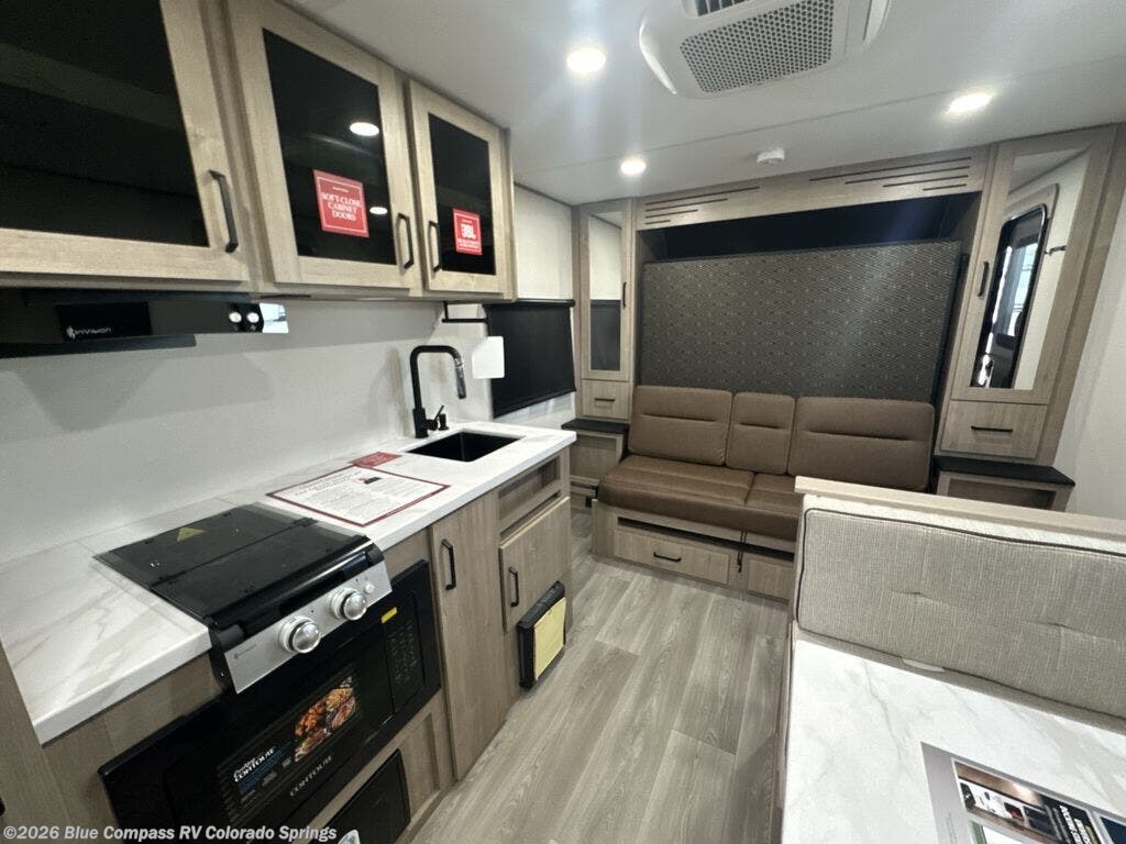 Start looking for your favorite campground to take this travel trailer to! After a fun day at the beach, you can rinse the sand out of your hair with the walk-in shower with a skylight in the full rear bathroom. Depending on what time you enter the unit will determine whether you see the Murphy bed or sofa with shoe storage underneath and wardrobes on either side of it. The booth dinette is not only great for enjoying meals prepared with the two-burner cooktop, but also for transforming into an extra sleeping space!