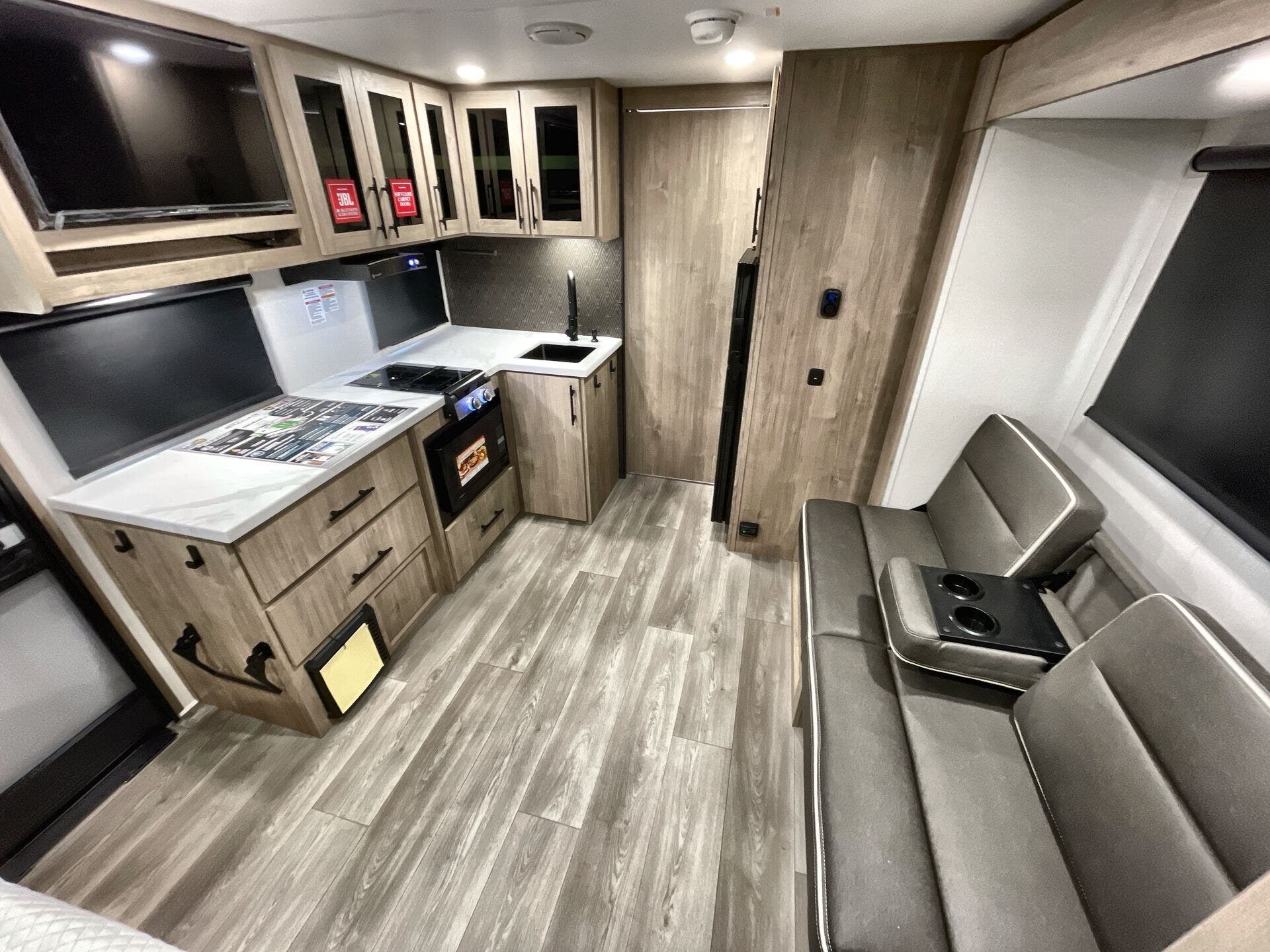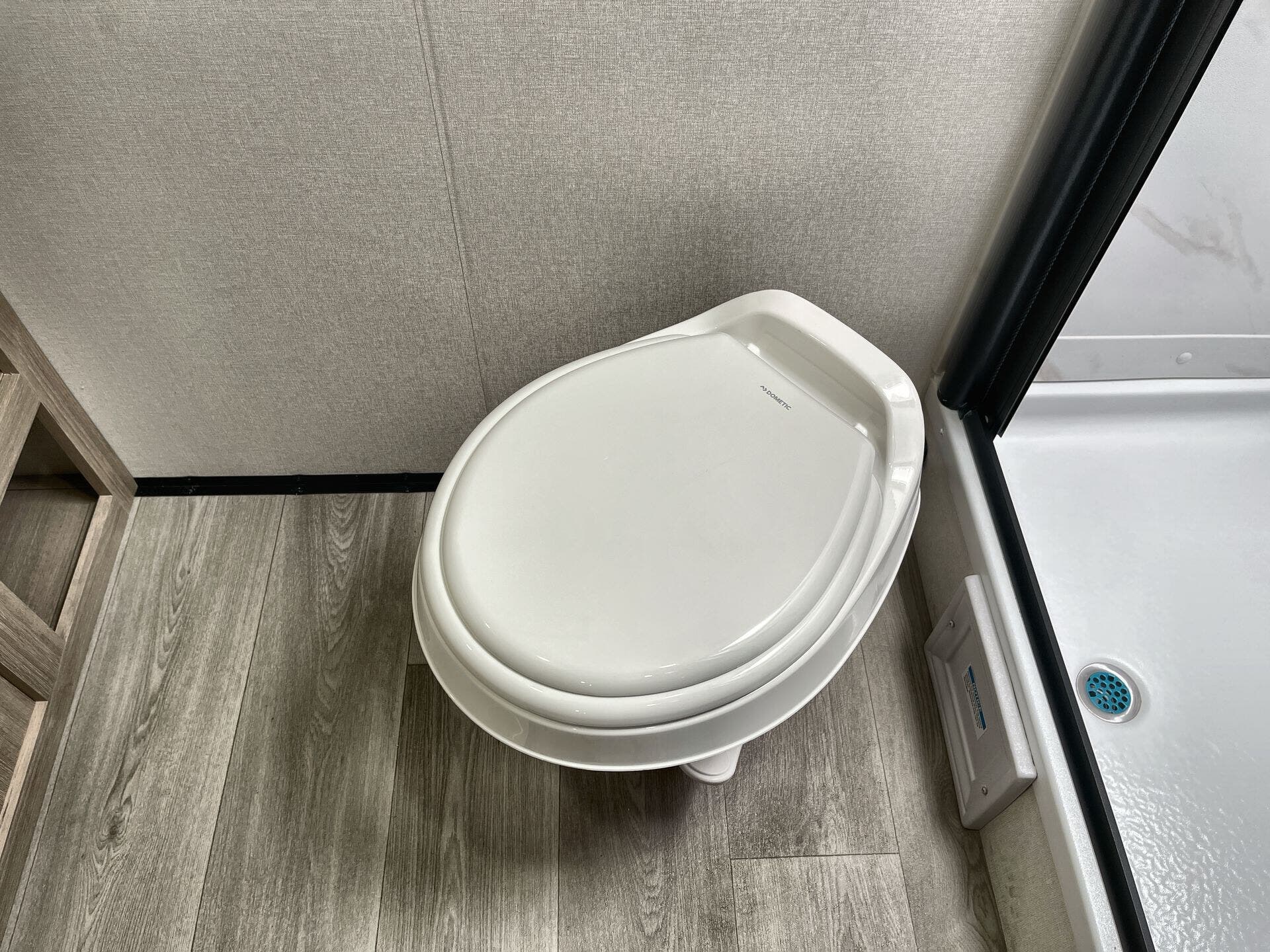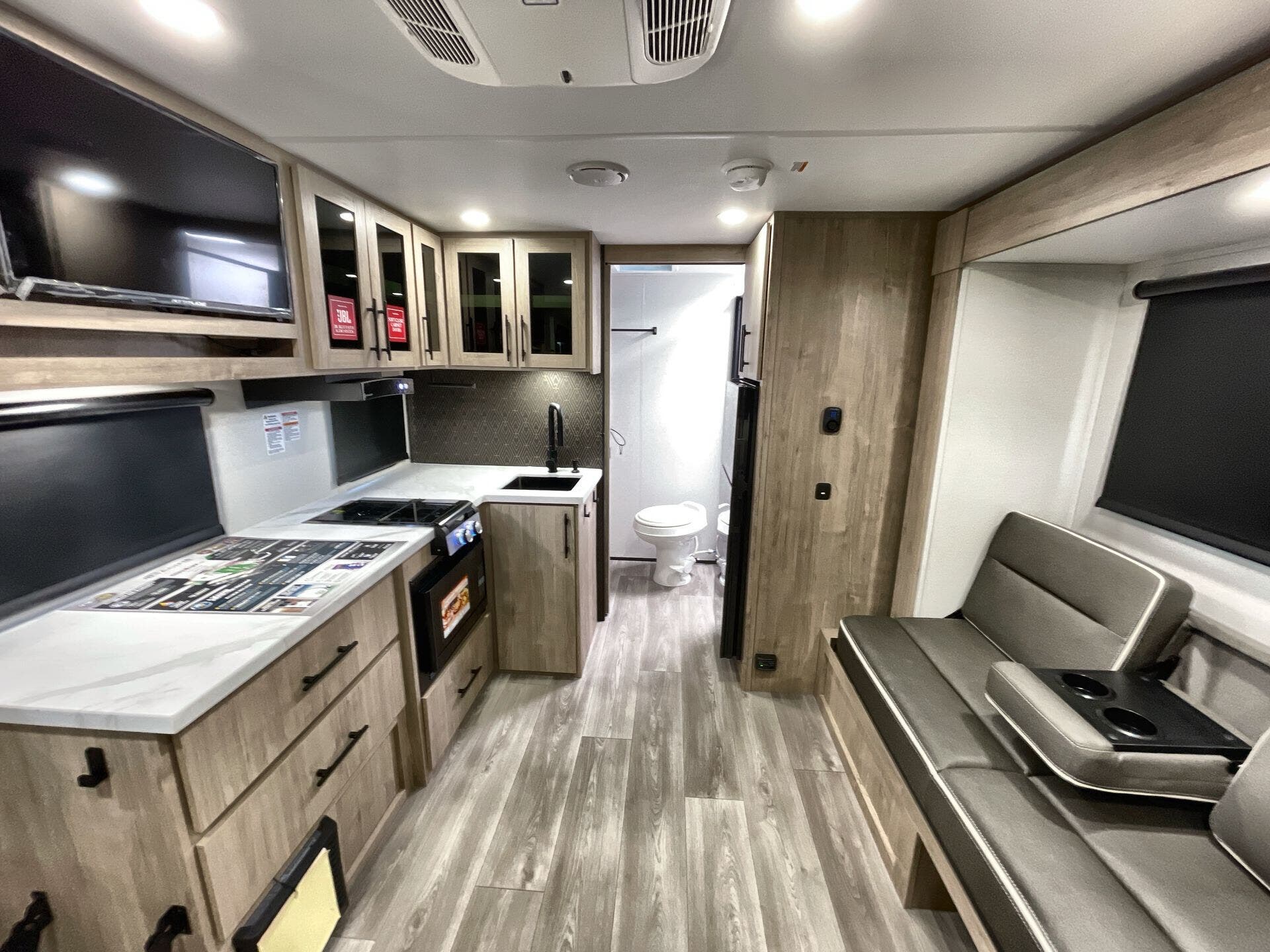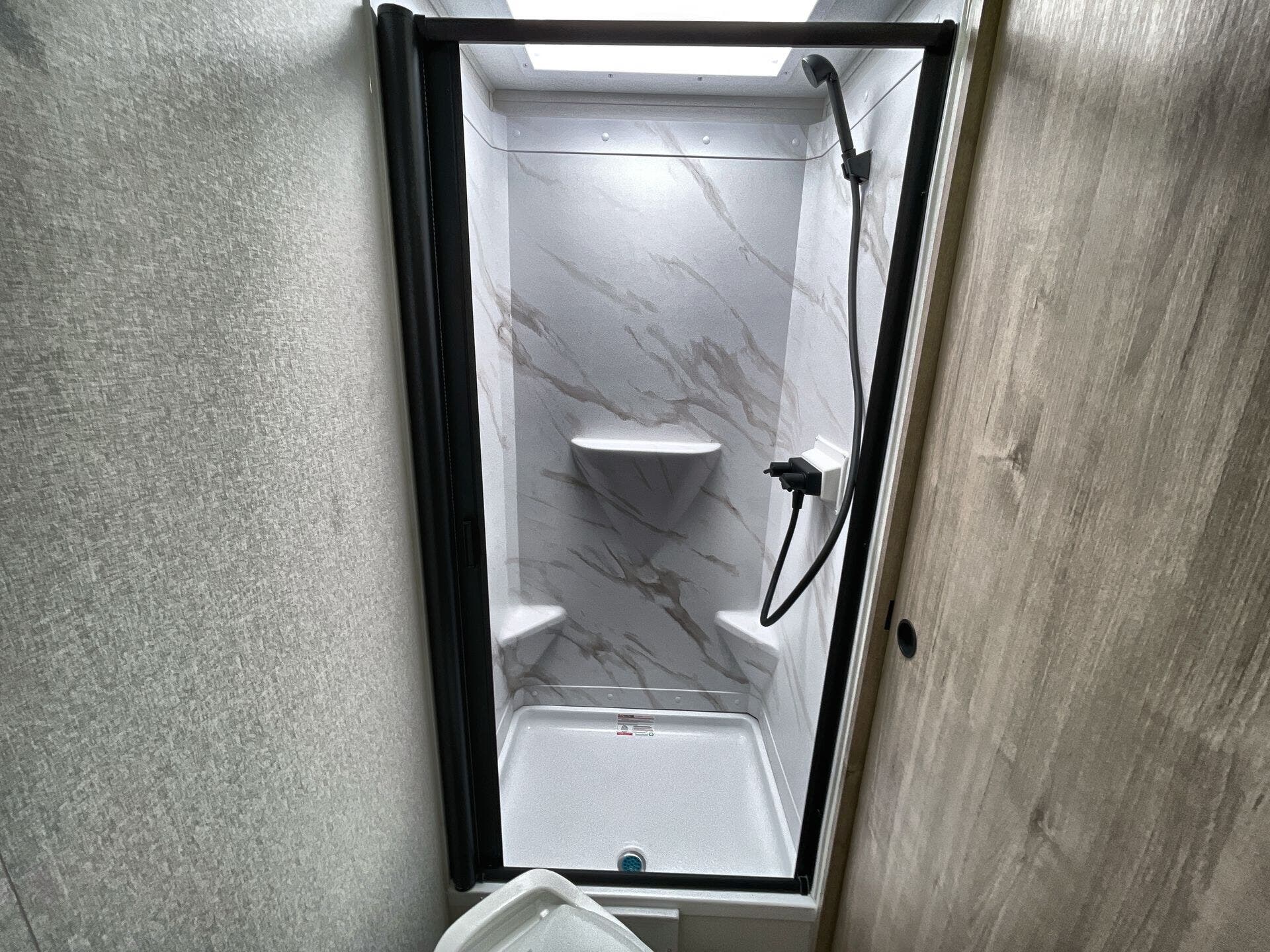 This travel trailer excels in efficiency and comfort. It features a well-equipped kitchen with both a microwave and a convection microwave for versatile cooking, a refrigerator to keep perishables fresh, and a dependable water heater for hot shows. The living area includes LED lighting, a dinette with a removable table, and a TV for easy entertainment. A dedicated shower keeps morning routines simple, while a queen bed and skylight add a touch of homey luxury. The enclosed underbelly provides additional protection against the elements, and the insulated construction helps maintain comfortable temperatures year-round.