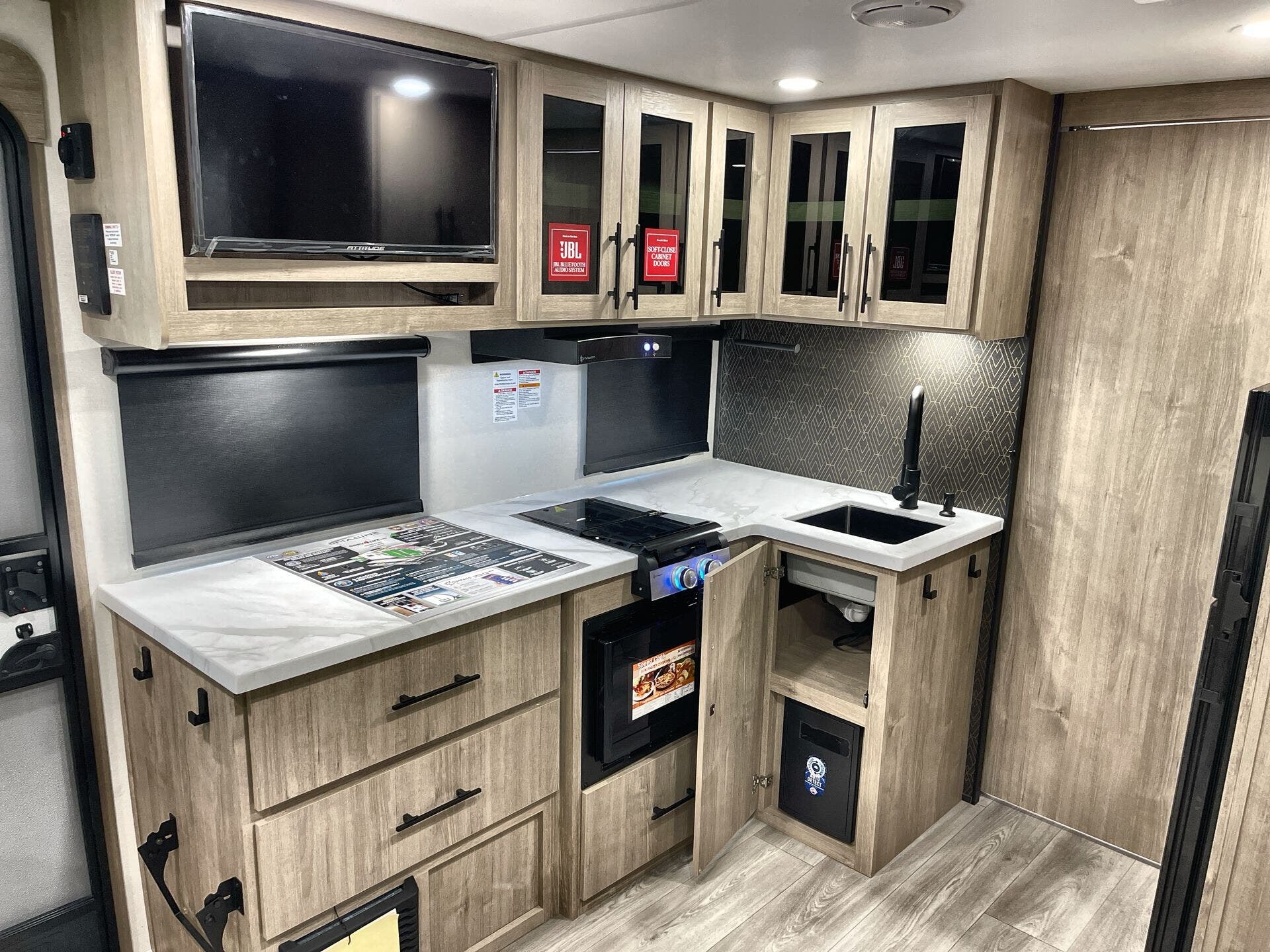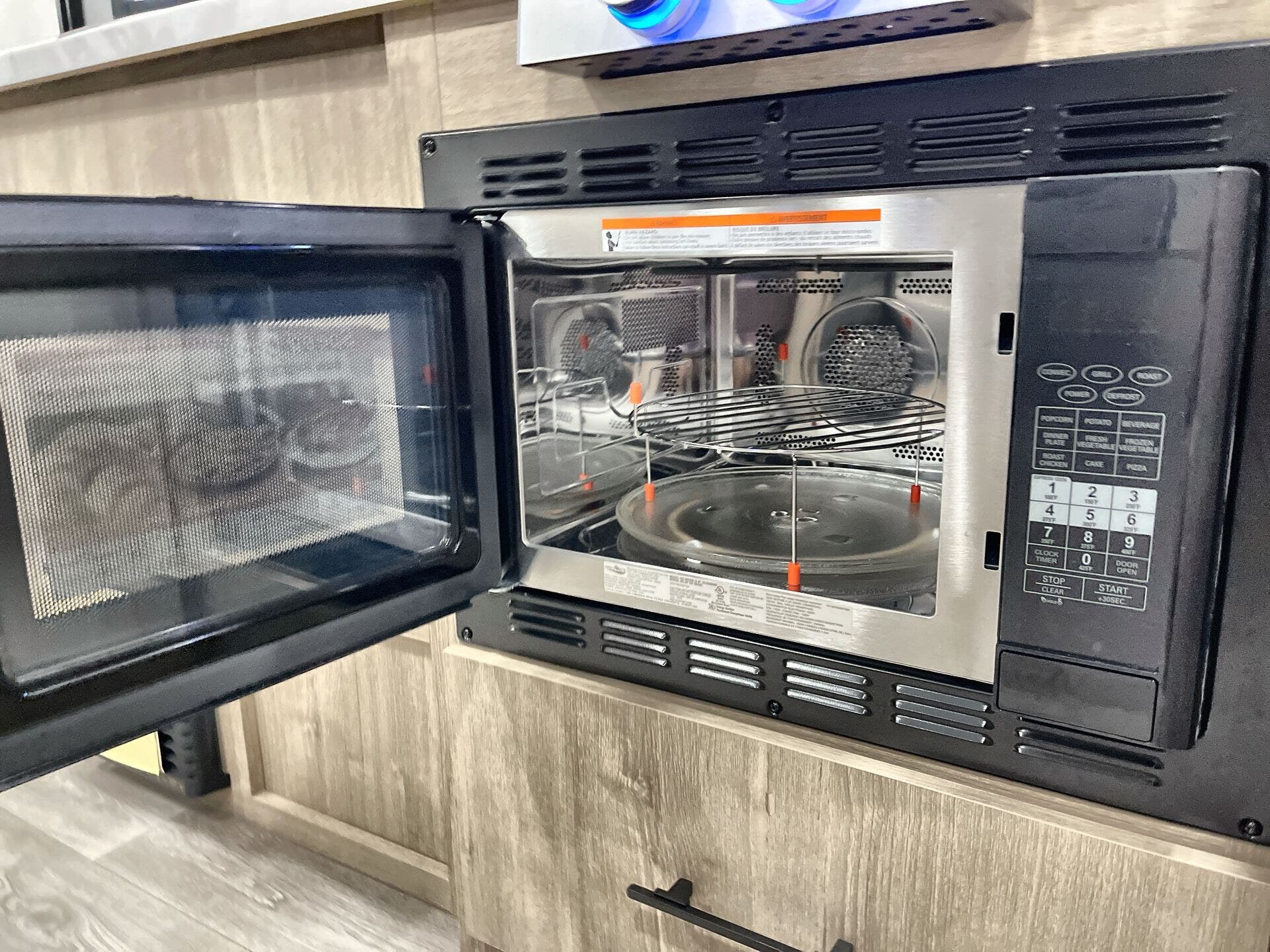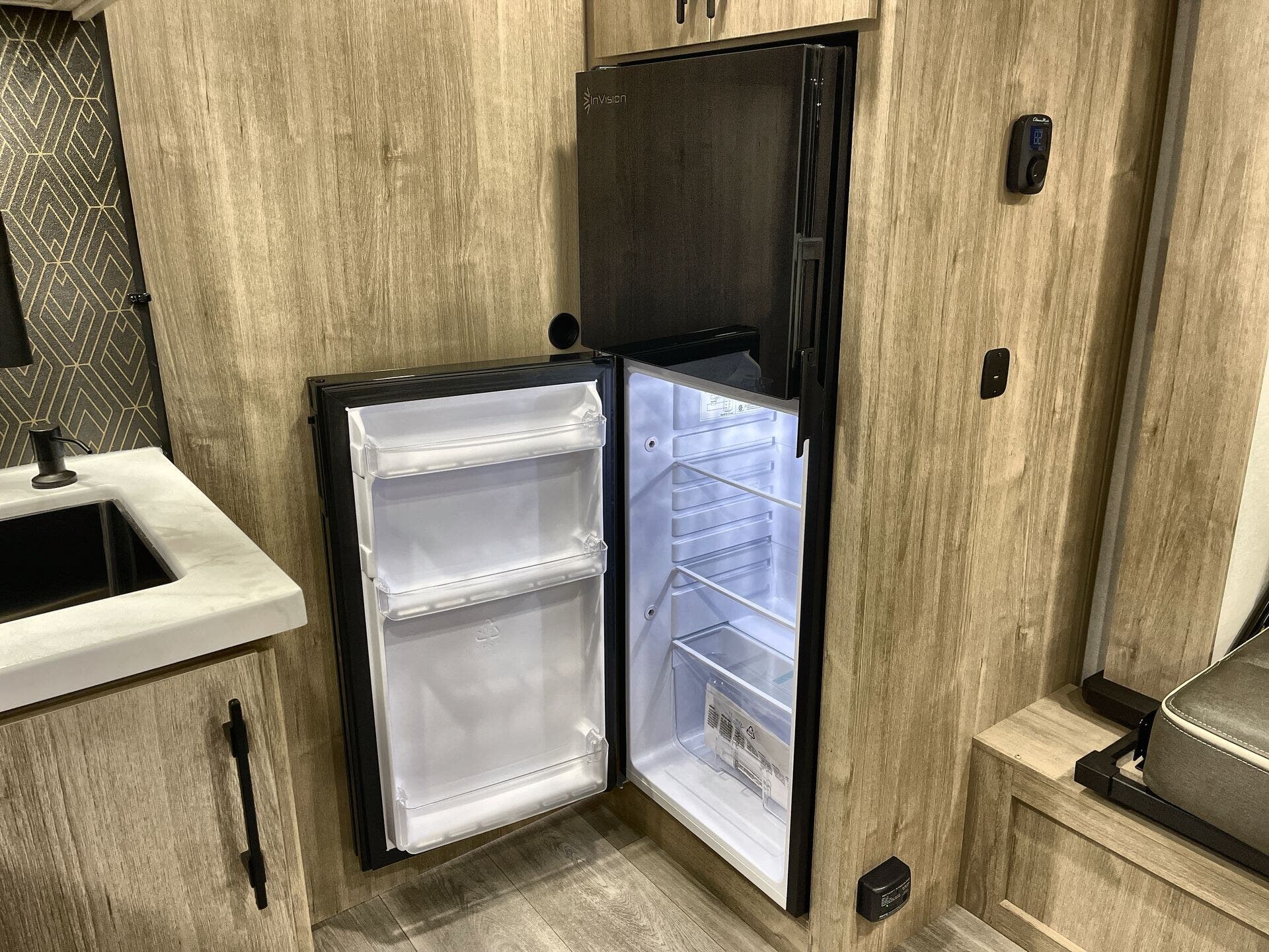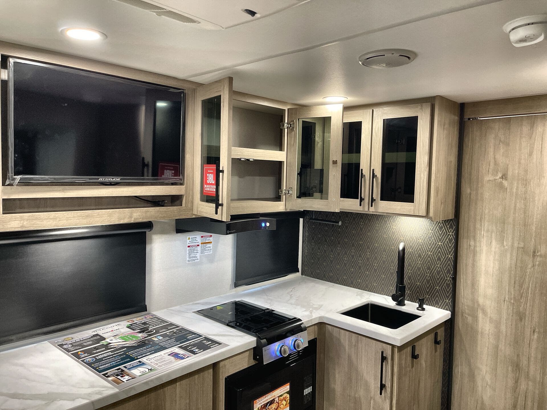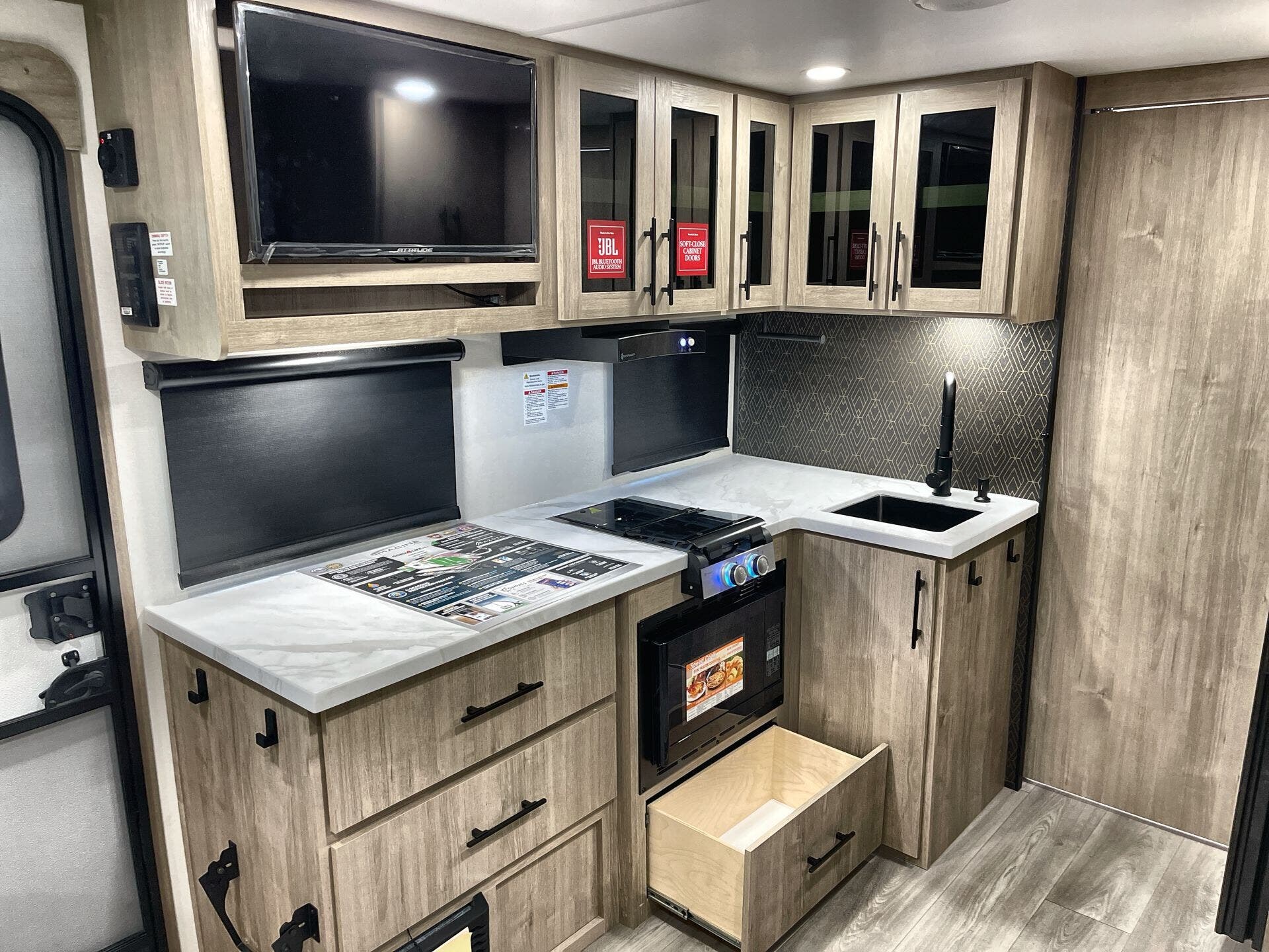 This travel trailer excels in efficiency and comfort. It features a well-equipped kitchen with both a microwave and a convection microwave for versatile cooking, a refrigerator to keep perishables fresh, and a dependable water heater for hot shows. The living area includes LED lighting, a dinette with a removable table, and a TV for easy entertainment. A dedicated shower keeps morning routines simple, while a queen bed and skylight add a touch of homey luxury. The enclosed underbelly provides additional protection against the elements, and the insulated construction helps maintain comfortable temperatures year-round.