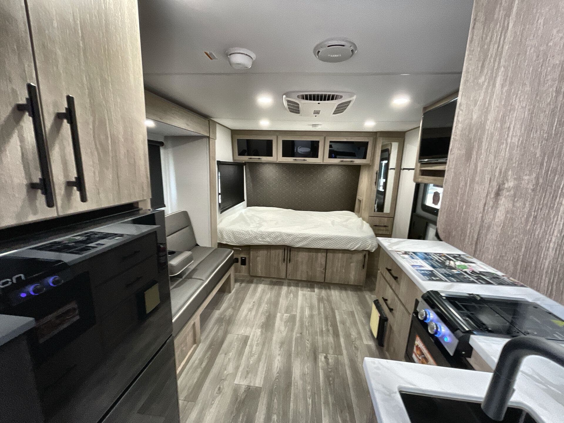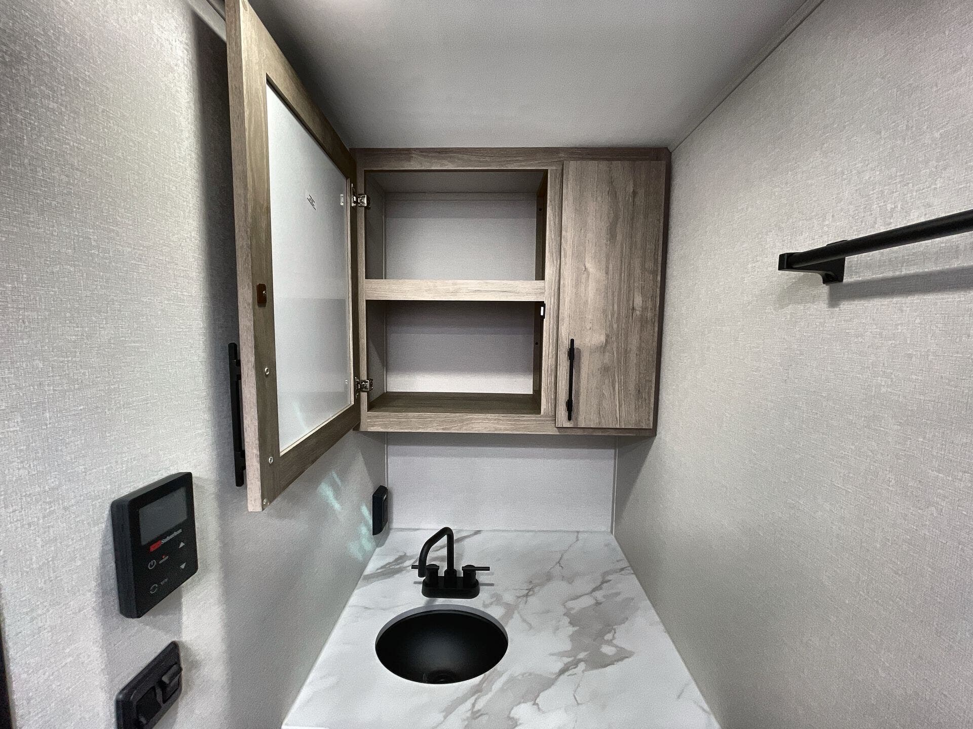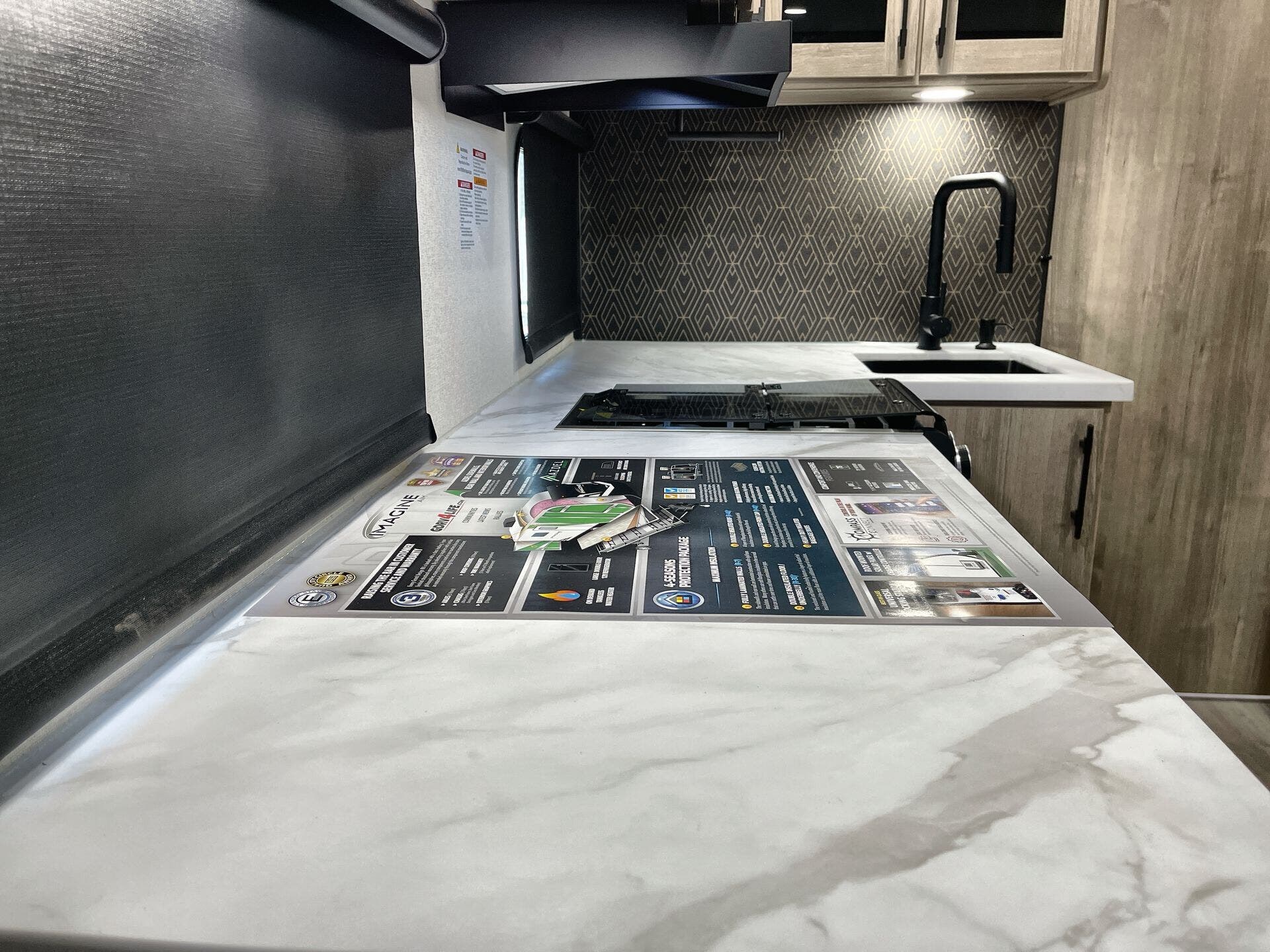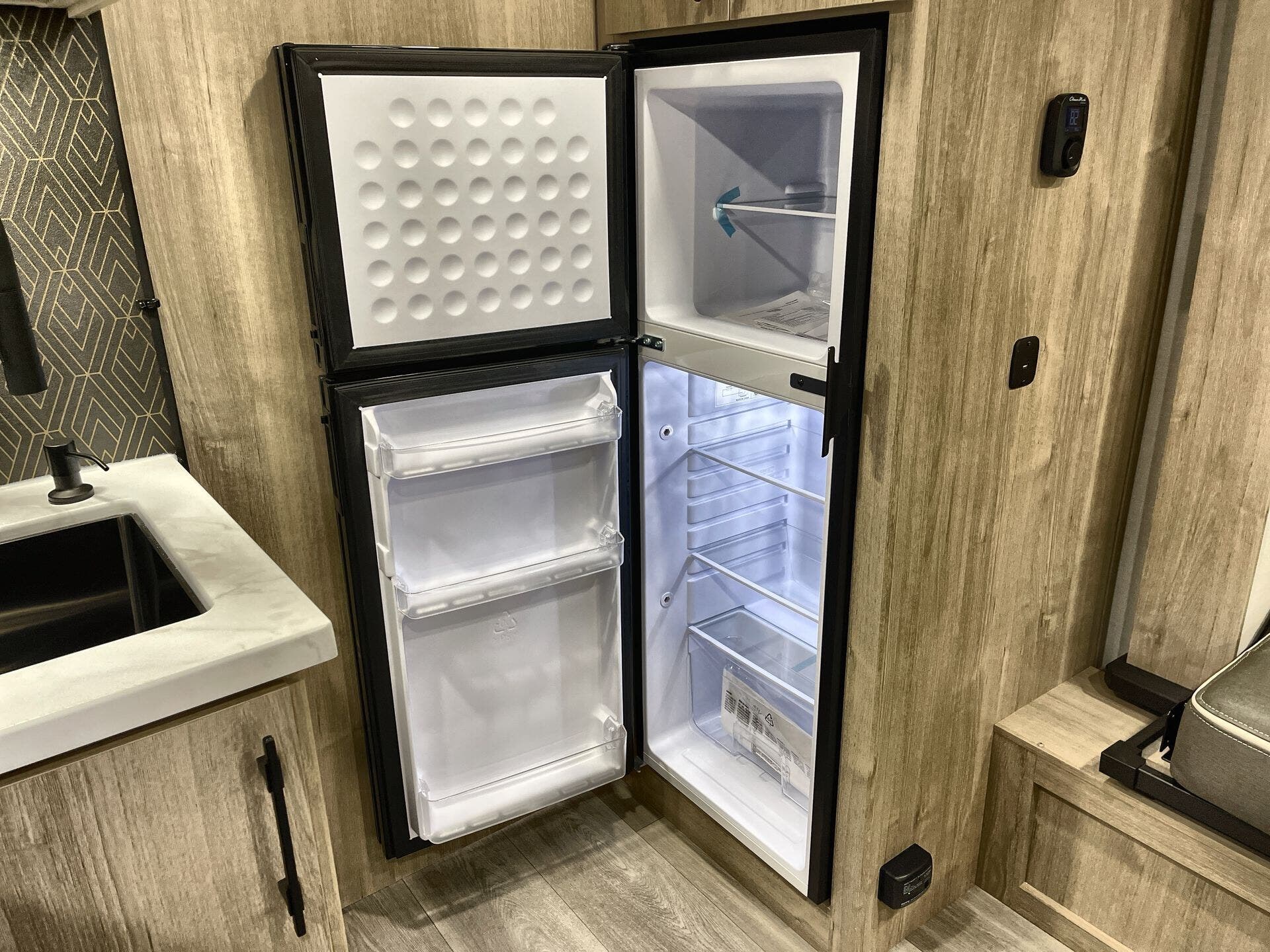 This travel trailer excels in efficiency and comfort. It features a well-equipped kitchen with both a microwave and a convection microwave for versatile cooking, a refrigerator to keep perishables fresh, and a dependable water heater for hot shows. The living area includes LED lighting, a dinette with a removable table, and a TV for easy entertainment. A dedicated shower keeps morning routines simple, while a queen bed and skylight add a touch of homey luxury. The enclosed underbelly provides additional protection against the elements, and the insulated construction helps maintain comfortable temperatures year-round.
