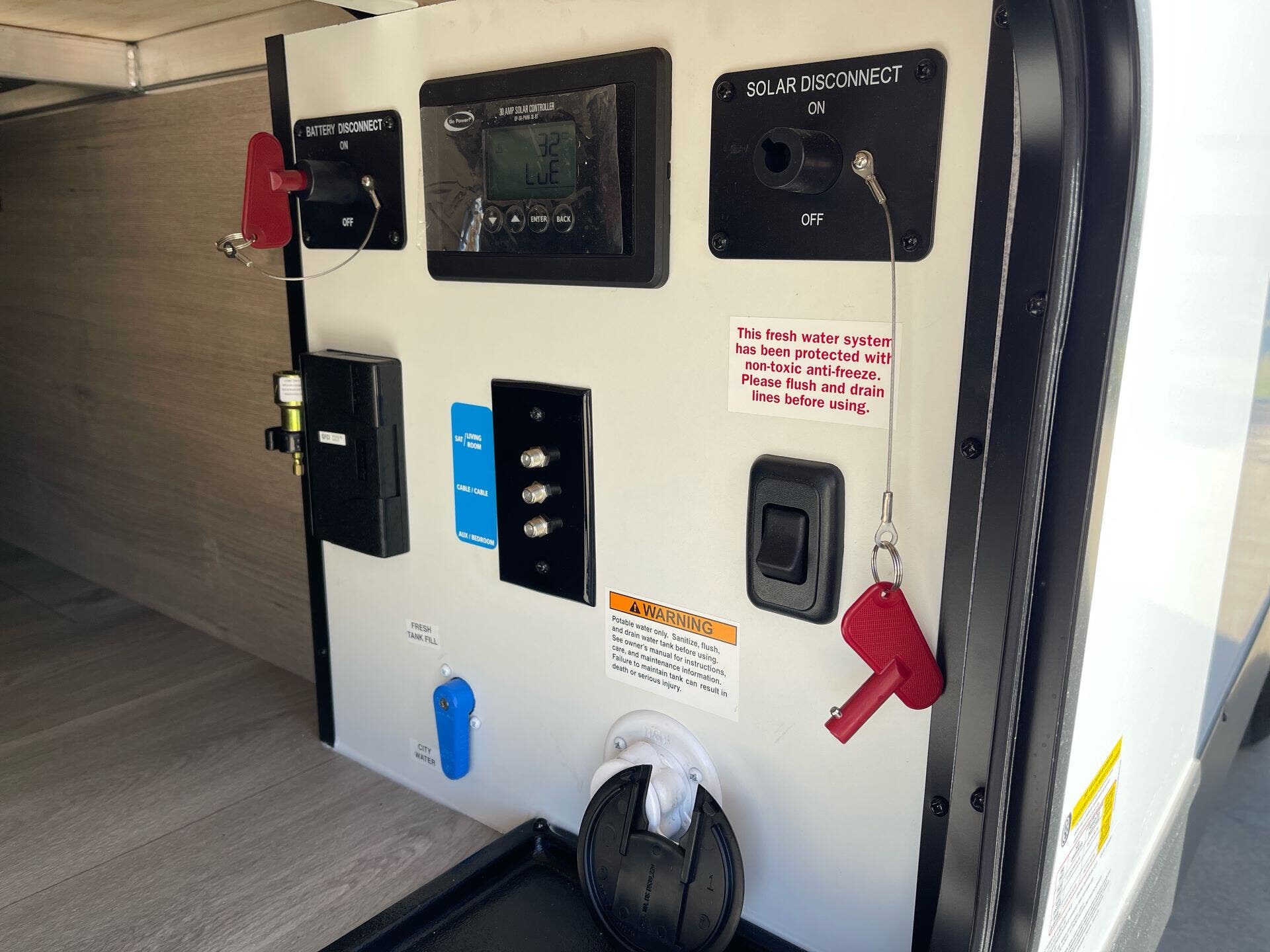 - Power and hookups: 30 Amp service; detachable power cord; solar panel