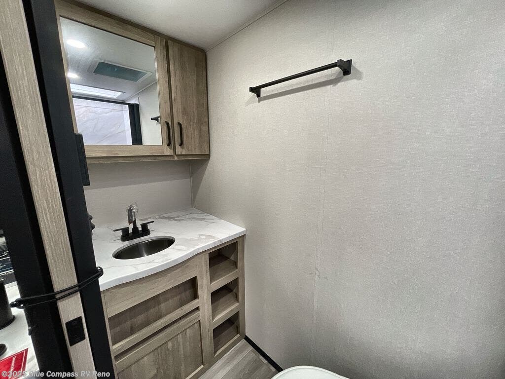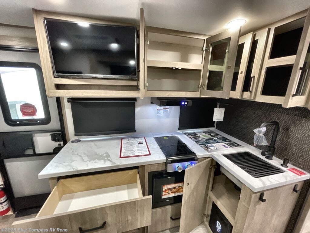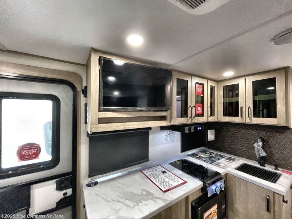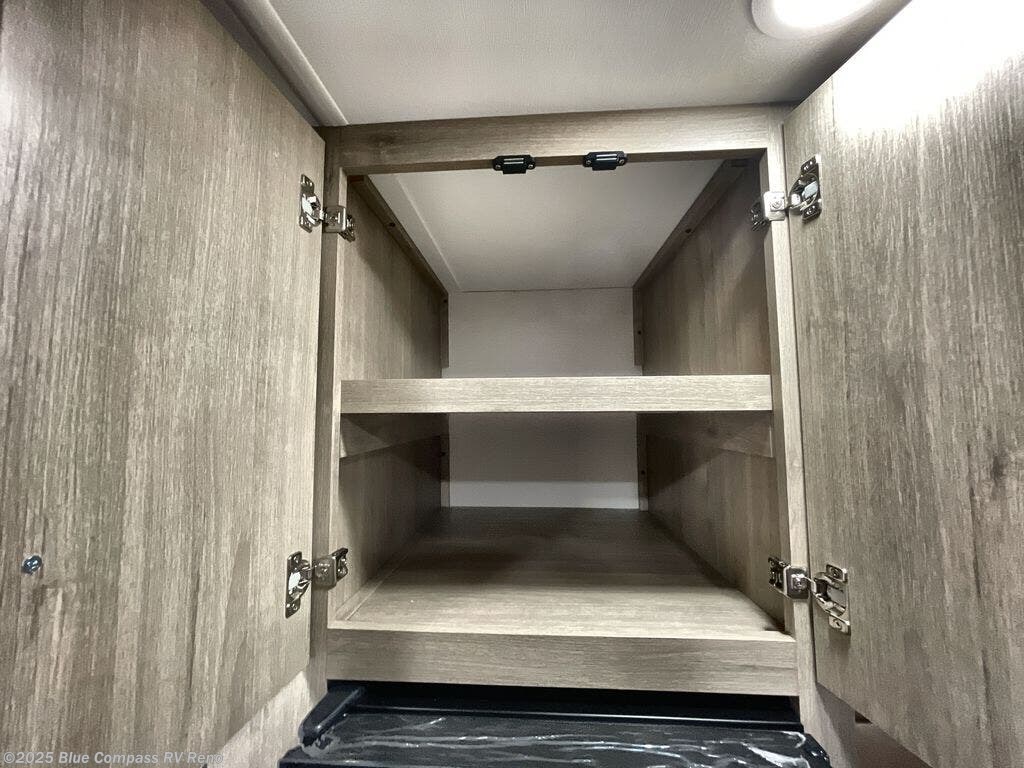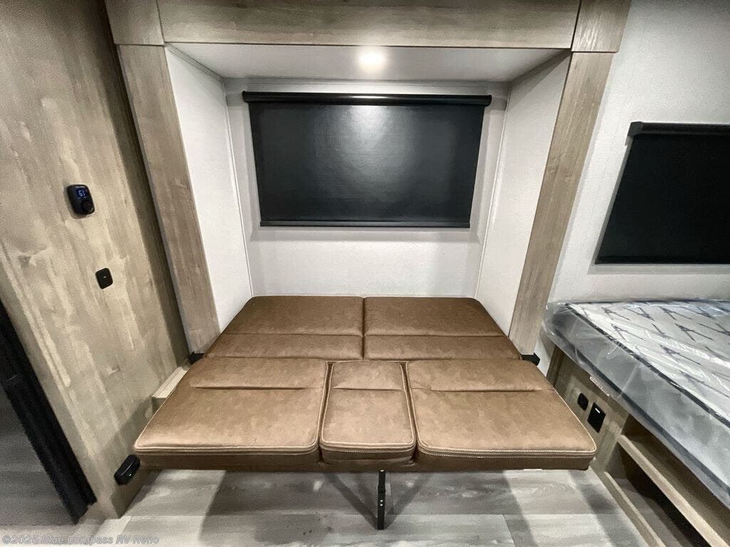 Pack your bags and head out on a fun camping trip in this travel trailer! The front queen bed offers a comfortable place to sleep at night, as well as the roll-over sleeper sofa slide with shoe storage. You can make meals on the cooktop or in the convection microwave. The full rear bathroom has a walk-in shower with an oversized vanity to easily get ready each day. Outside, you'll find a spray port, an unobstructed pass-thru storage, and an interior/exterior table to use at your convenience.